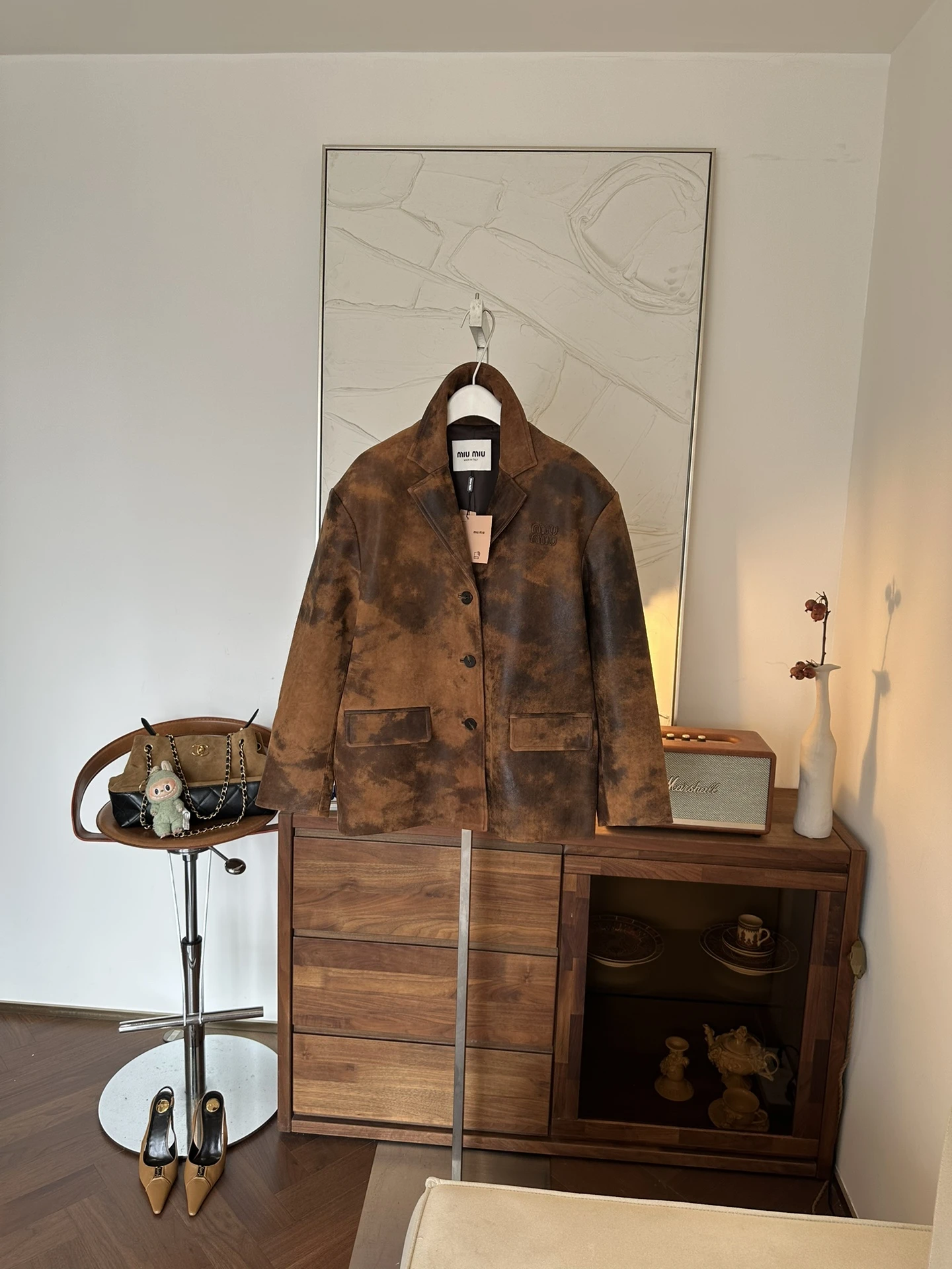 Женский кожаный жакет от Miu Miu выполнен из высококачественной овчины, что придаёт ему роскошный и стильный вид. Жакет отличается уникальной текстурой и насыщенным коричневым оттенком, который добавляет изделию винтажный шарм.
