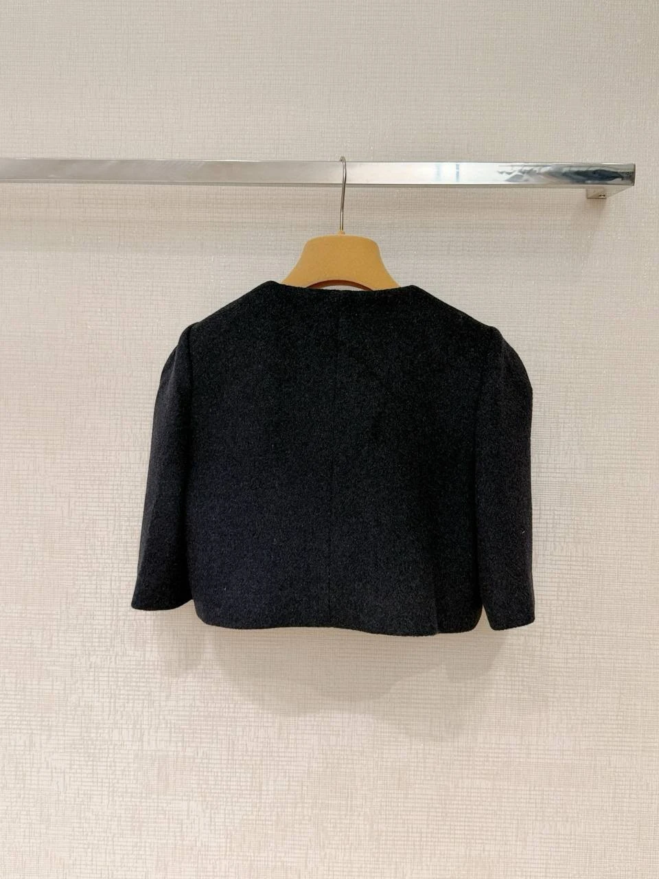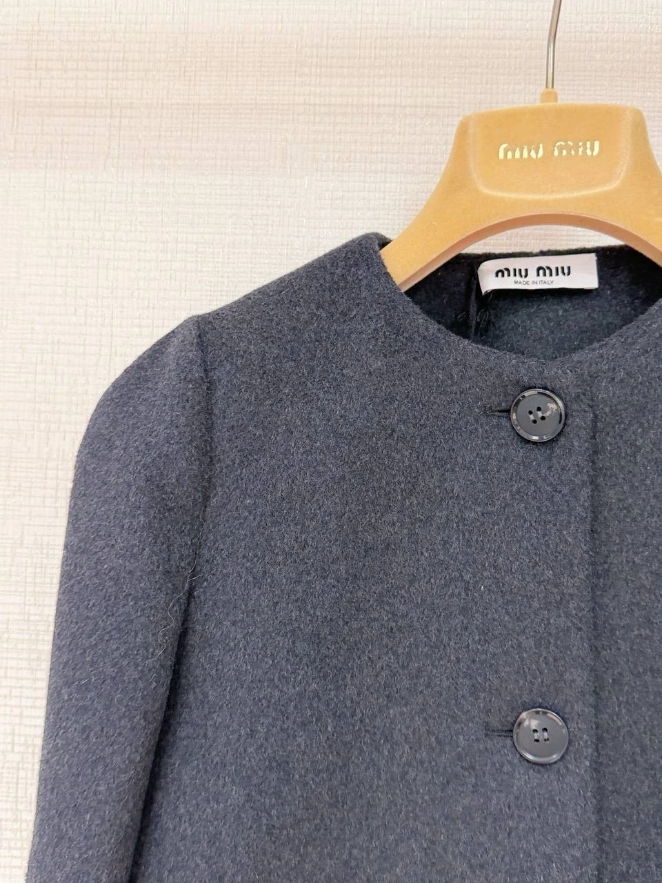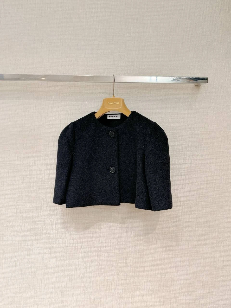 Женский укороченный жакет MIU MIU — изящный элегантный акцент в гардеробе, сочетающий чистые линии и характерный минимализм бренда. Жакет — эффектная, но сдержанная вещь для тех, кто ценит изящный силуэт и аккуратную детализацию в премиальном исполнении.