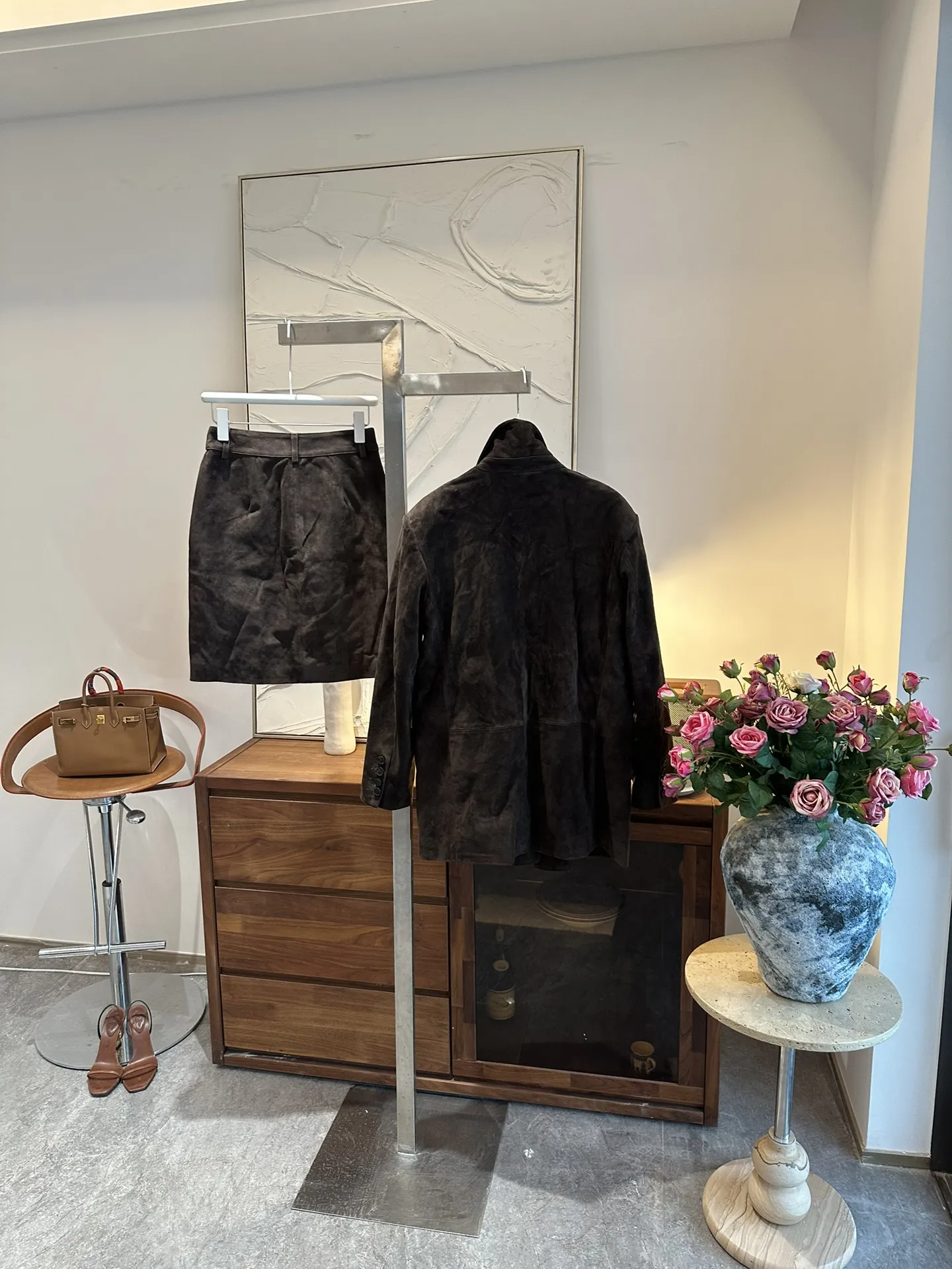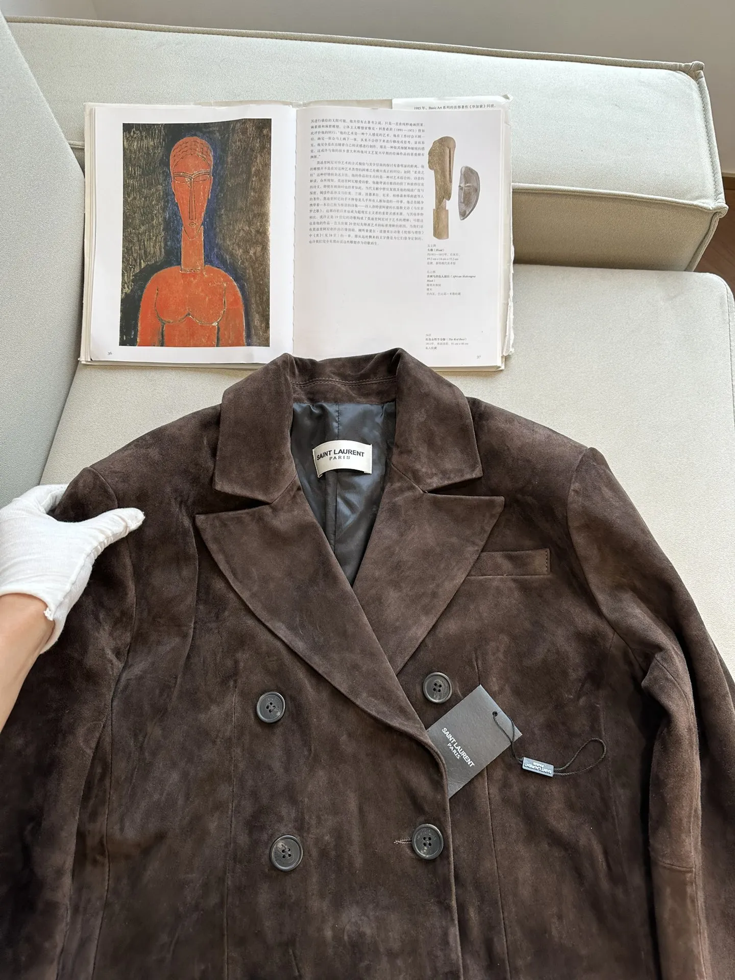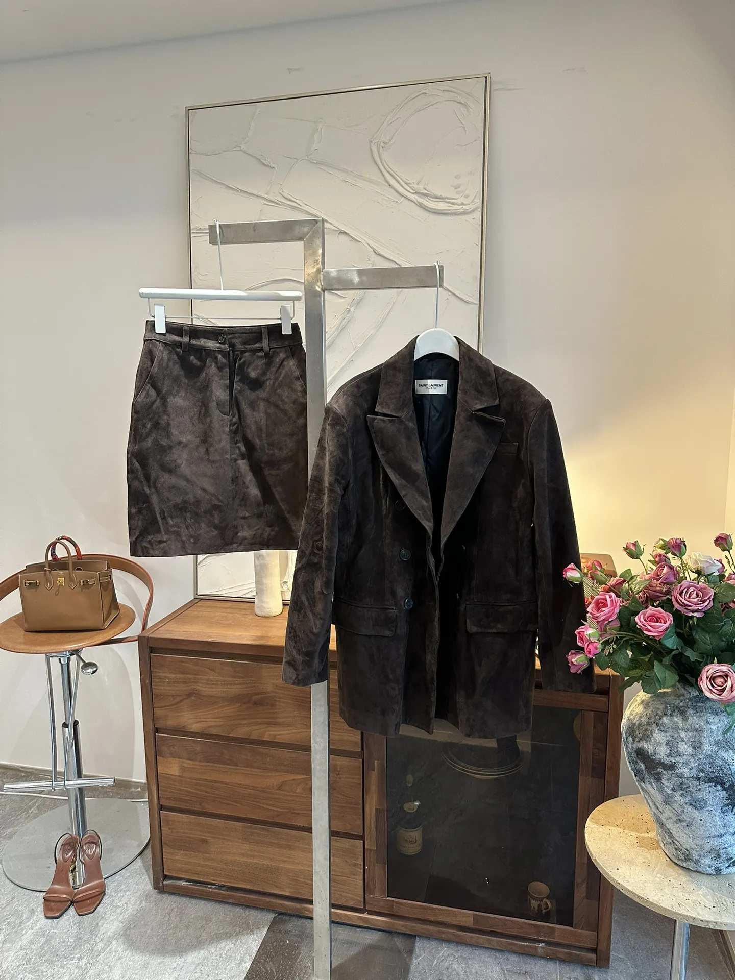 Элегантный женский костюм от Yves Saint Laurent (YSL) выполнен из высококачественной козьей замши, что придаёт ему роскошный и утончённый вид. Комплект состоит из классического пиджака и юбки, которые идеально сочетаются друг с другом, создавая стильный и современный образ.