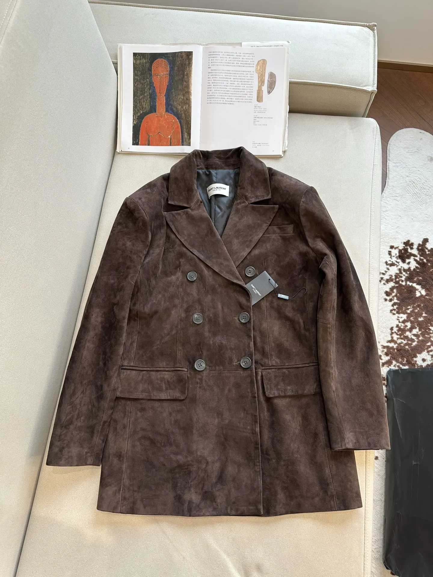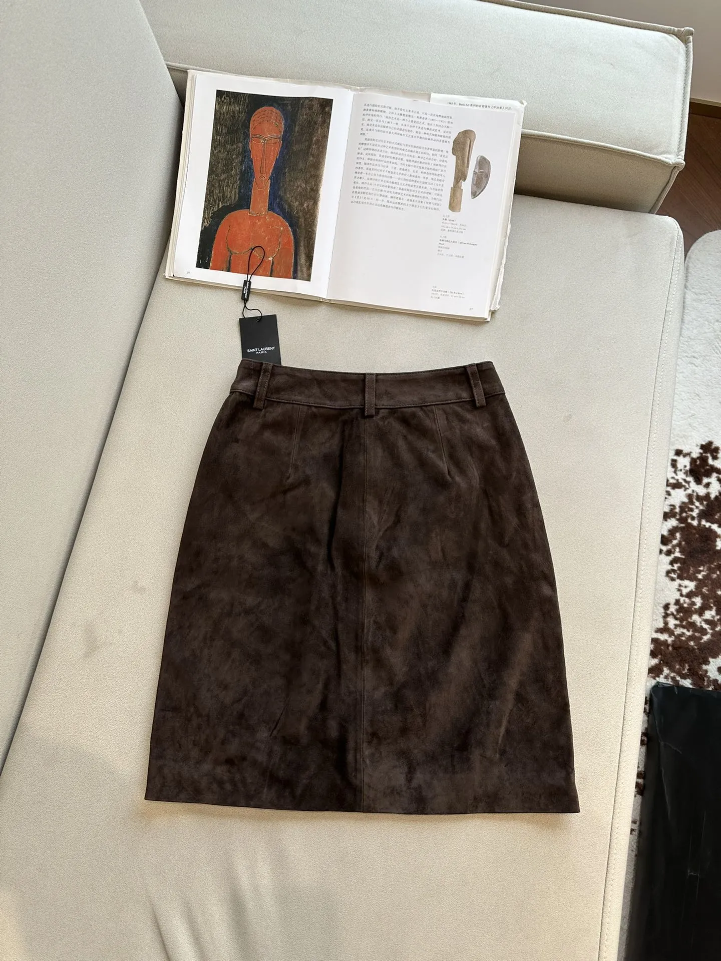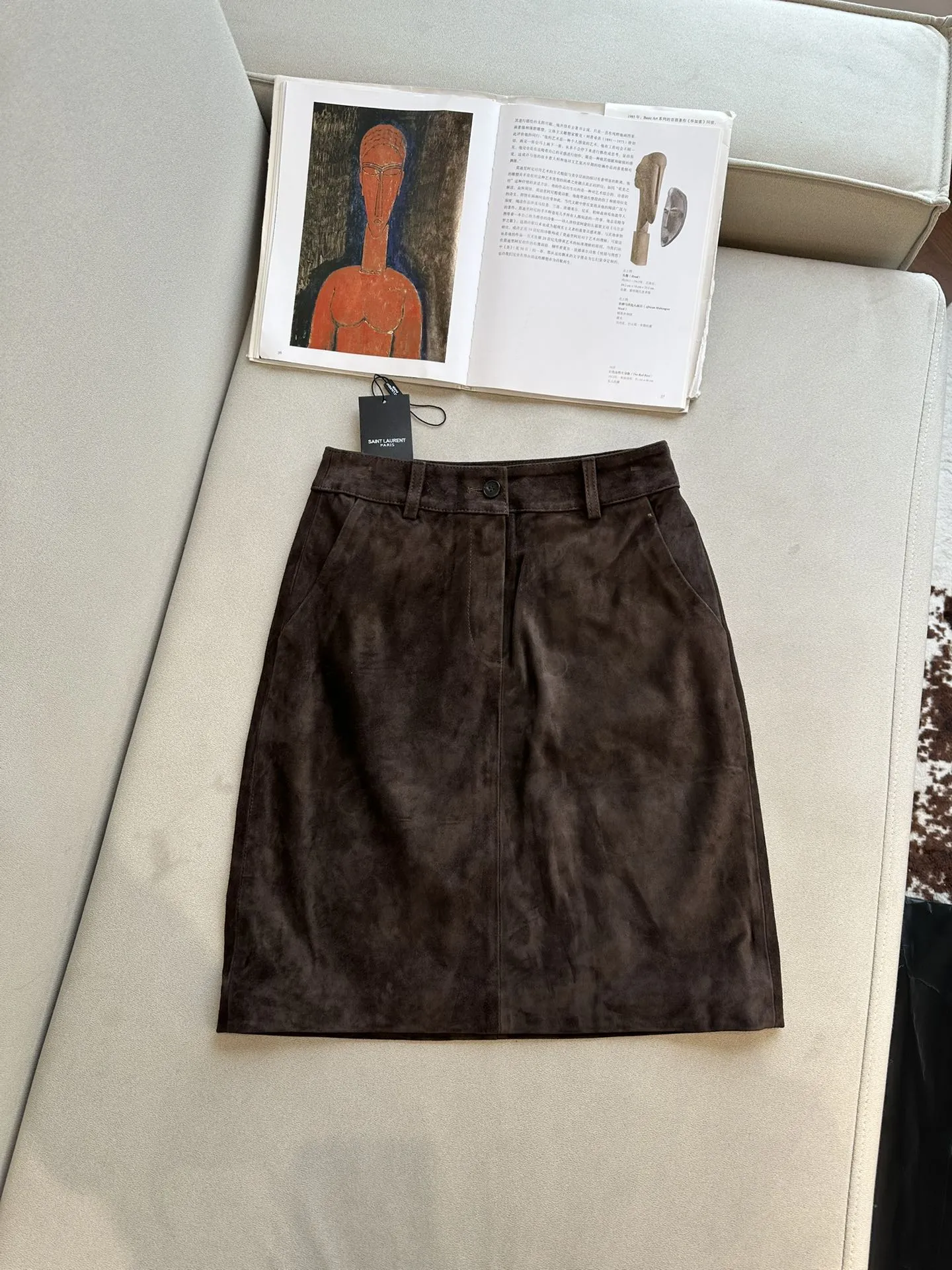 Элегантный женский костюм от Yves Saint Laurent (YSL) выполнен из высококачественной козьей замши, что придаёт ему роскошный и утончённый вид. Комплект состоит из классического пиджака и юбки, которые идеально сочетаются друг с другом, создавая стильный и современный образ.