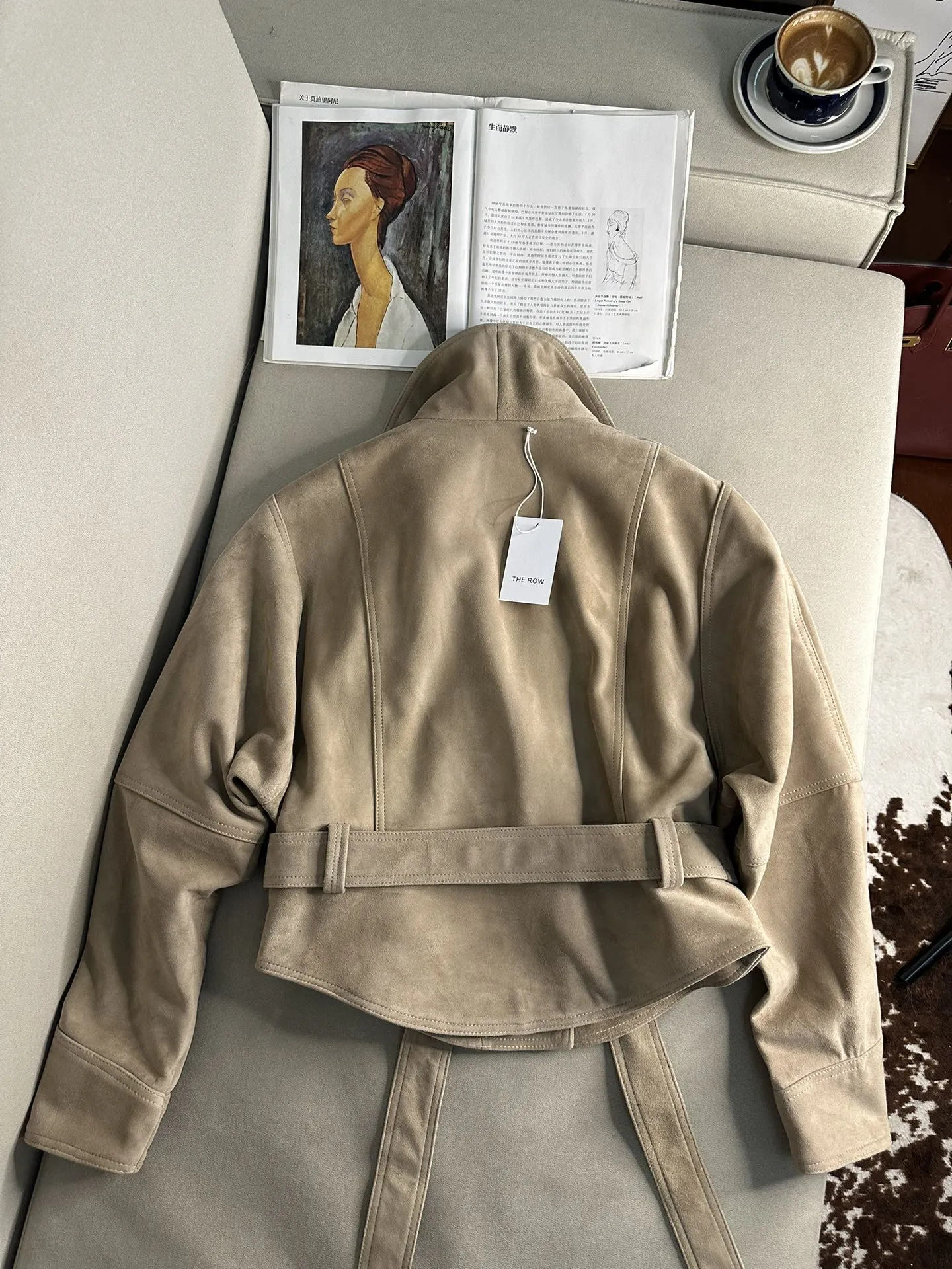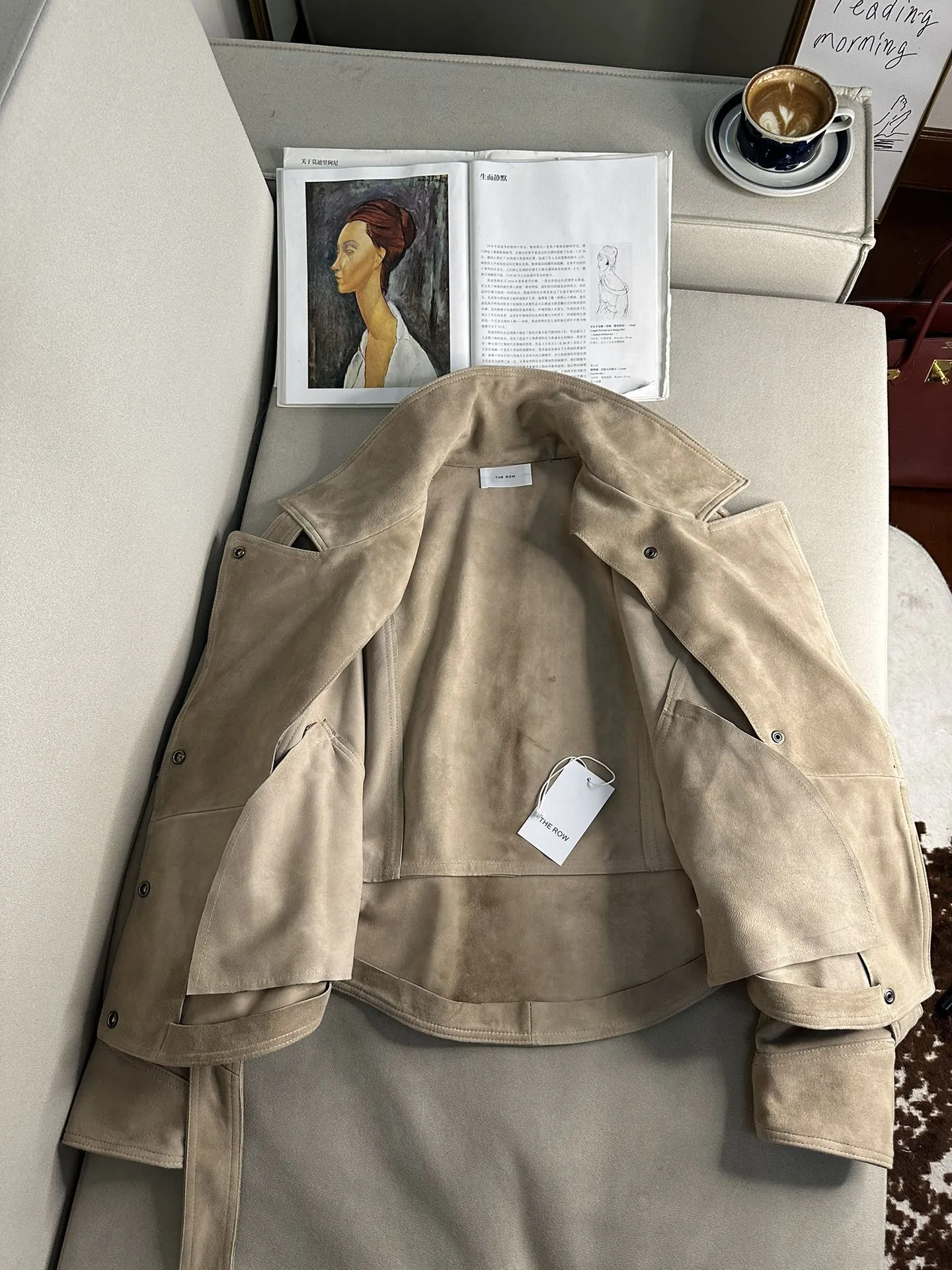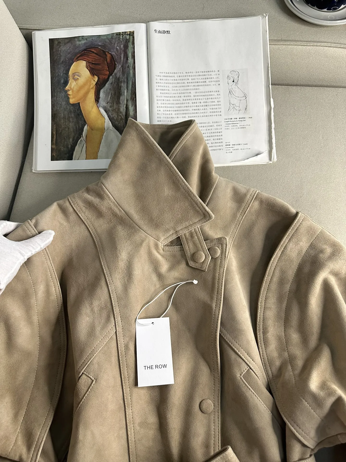 Женский жакет от The Row, выполненный из роскошной козьей замши, воплощает минимализм и утонченность, характерные для бренда.