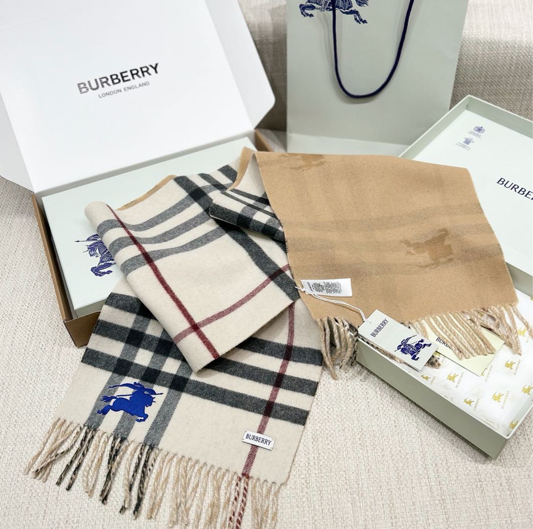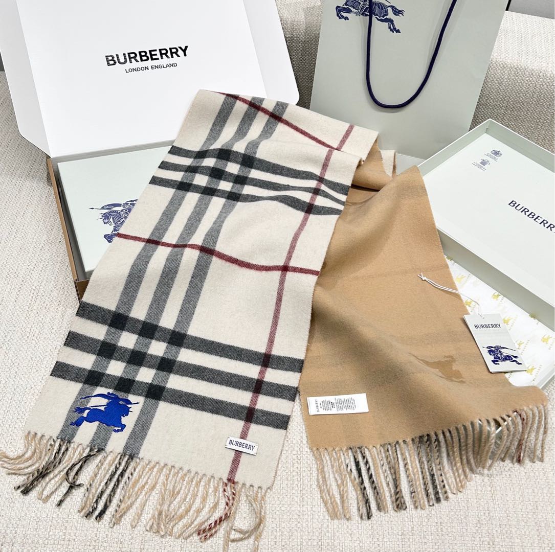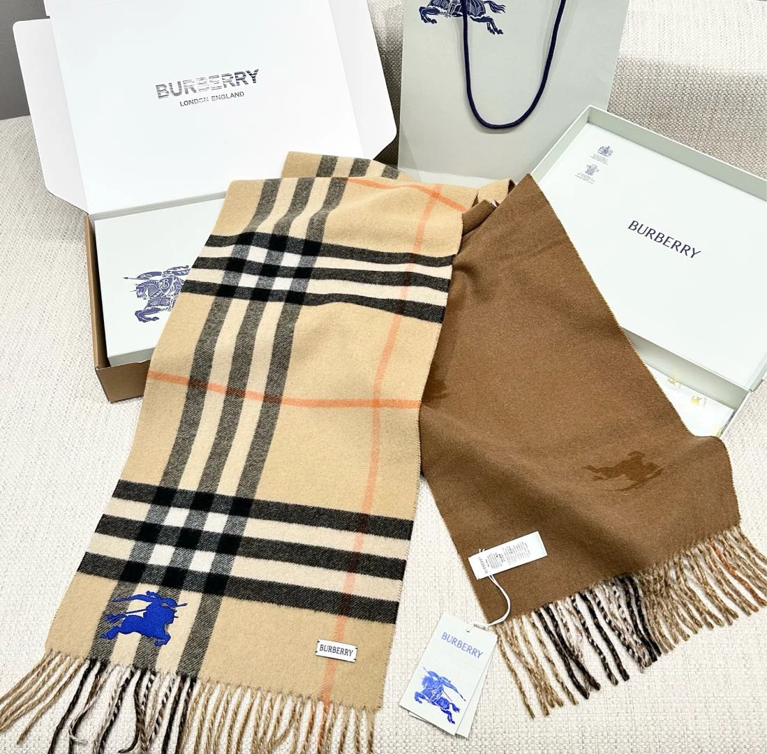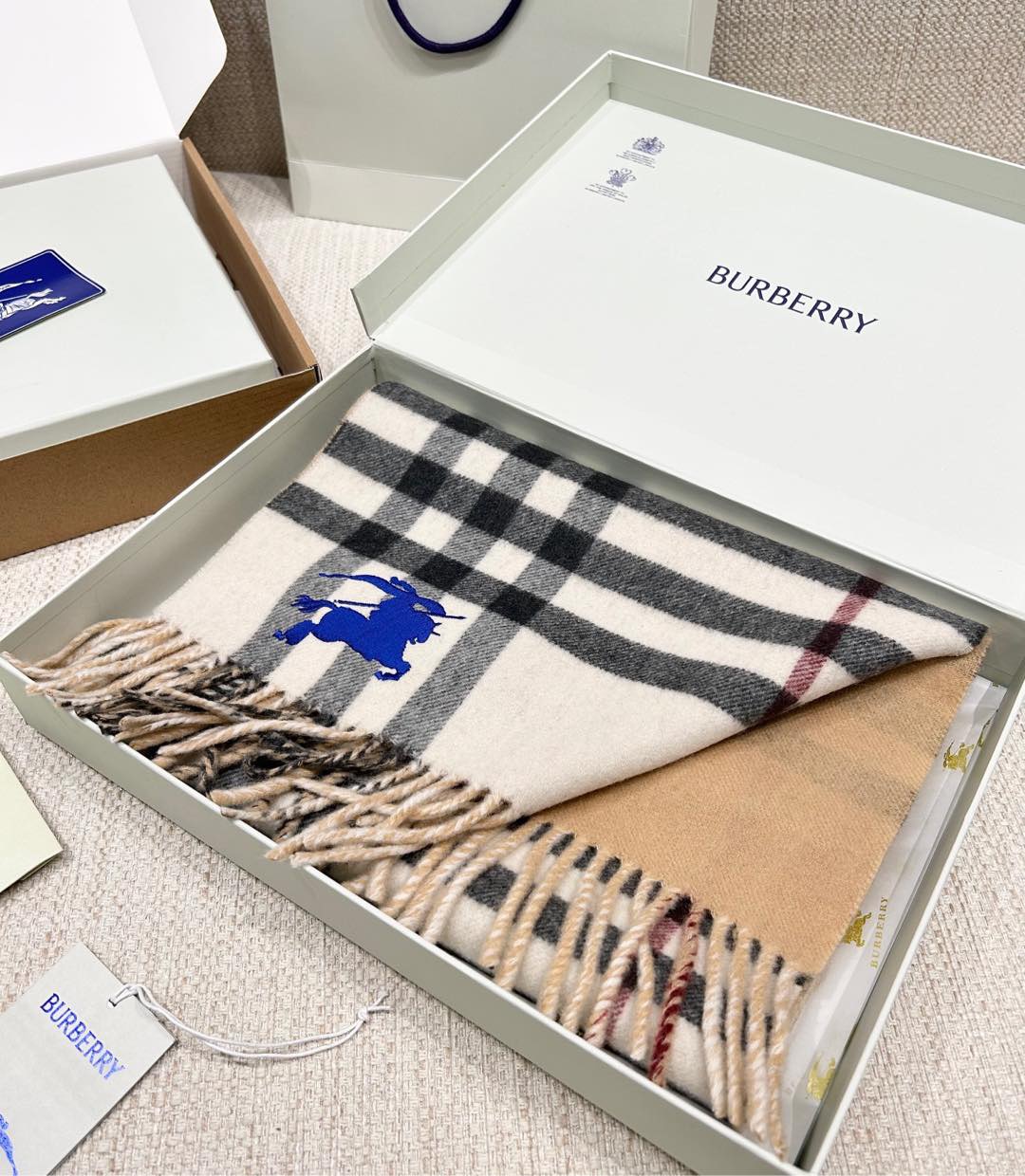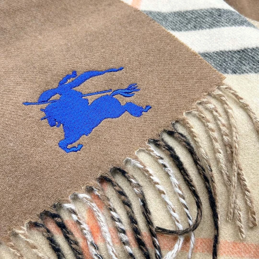 • Отделка: аккуратные кисточки по краям; сбоку — маленькая тканая бирка с логотипом Burberry и тонкая декоративная вышивка/эмблема в контрастном синем цвете, подчёркивающая премиальность изделия.