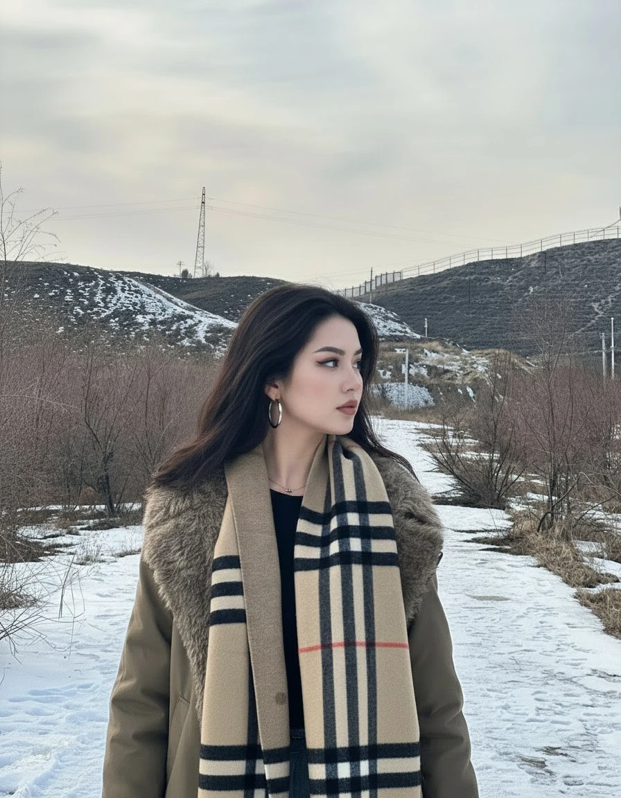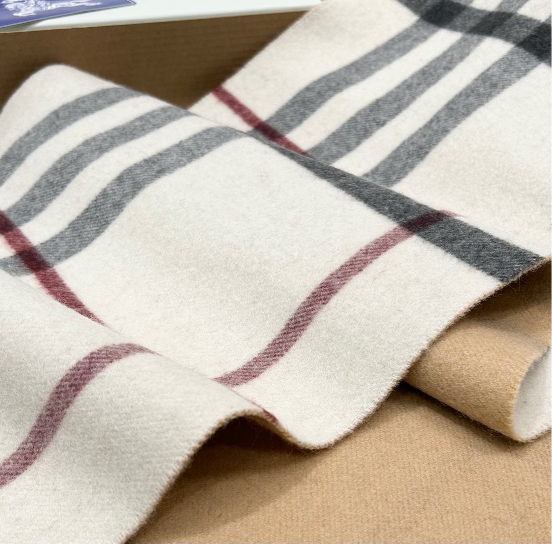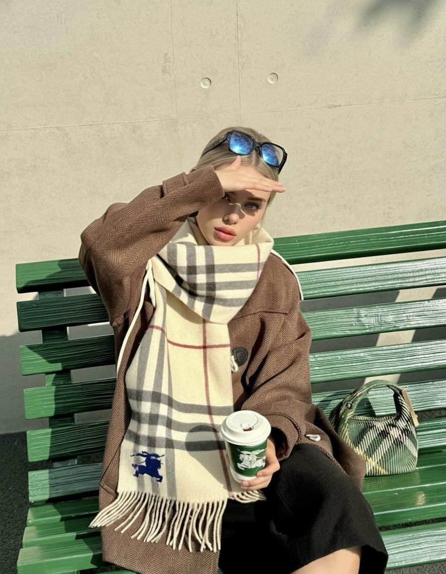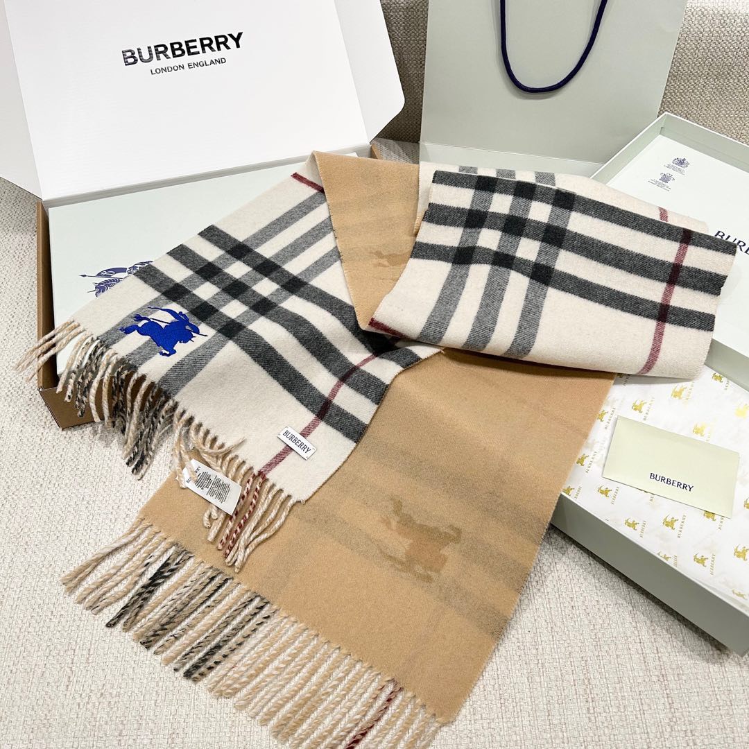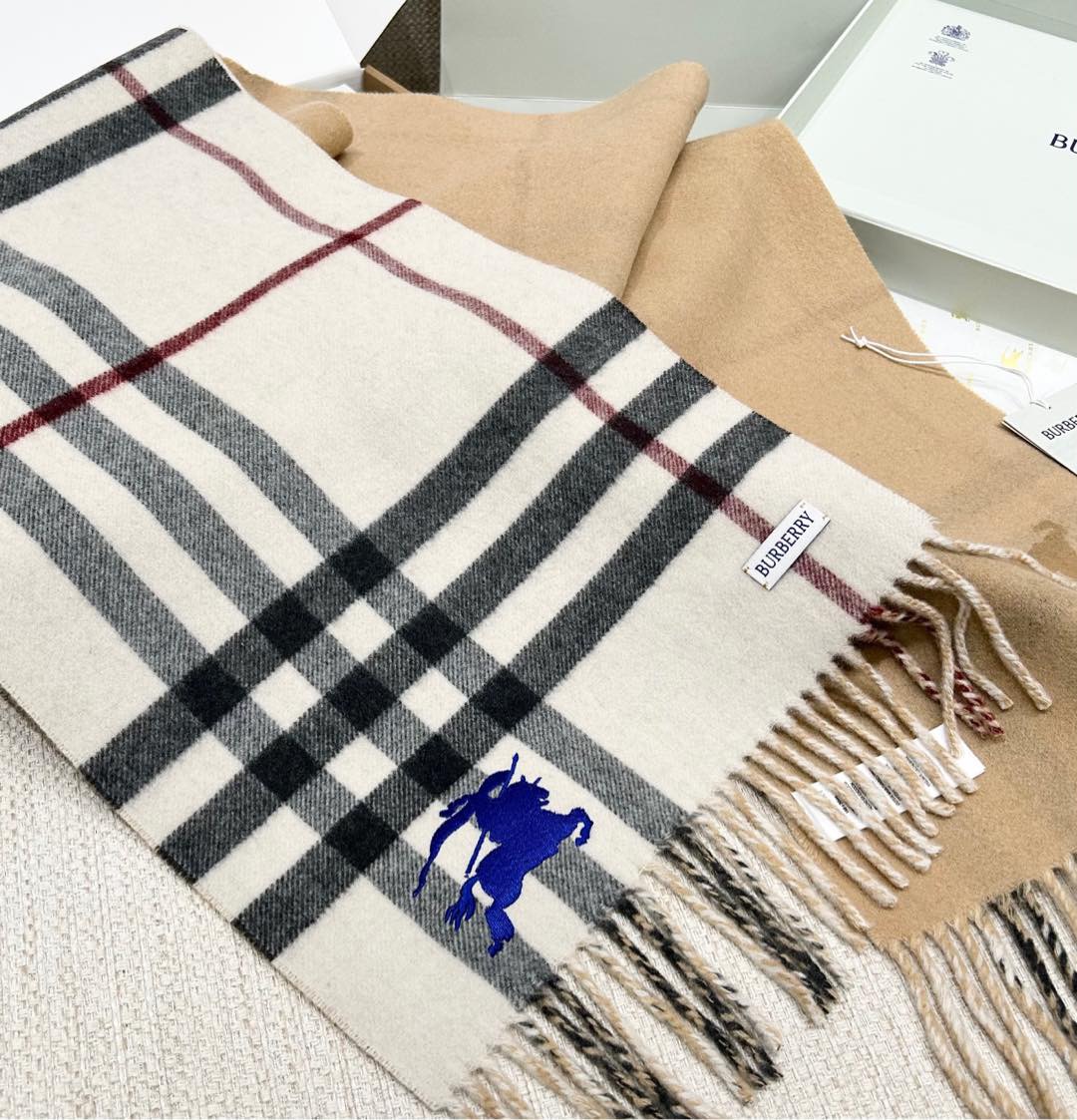 • Отделка: аккуратные кисточки по краям; сбоку — маленькая тканая бирка с логотипом Burberry и тонкая декоративная вышивка/эмблема в контрастном синем цвете, подчёркивающая премиальность изделия.