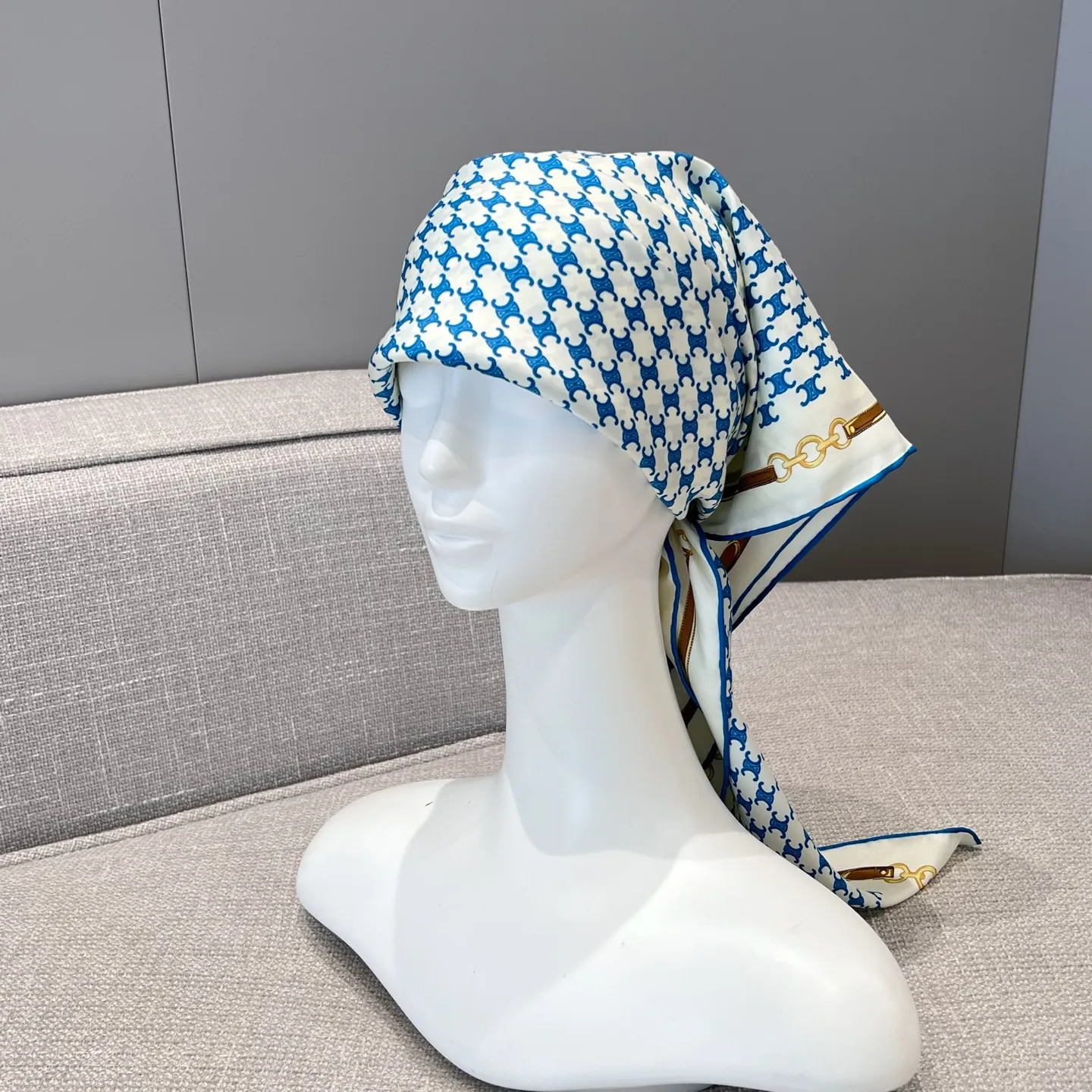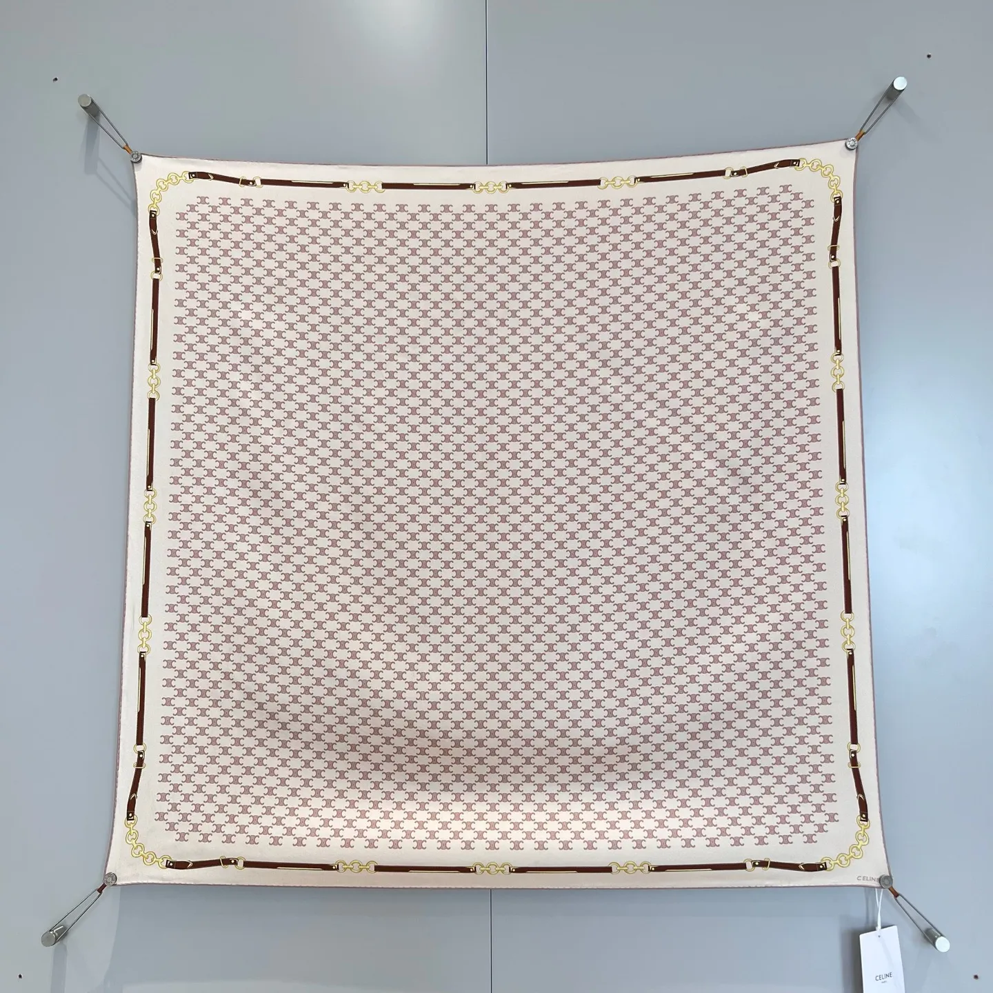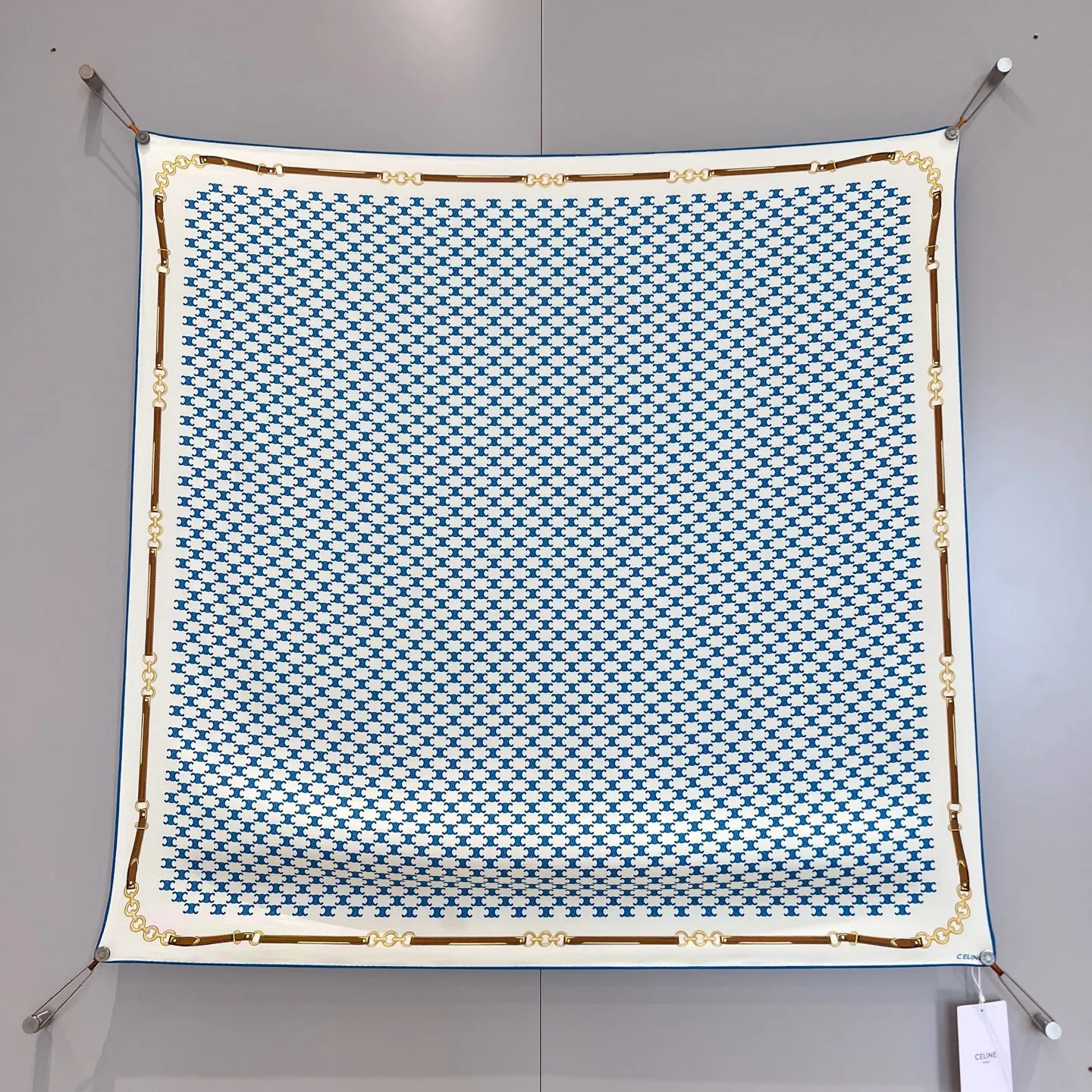Дизайн платка украшен утончённым геометрическим орнаментом, обрамлённым классической светлой каймой с золотистыми декоративными элементами. Такой аксессуар станет ярким акцентом как в повседневных, так и в вечерних нарядах. Идеально подходит для ношения на шее, в волосах или украсит Вашу сумку.