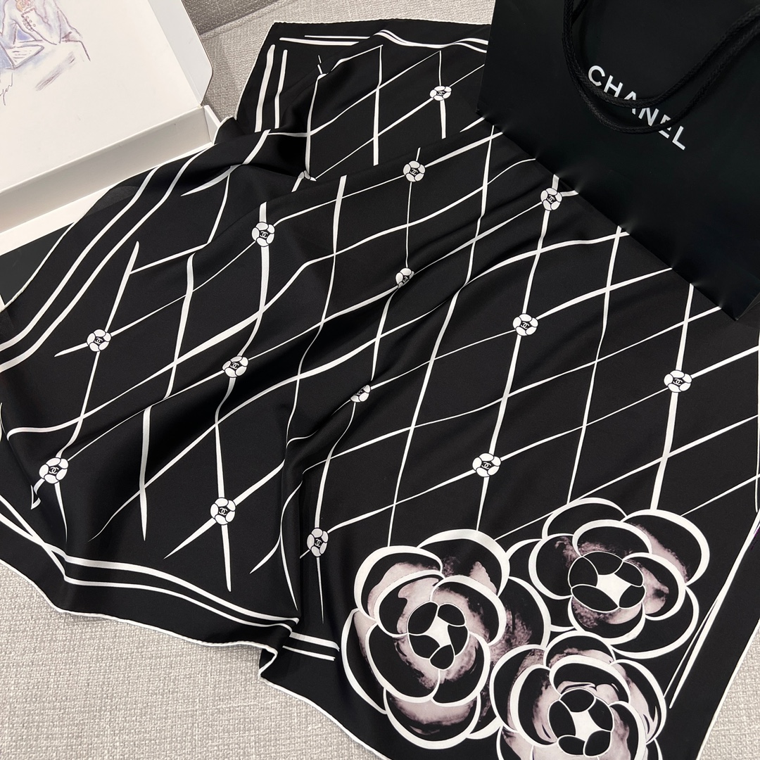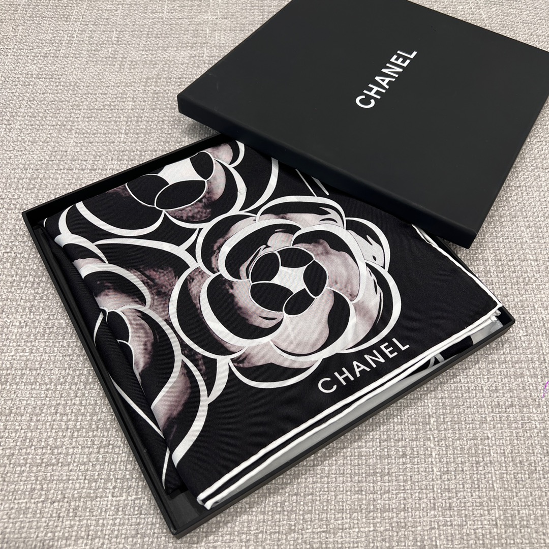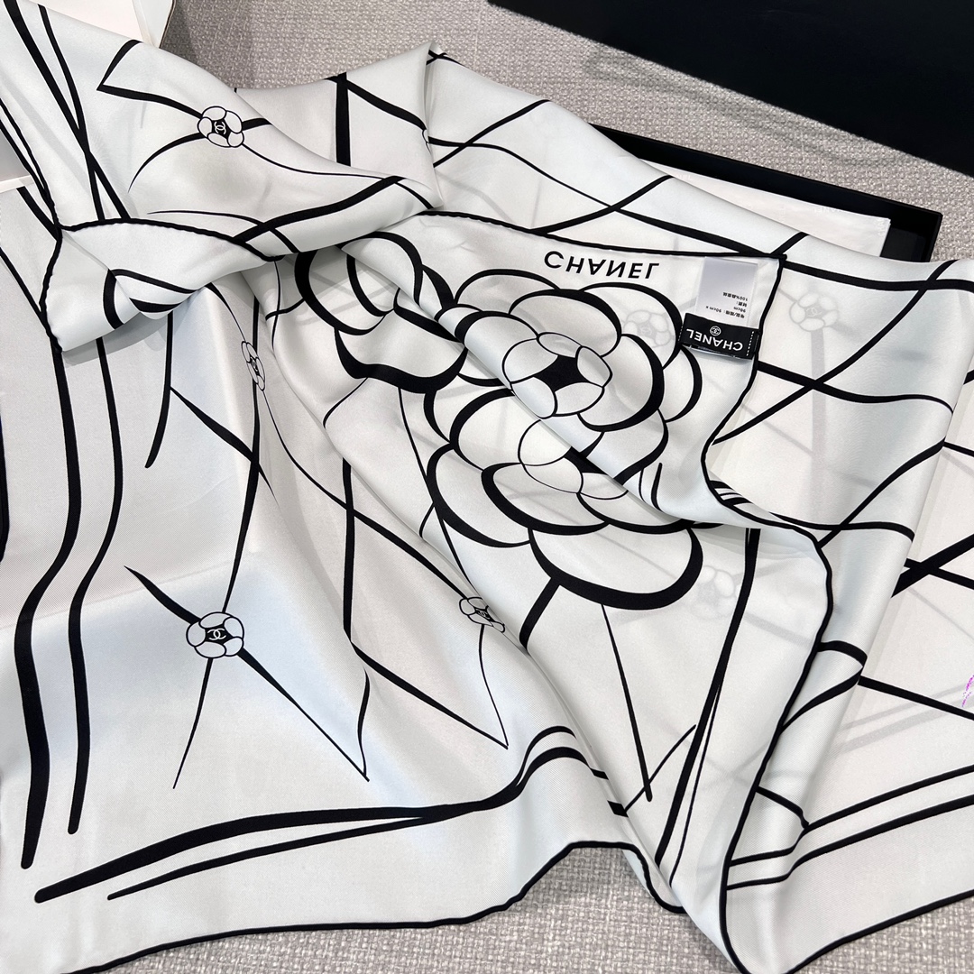 В одном из углов расположены три крупных стилизованных камелии, добавляющие акцент утончённости. В нижней части платка аккуратно размещён логотип CHANEL. Лёгкий, воздушный шёлк придаёт платку изысканный блеск и роскошную мягкость, делая его идеальным аксессуаром для создания утончённых и женственных образов.