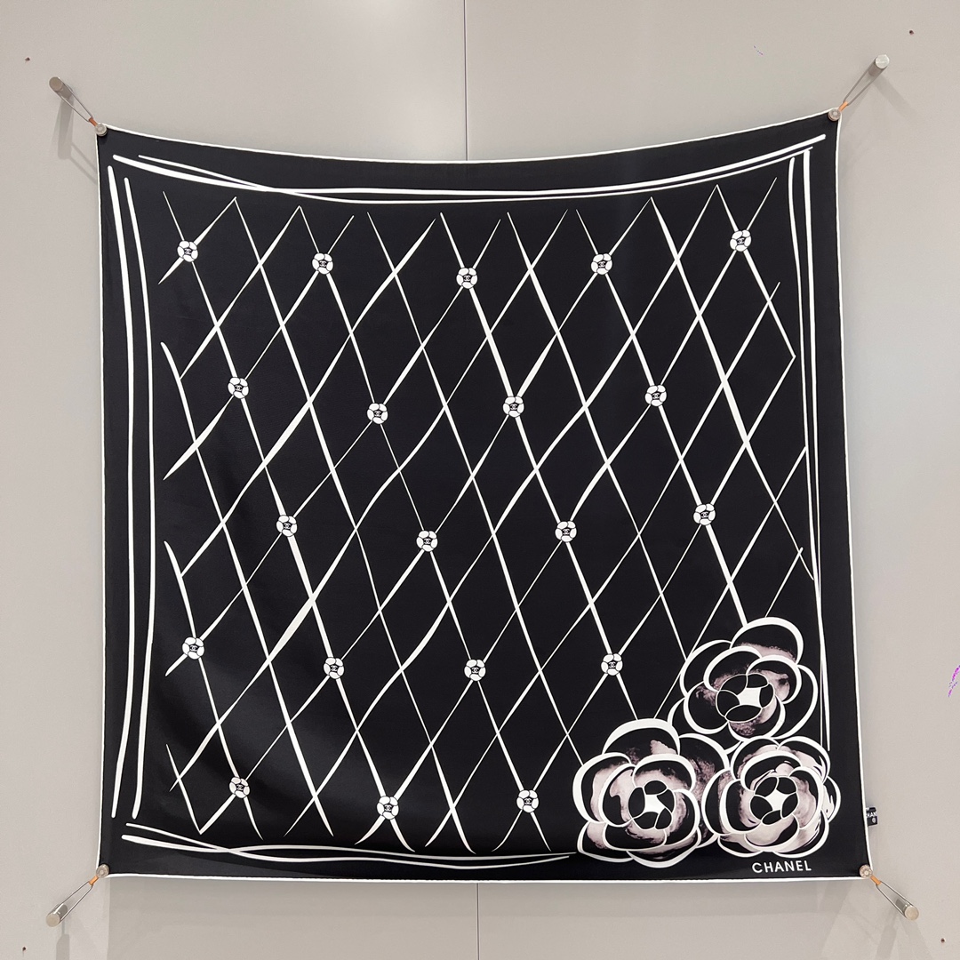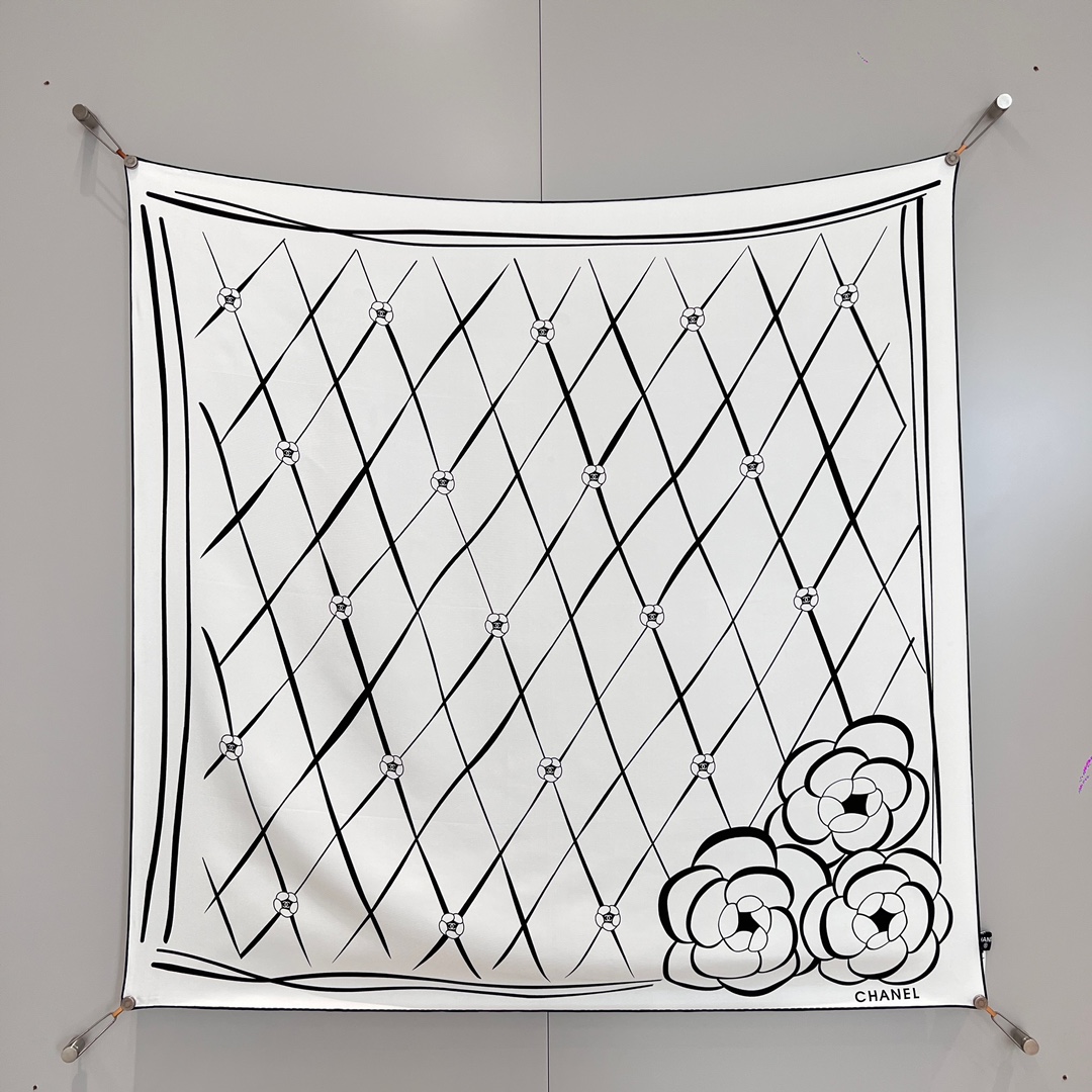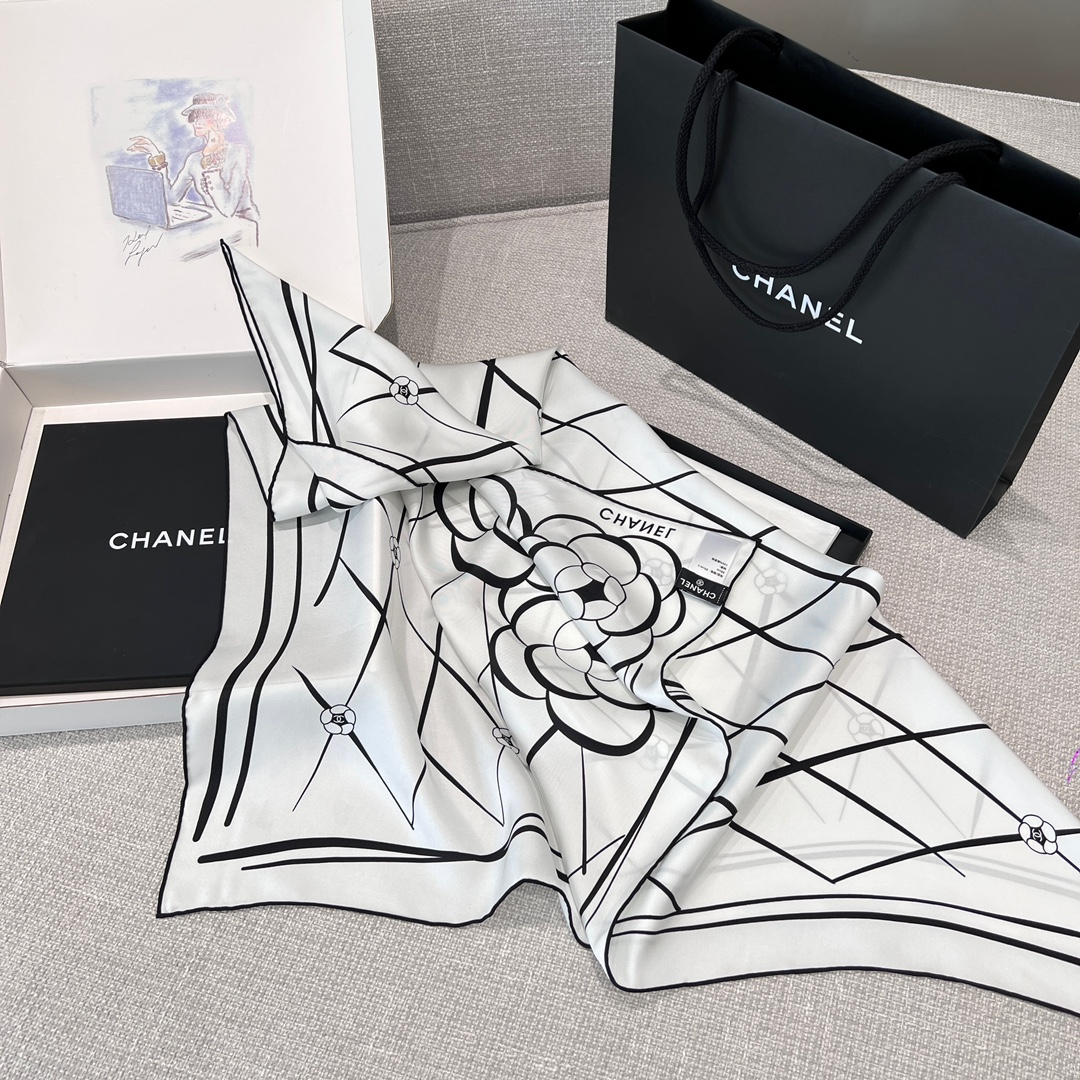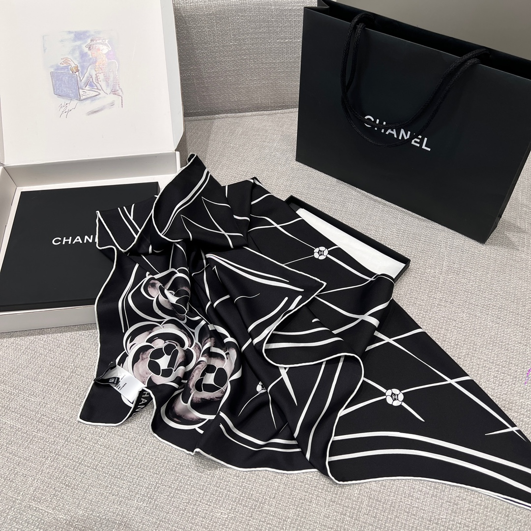 В одном из углов расположены три крупных стилизованных камелии, добавляющие акцент утончённости. В нижней части платка аккуратно размещён логотип CHANEL. Лёгкий, воздушный шёлк придаёт платку изысканный блеск и роскошную мягкость, делая его идеальным аксессуаром для создания утончённых и женственных образов.