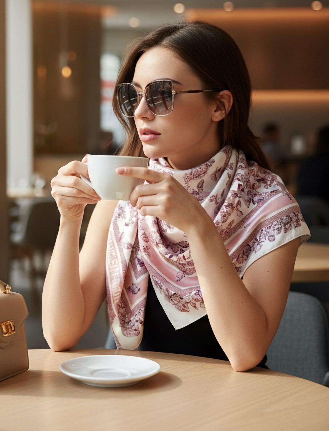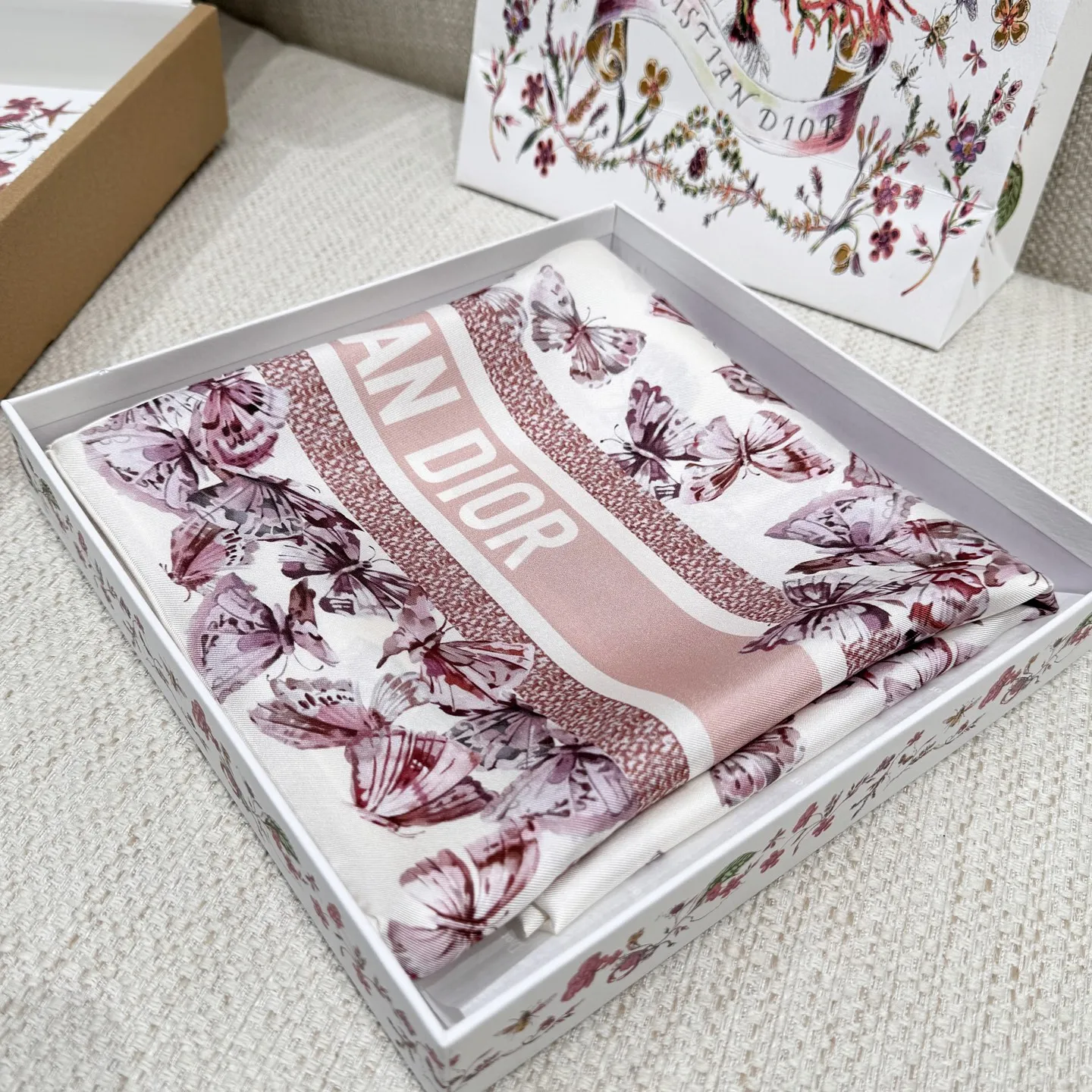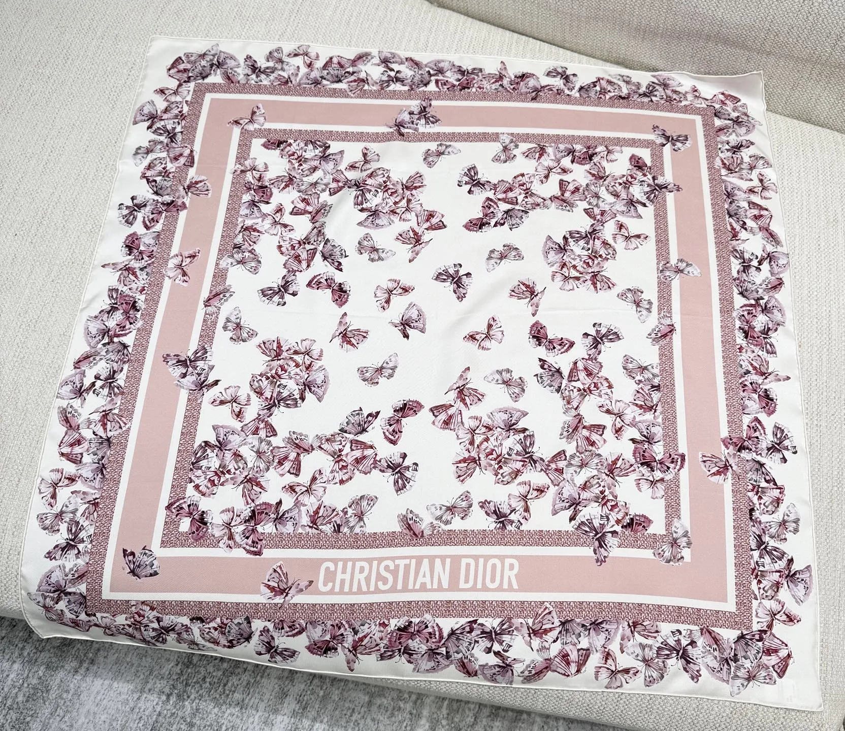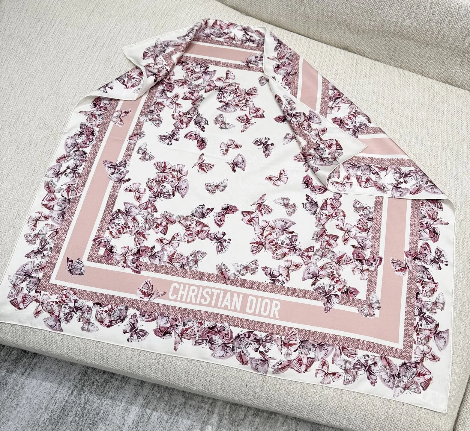 Дизайн платка украшен нежным принтом с изображением порхающих бабочек в розовых и бордовых оттенках, создавая атмосферу лёгкости и романтики. Центральная часть дополнена фирменным логотипом, подчеркивающим статус и эксклюзивность аксессуара.