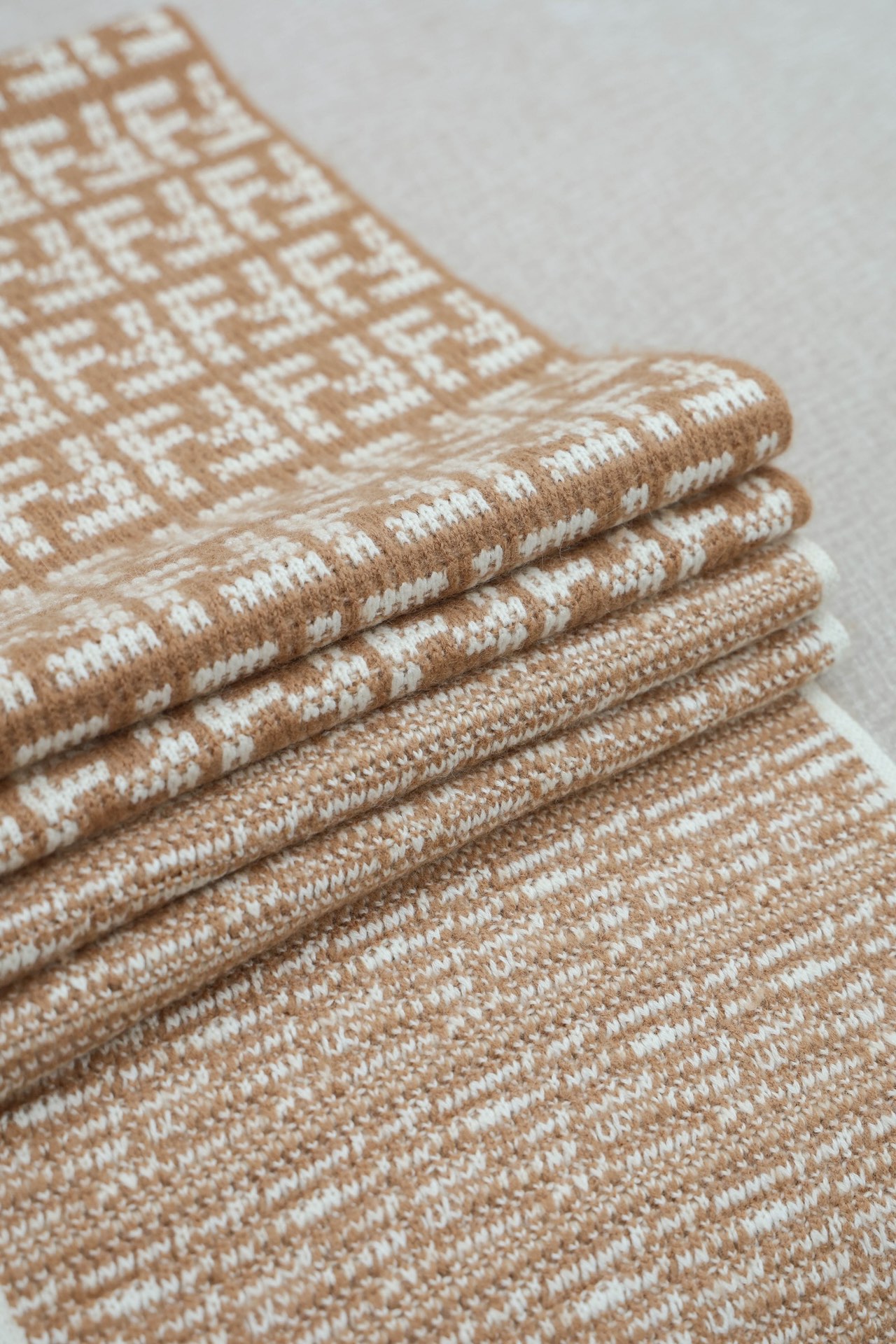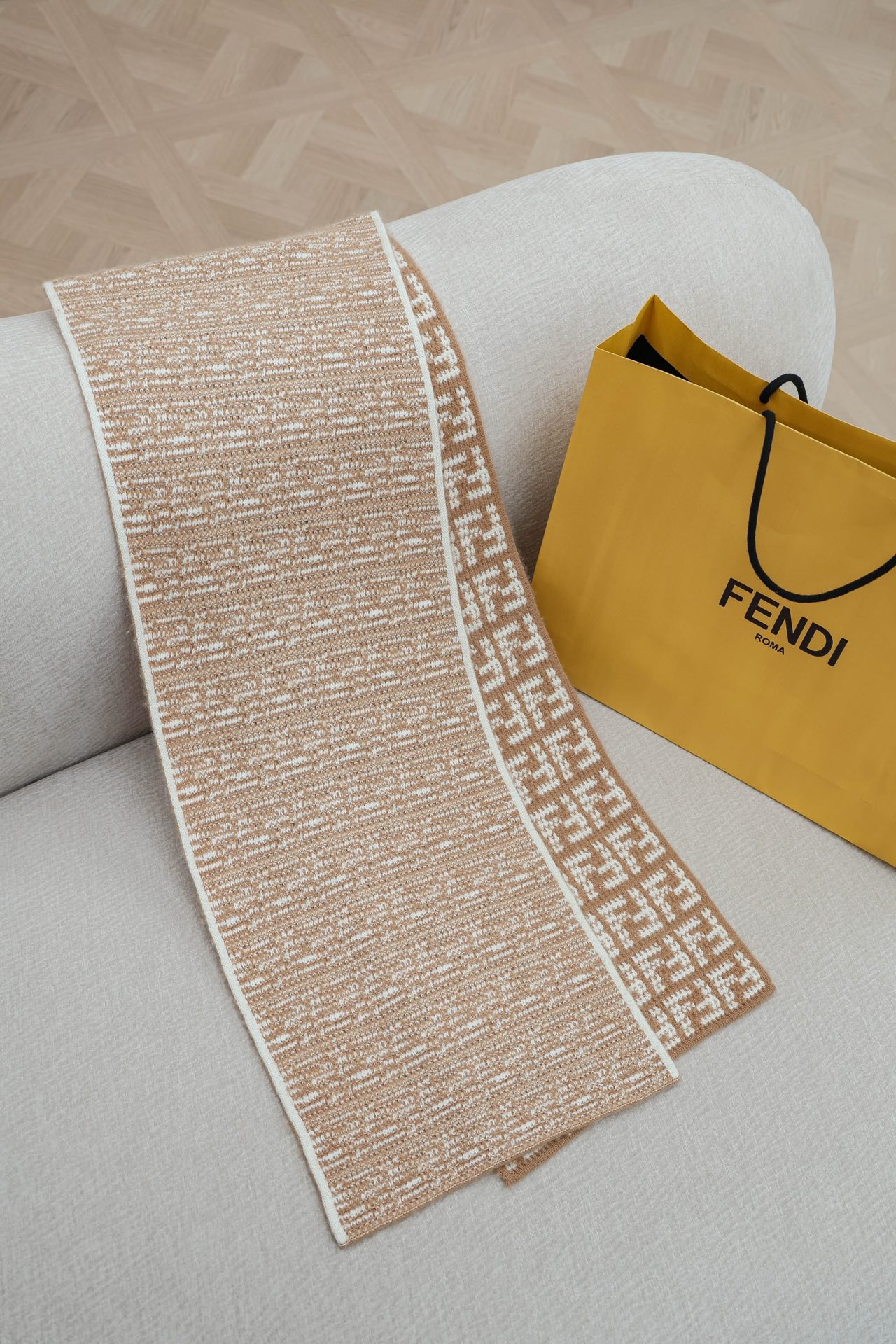Шарф выполнен из премиального кашемира плотной, но приятной на ощупь вязки. По всей длине — аккуратный жаккардовый рисунок из повторяющихся монограмм Fendi, выполненный в контрастных бежево‑кремовых тонах. Одной стороной узор проявлен крупными геометрическими клетками, другой — более мелким реверсивным плетением, что придаёт изделию глубину и интересный декоративный эффект при драпировке. Узкие контрастные окантовки по краям подчеркивают аккуратную отделку и создают завершённый образ.