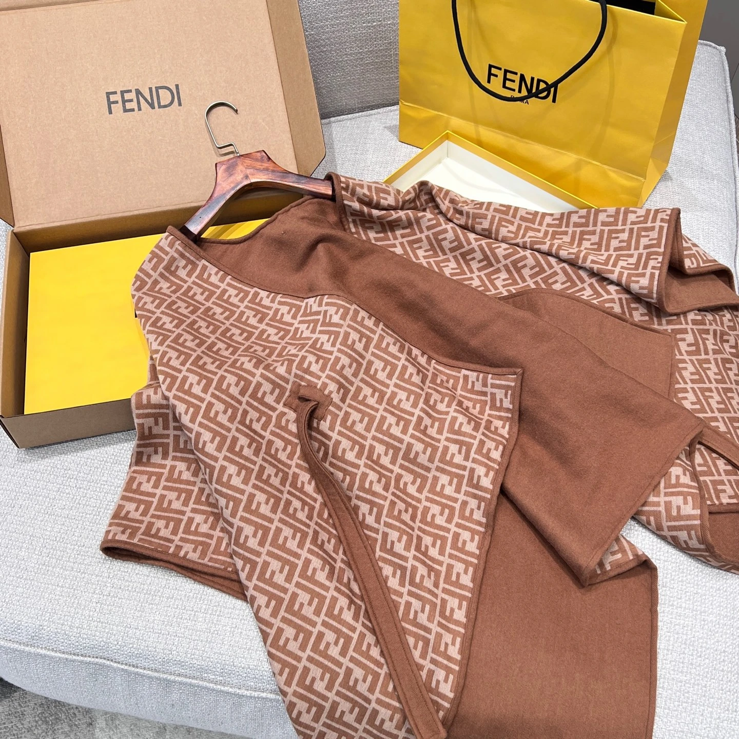 • Декор и отделка: внутренняя сторона оформлена жаккардовым монограмм‑узором FF в тональном контрасте, который виден при драпировке краёв. По контуру — аккуратная кантовая обработка, подчёркивающая чистые линии изделия. На уровне талии — декоративные петельки в тёмном оттенке, через которые продевается пояс.