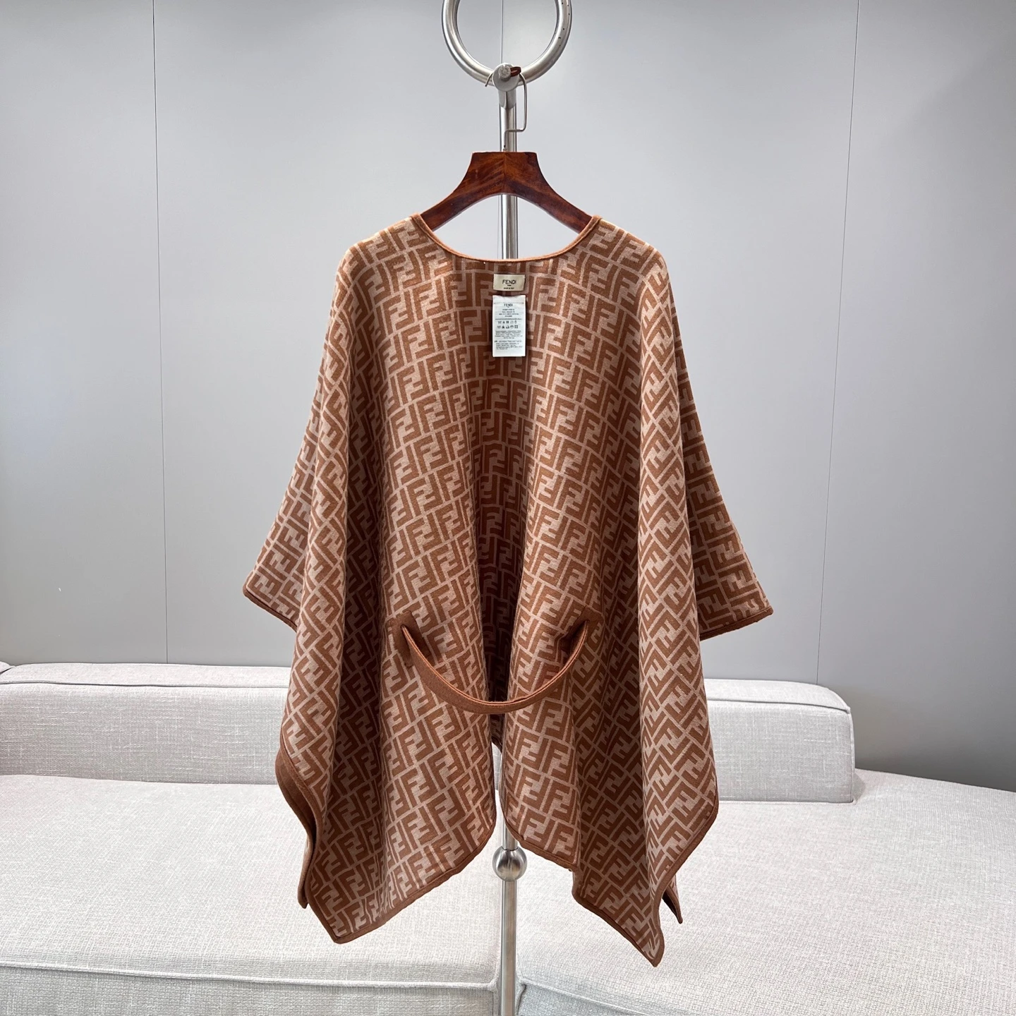 Элегантное женское пончо FENDI в мягкой кремово‑бежевой гамме. Свободный драпирующийся силуэт с V‑образным вырезом и акцентным поясом создаёт современный, утончённый образ. Внутренняя сторона оформлена фирменным жаккардовым узором FF, что делает модель узнаваемой и стильной.