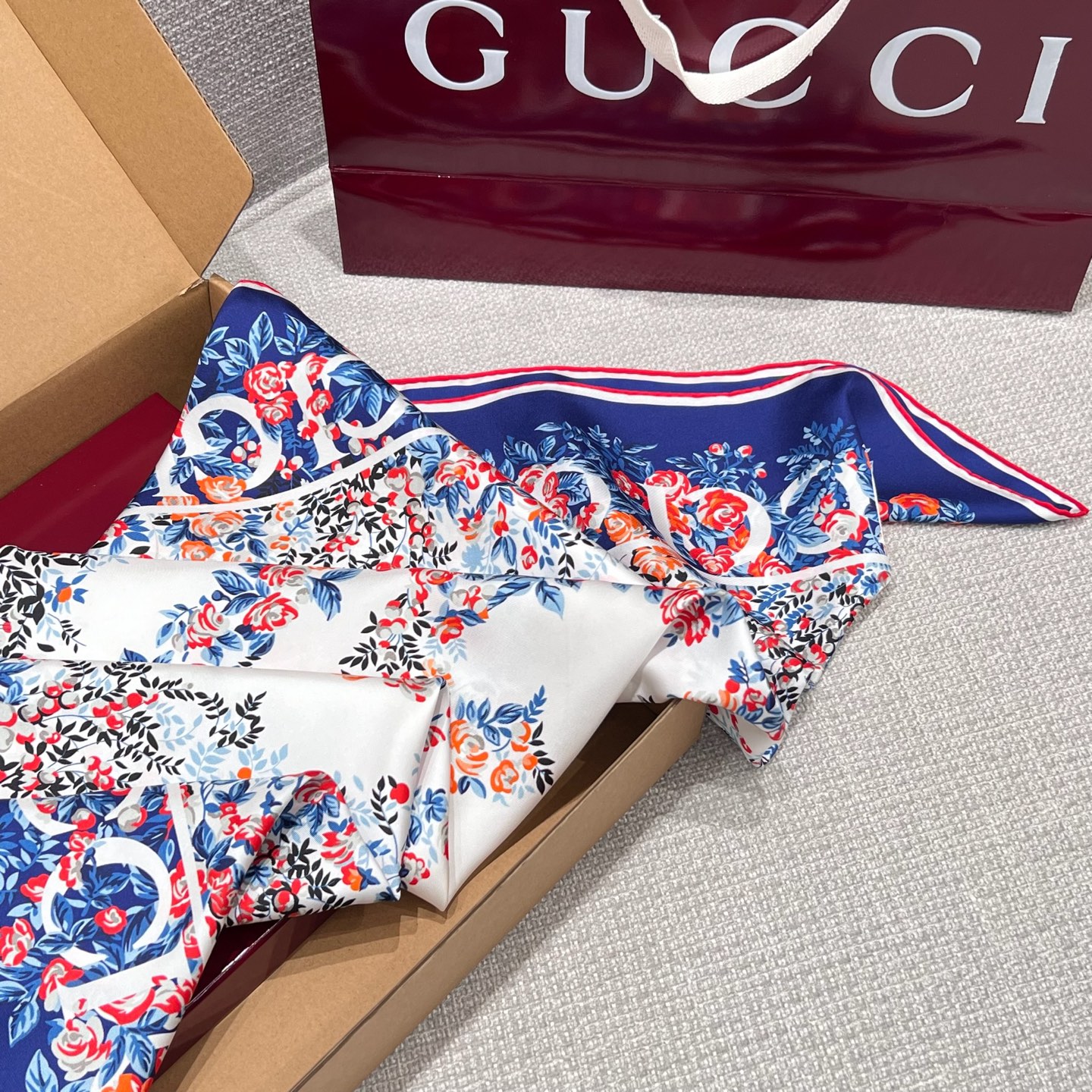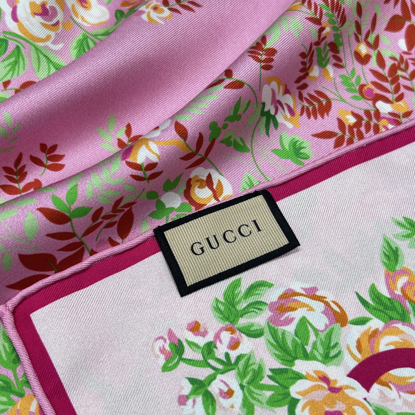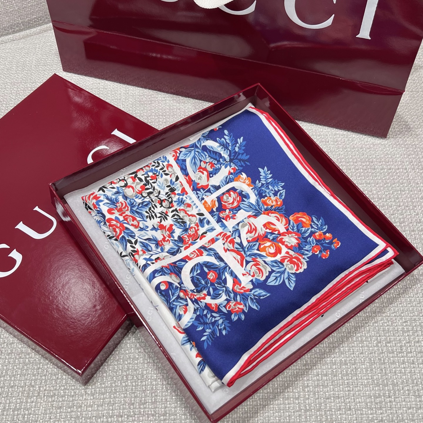 Шёлковый платок Gucci — воплощение элегантности и утончённости. Роскошный аксессуар выполнен из нежного натурального шёлка высокого качества. Основу дизайна составляет фирменный логотип Gucci, гармонично вписанный в композицию.