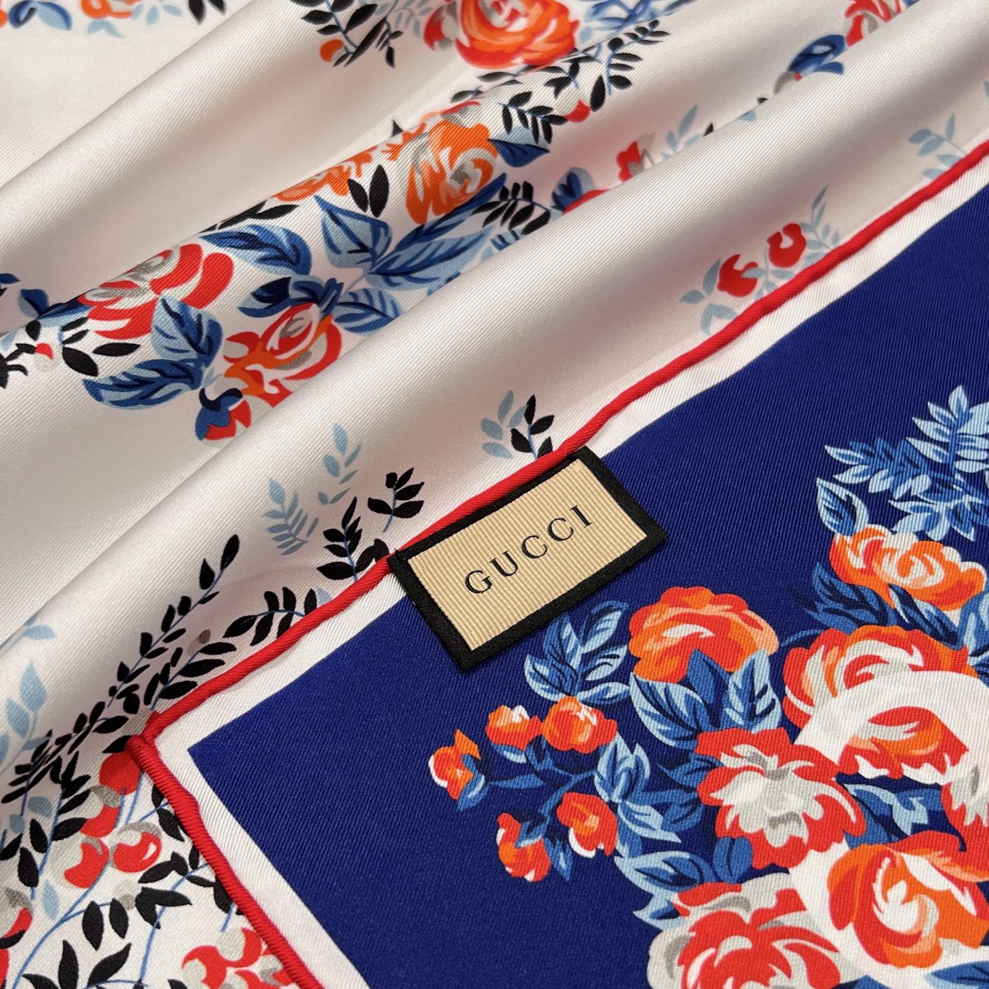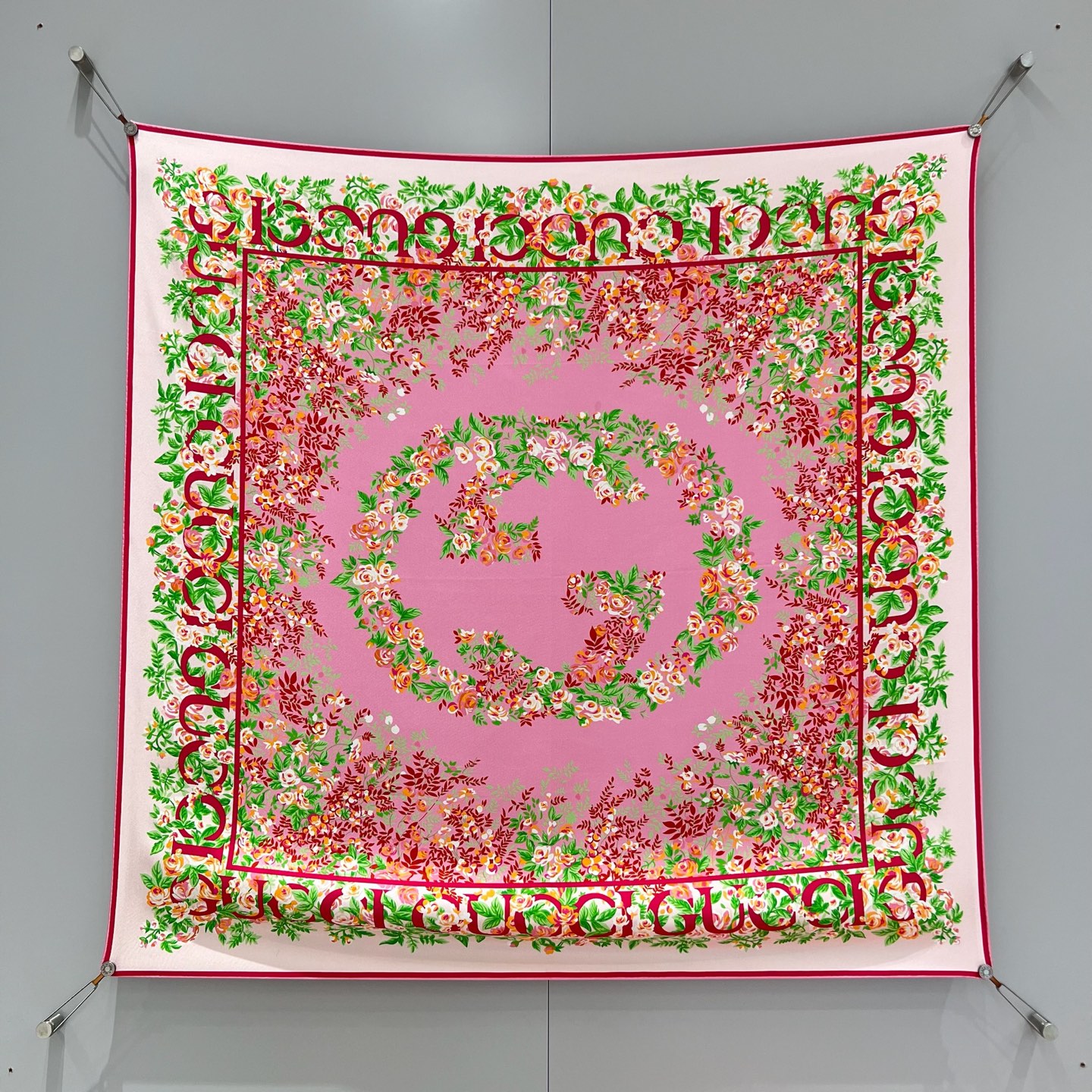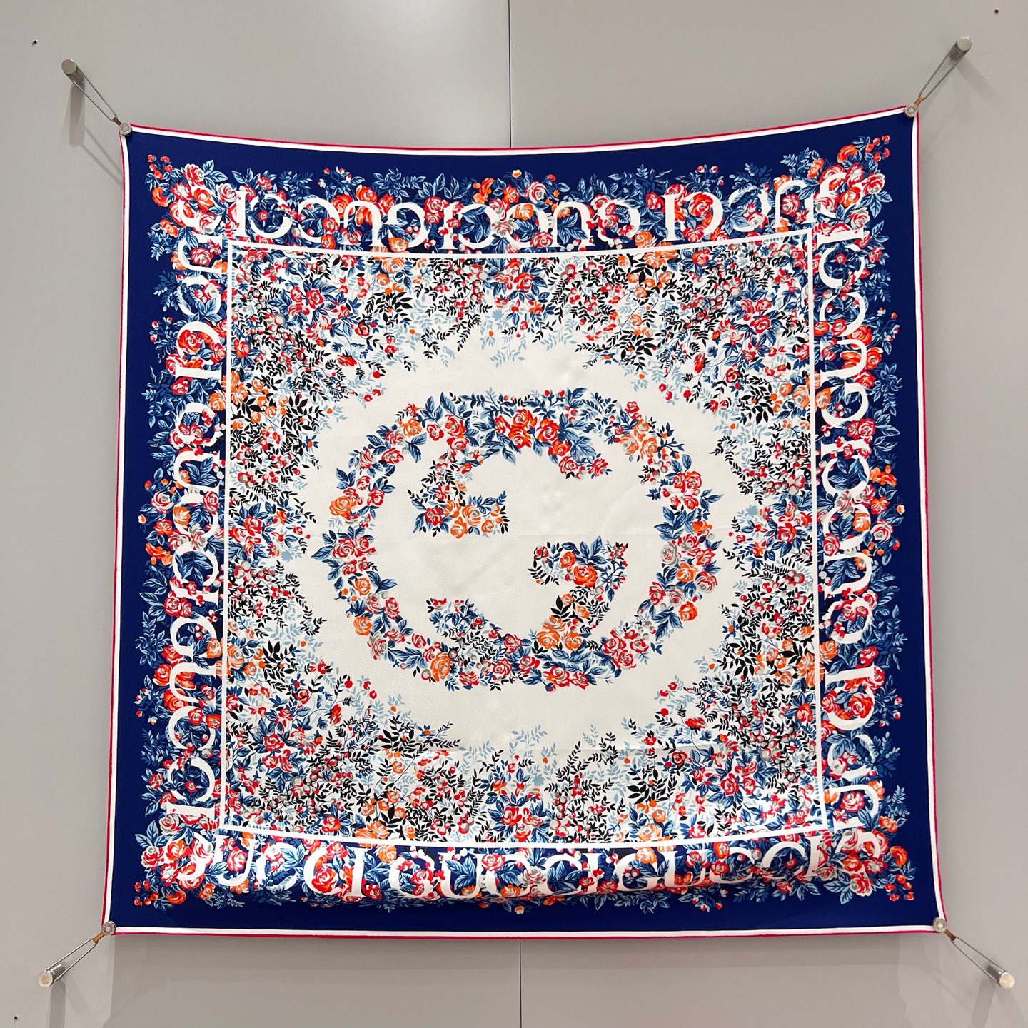 Шёлковый платок Gucci — воплощение элегантности и утончённости. Роскошный аксессуар выполнен из нежного натурального шёлка высокого качества. Основу дизайна составляет фирменный логотип Gucci, гармонично вписанный в композицию.