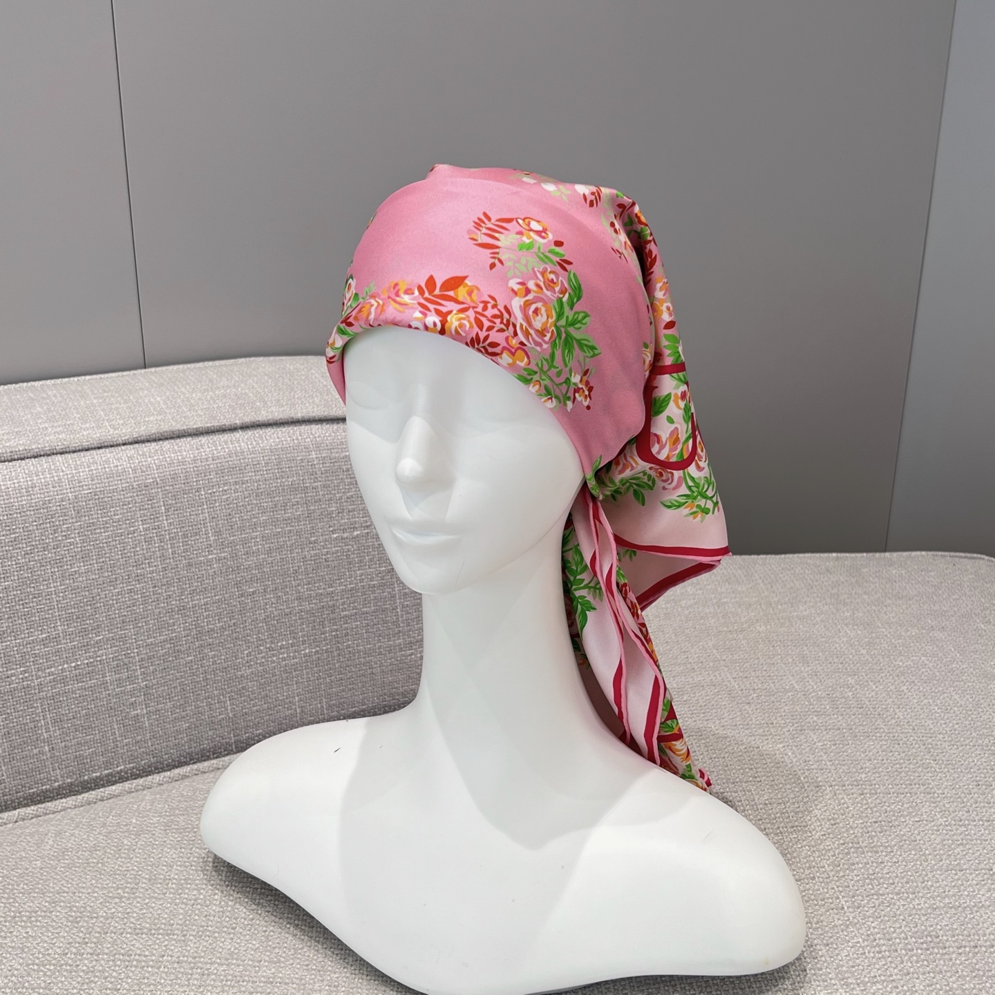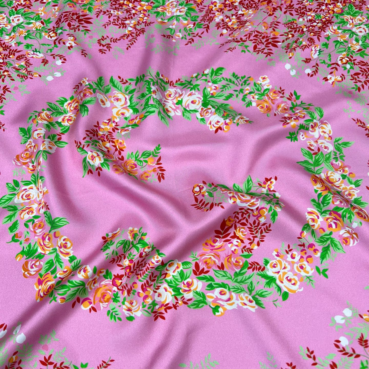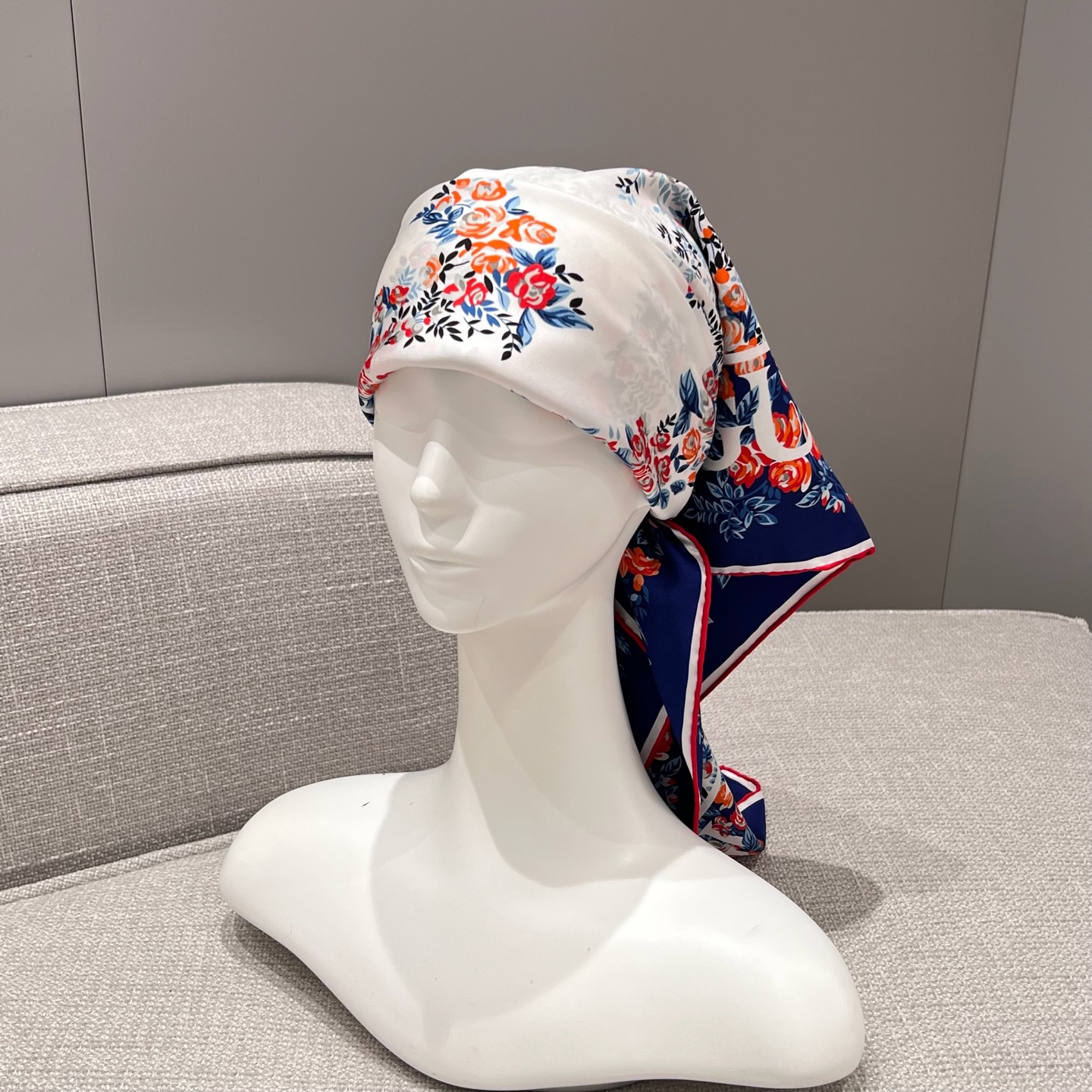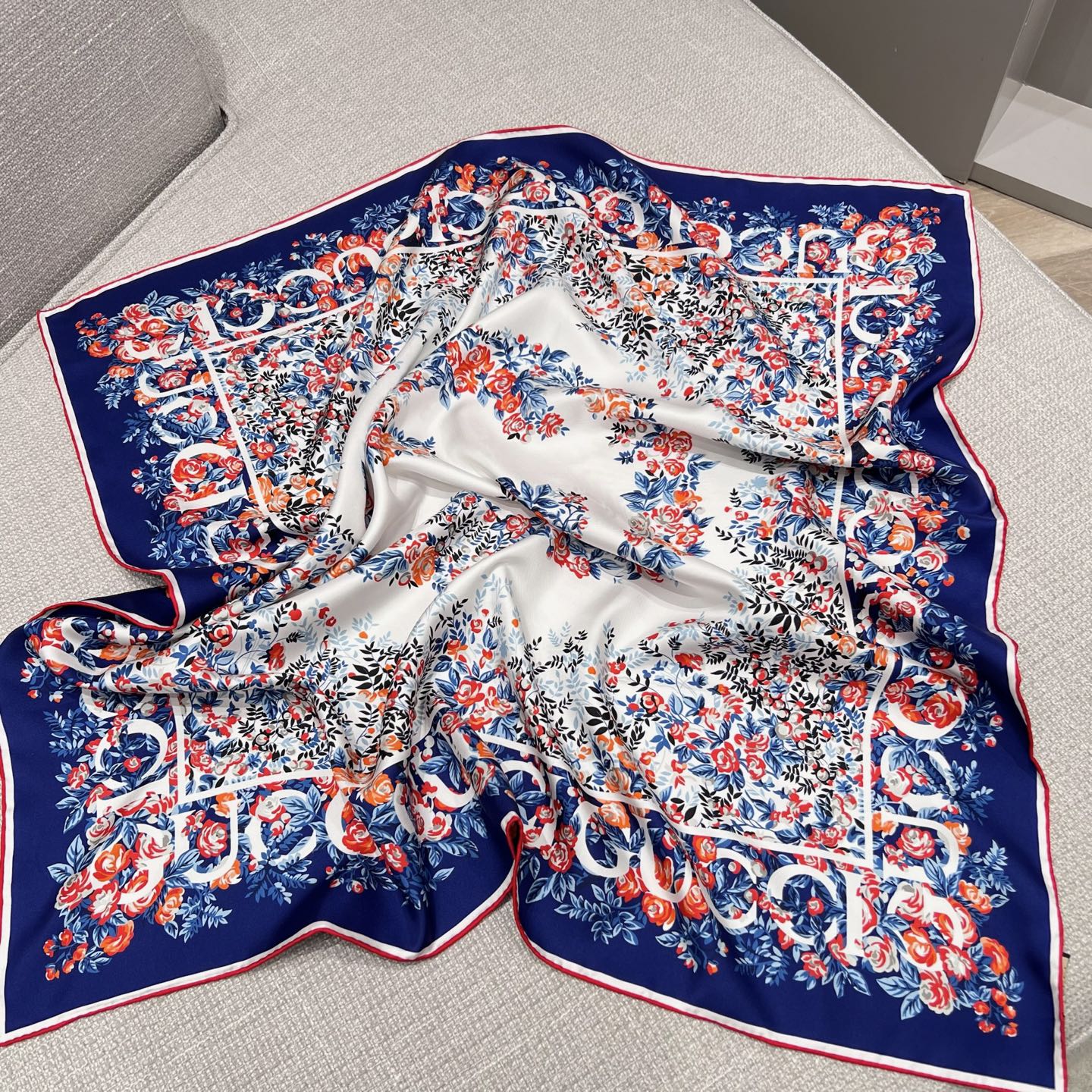 Платок украшен изысканным цветочным орнаментом ярких оттенков, обрамлён каймой с повторяющимся логотипом бренда. Такой аксессуар станет стильным акцентом любого образа, подчёркивая безупречный вкус своей обладательницы. Отлично подходит как для повседневной носки, так и для особых случаев.