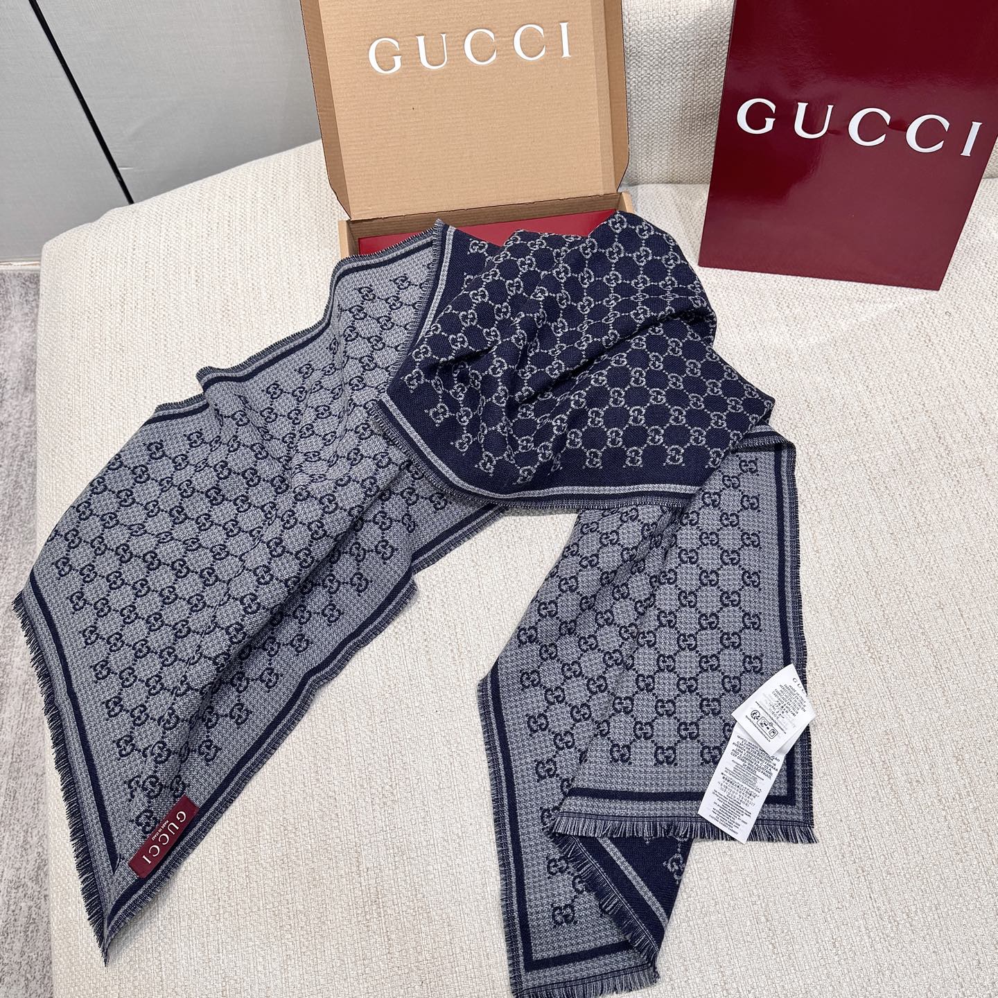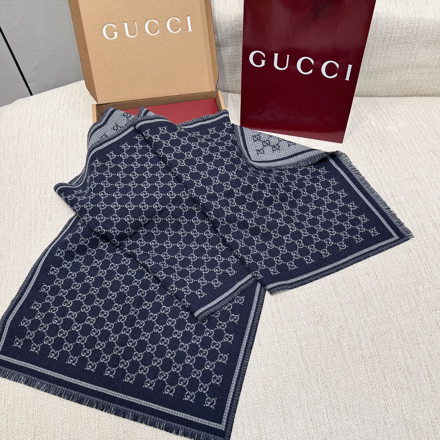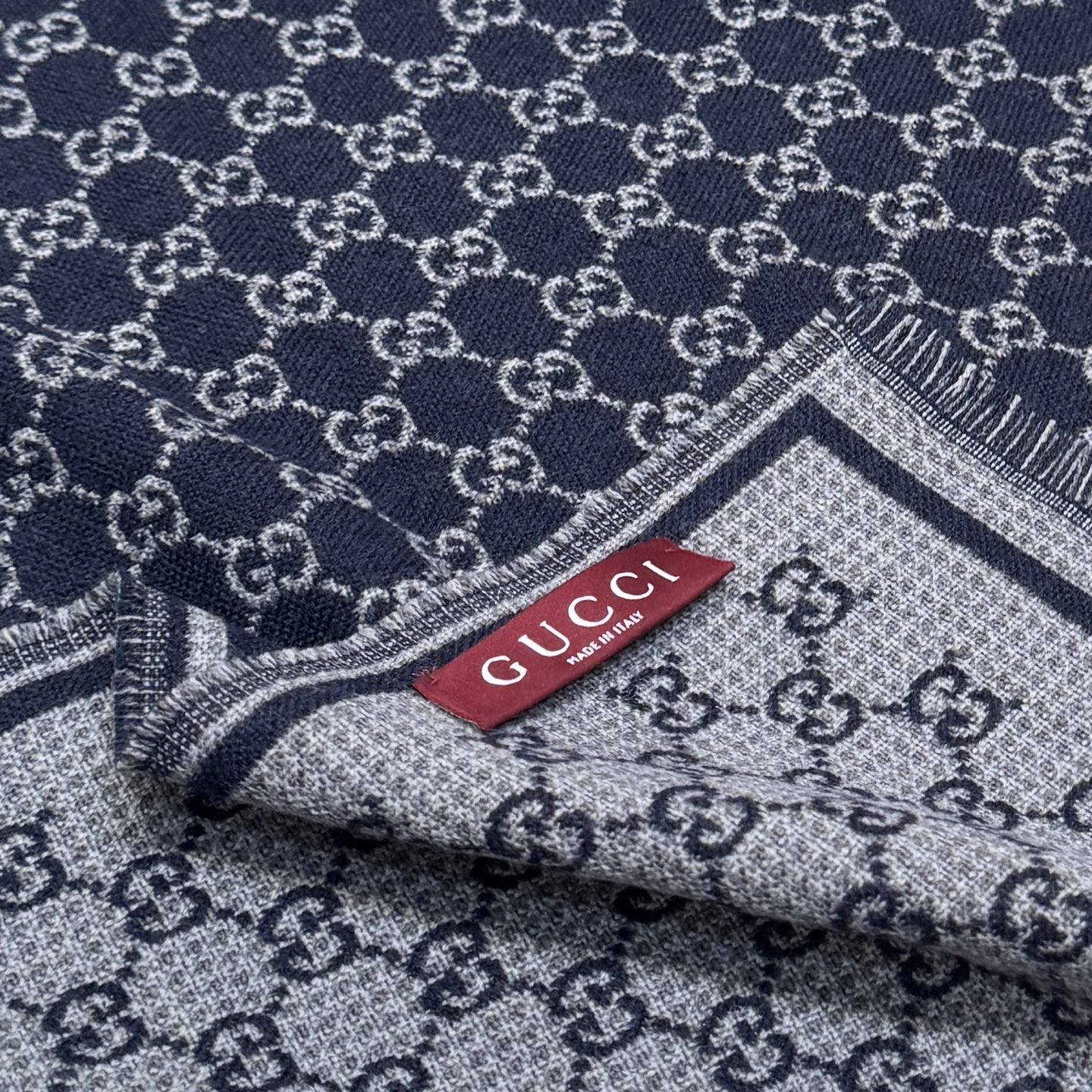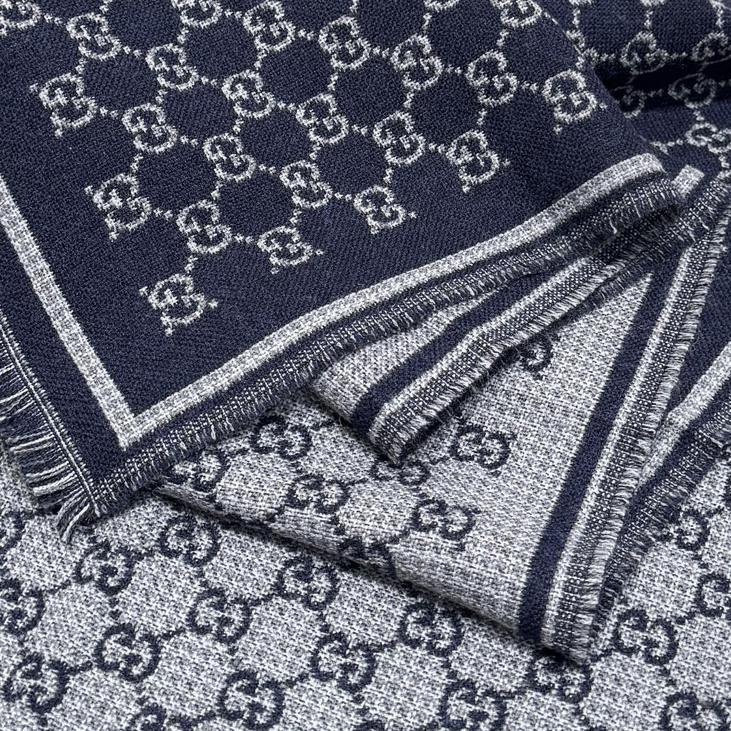 Женский шарф от GUCCI выполнен в классическом цвете — насыщенно‑тёмно‑синие поле и контрастный светло‑серый рисунок логотипа GG по всей поверхности. Жаккардовая вязка создаёт рельефный, износостойкий узор с аккуратным, чётким рисунком. По периметру шарфа — двойная декоративная рамка и аккуратная короткая бахрома, которая придает изделию завершённый и элегантный вид.