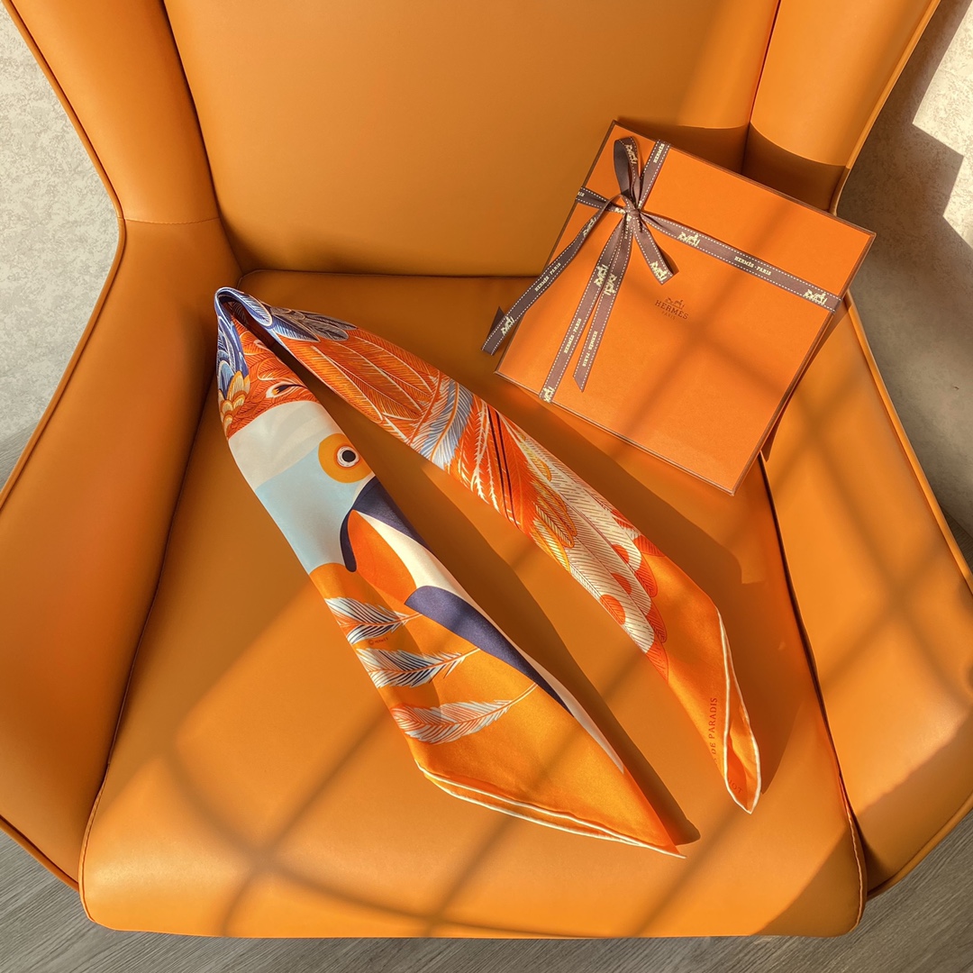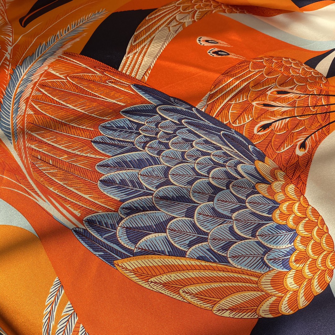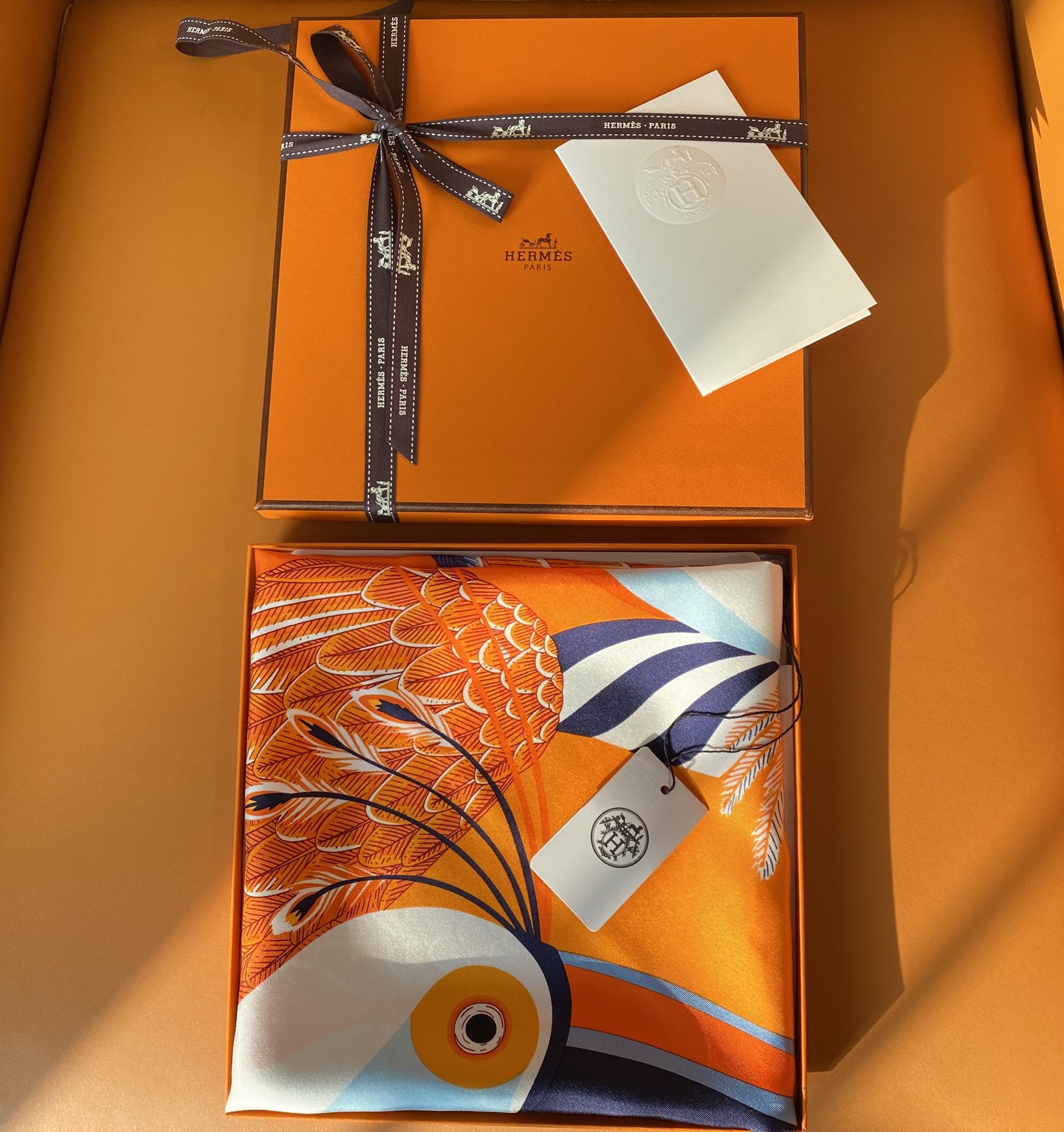 Изысканный шёлковый платок HERMES размером 90x90 см – это воплощение элегантности и стиля. Выполненный из 100% шелка плотностью 18 мм, он отличается превосходным качеством и тактильными ощущениями. Его характерный дизайн часто включает в себя сложные узоры, яркие цвета и уникальные иллюстрации, такие как изображение экзотических птиц, обрамленных насыщенными оттенками оранжевого, голубого и белого. Такой платок можно носить как аксессуар, дополняющий образ, или использовать его в качестве украшения для сумки. Легкость и мягкость шелка делают его приятным на ощупь и уютным в носке. Платок Hermes — это отличный способ добавить яркости и стиля в любой наряд.