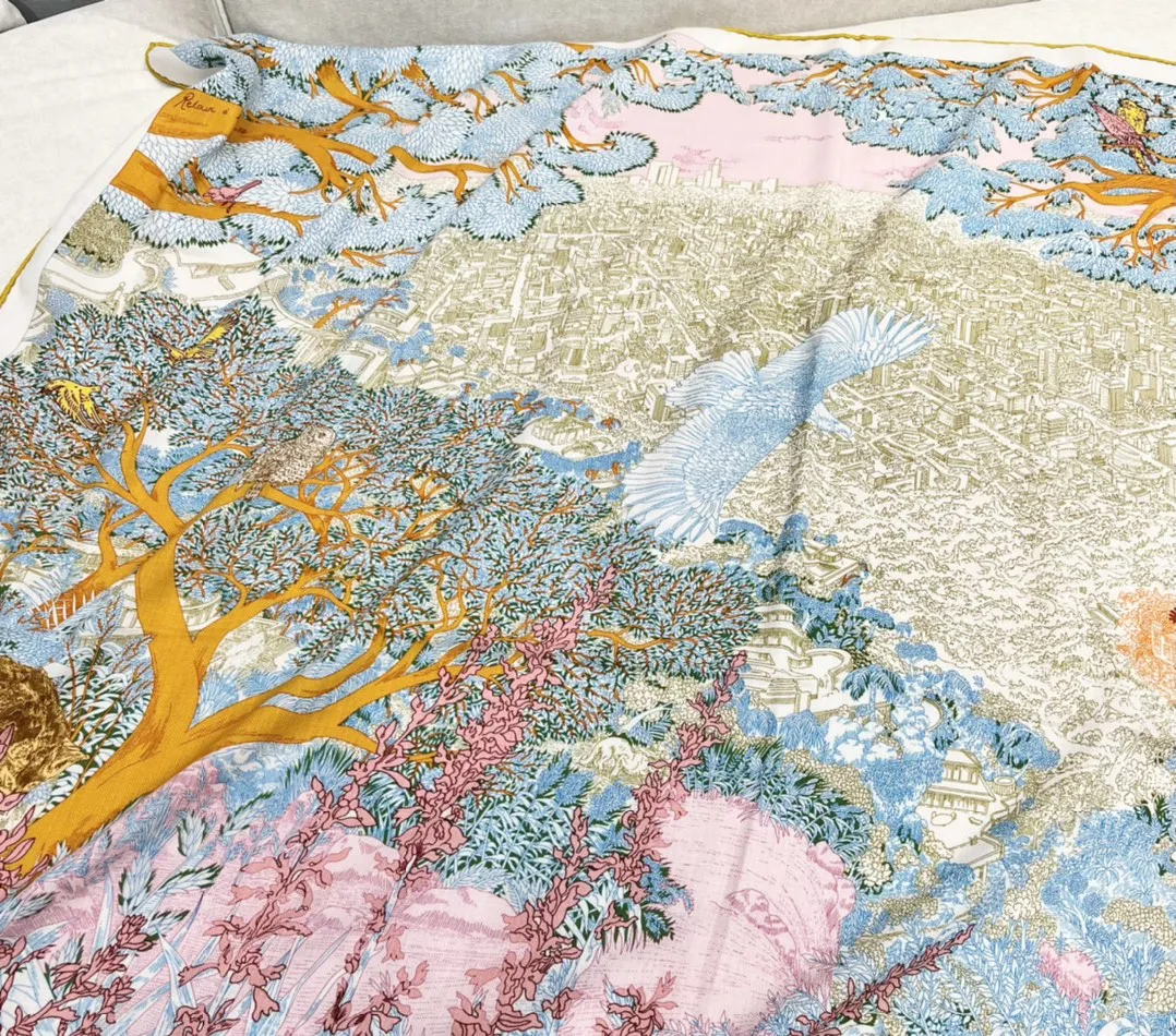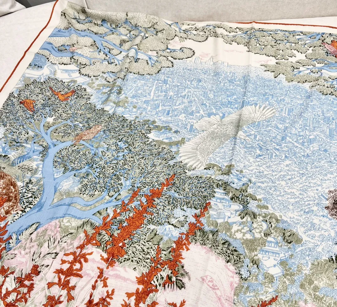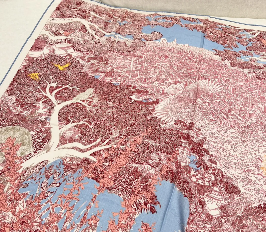 Дизайн платка — это сложная, нарисованная вручную работа, которая передает атмосферу холмов города. В центре внимания — дикие животные и флора, которые, несмотря на урбанистическую среду, продолжают существовать в этом динамичном ландшафте. Дизайнер стремился смягчить влияние городской архитектуры, подчеркивая важность природной среды Калифорнии. Изображения животных, скрывающихся в лабиринте улиц и густой растительности, создают ощущение живого взаимодействия между природой и городом.
