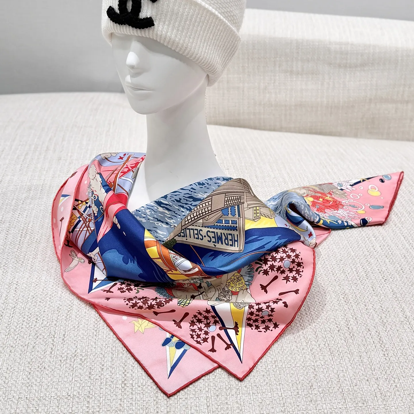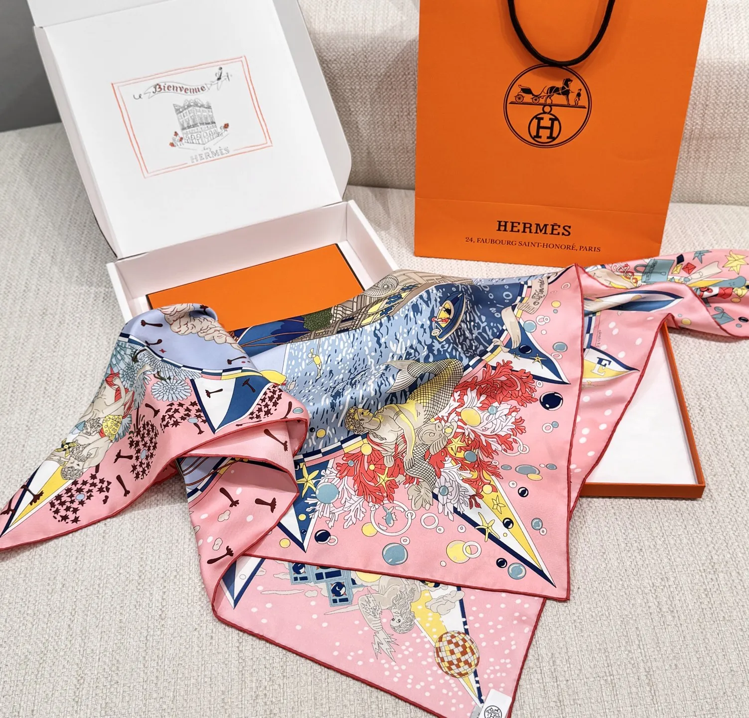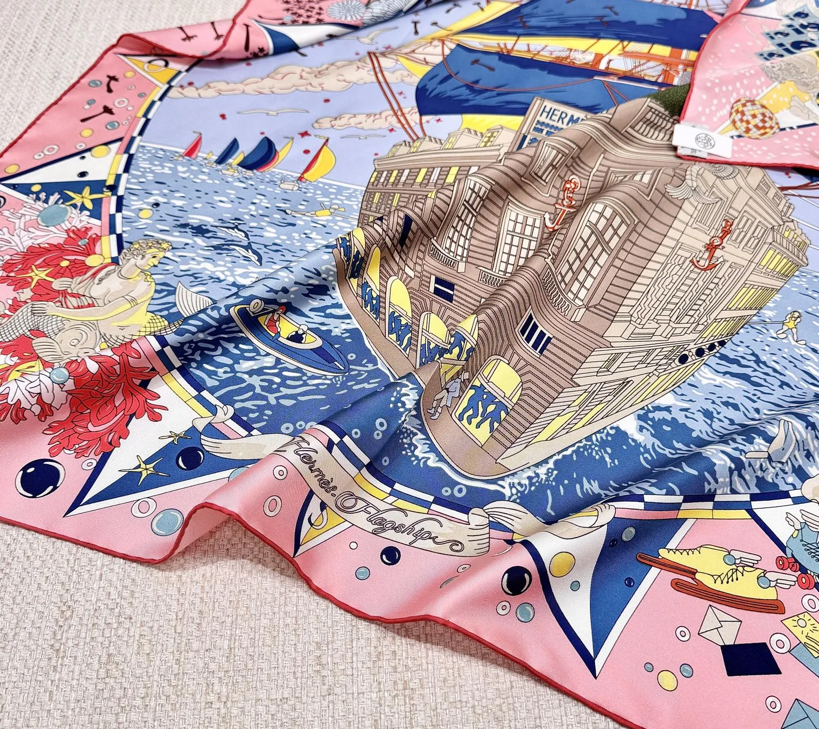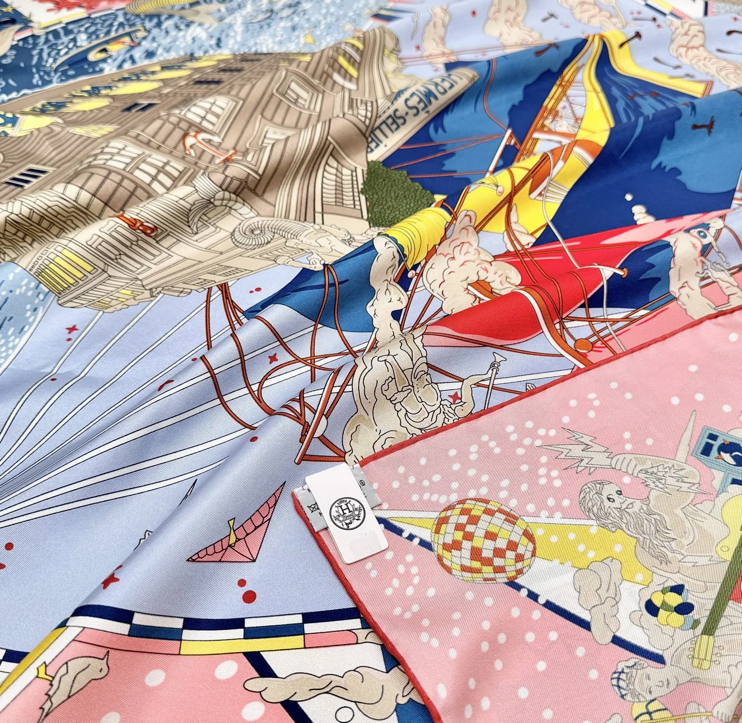 Изысканный шёлковый платок HERMES – это воплощение элегантности и стиля. Выполненный из 100% шелка плотностью 18 мм, он отличается превосходным качеством и тактильными ощущениями. Этот изысканный женский платок от HERMES выполнен из высококачественного шелка. Он имеет уникальный и яркий дизайн, который привлекает внимание. Его дизайн напоминает часть роскошного корабля, украшенную тесаным камнем, а также витрины, словно открывающие окна на праздничную сцену в самом разгаре торжества. В этот момент греческие боги наблюдают за происходящим с легкой завистью, ведь сама атмосфера наполнена магией и величием.