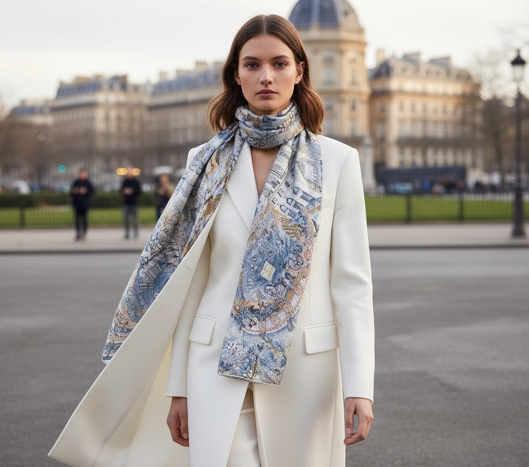 Женский платок Hermes из шелка — воплощение элегантности и высокого стиля. Эксклюзивный аксессуар выполнен из натурального шелка, который отличается приятной на ощупь текстурой и роскошным блеском. Уникальный авторский принт сочетает изысканные оттенки золота, серебра и синего, создавая неповторимый художественный узор с элементами флоры и архитектуры.