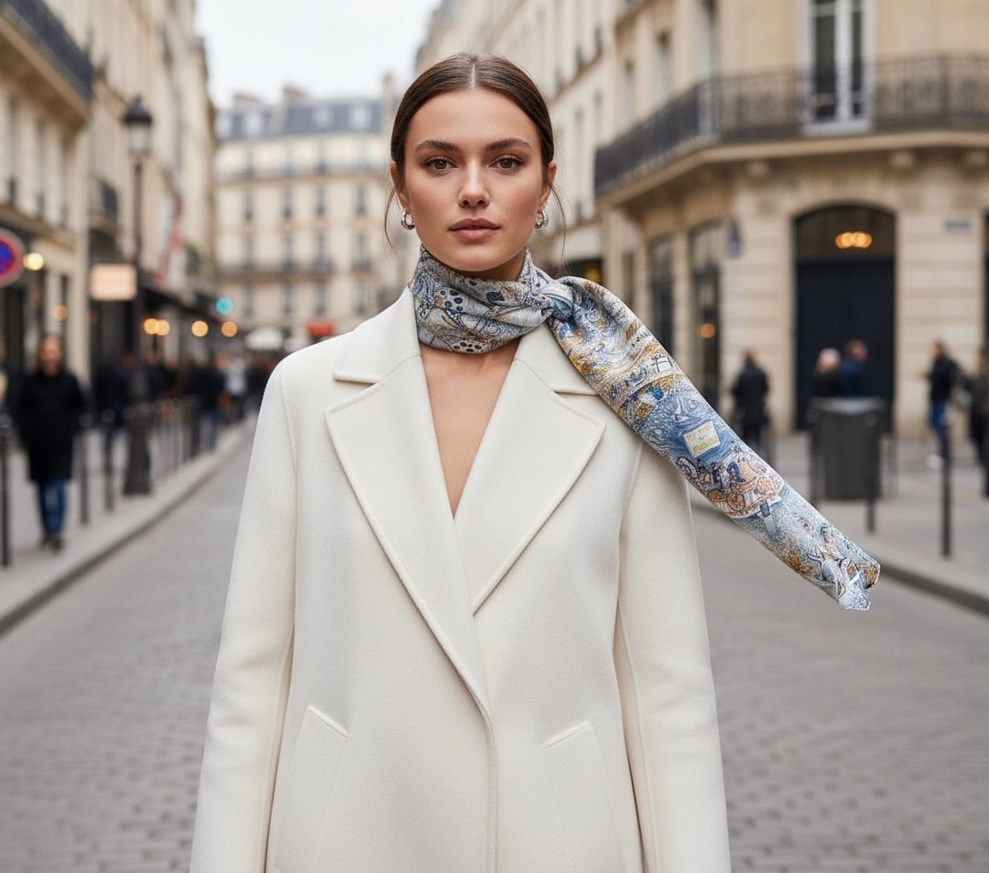Платок аккуратно окантован по краям, что подчеркивает его утонченность и предает изделию законченный вид. Идеальный размер позволяет носить его различными способами: на шее, в волосах или на ручке сумки.