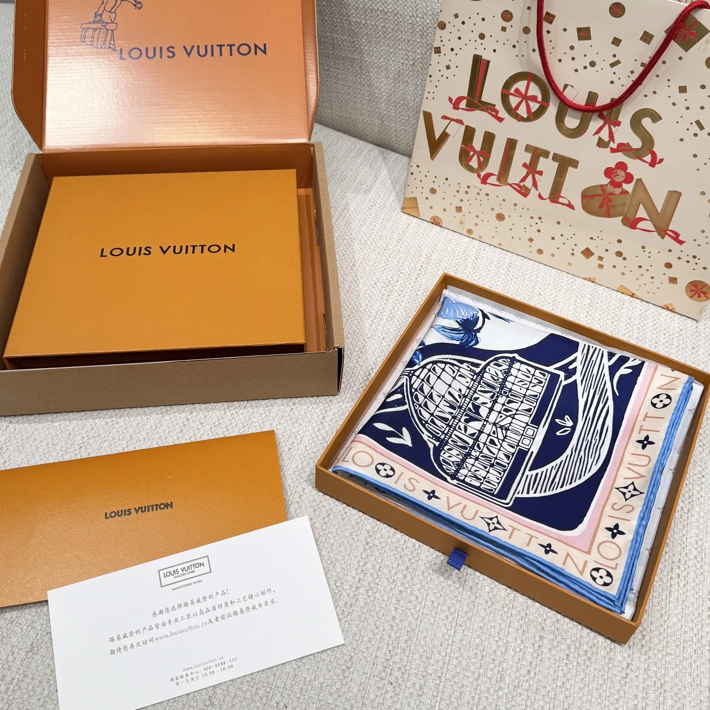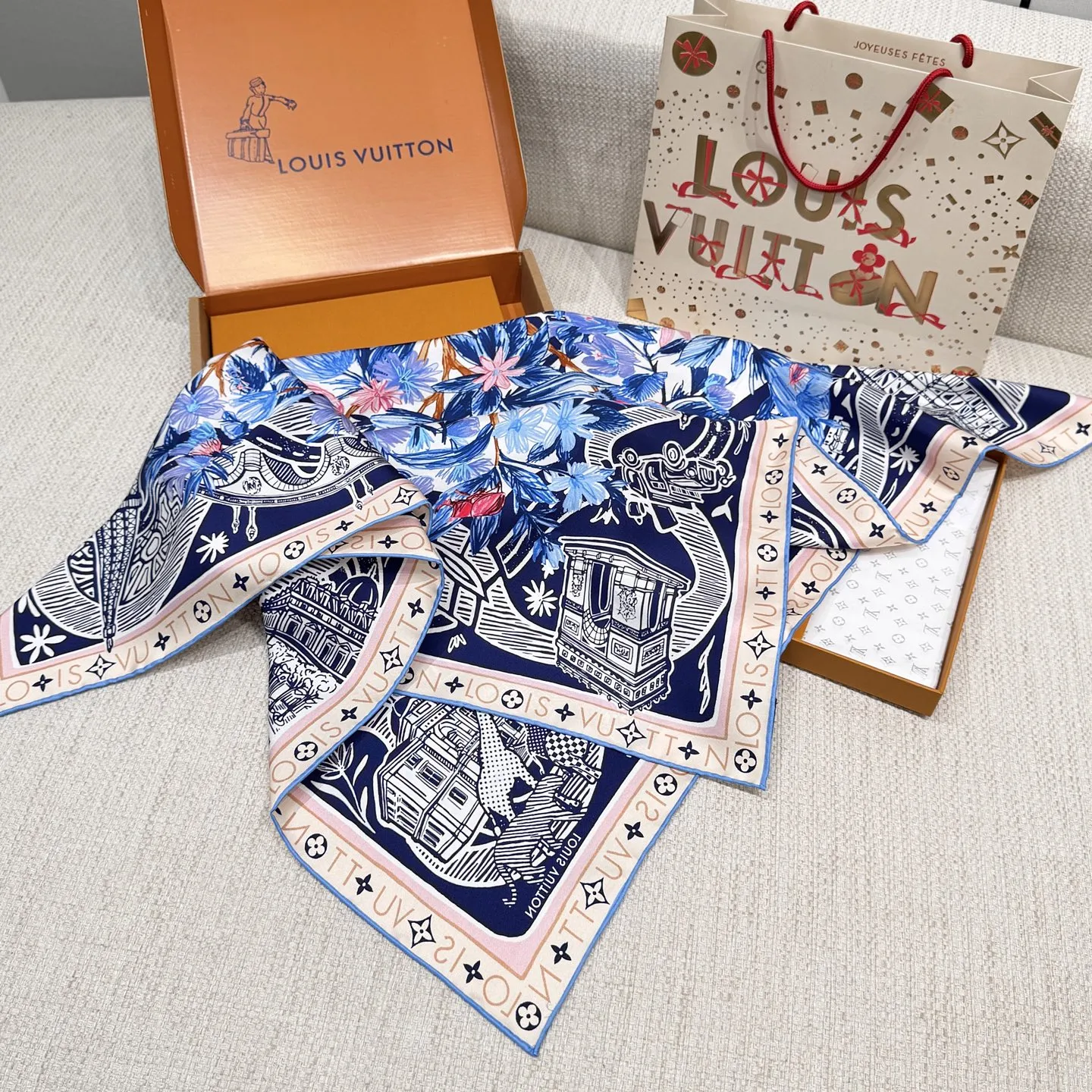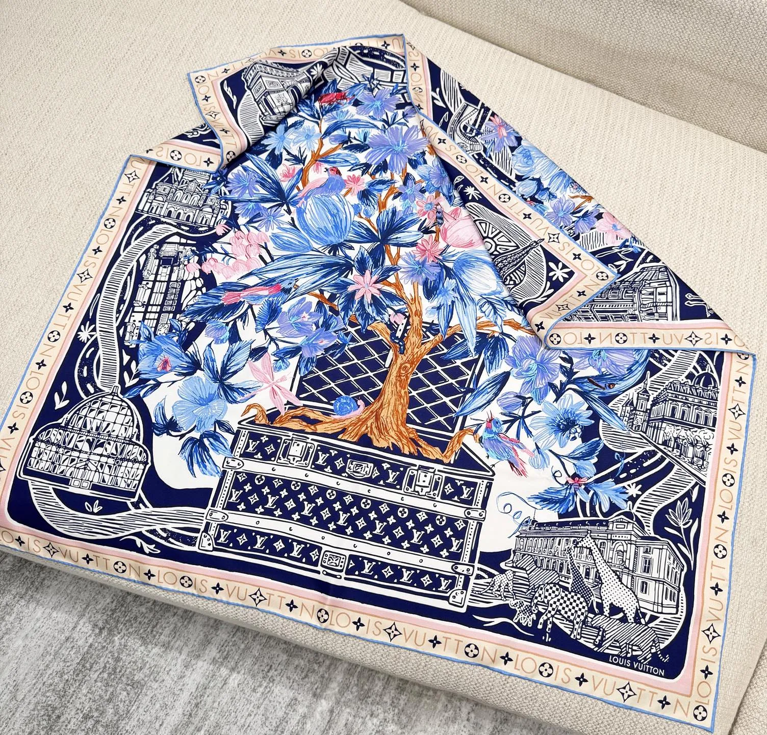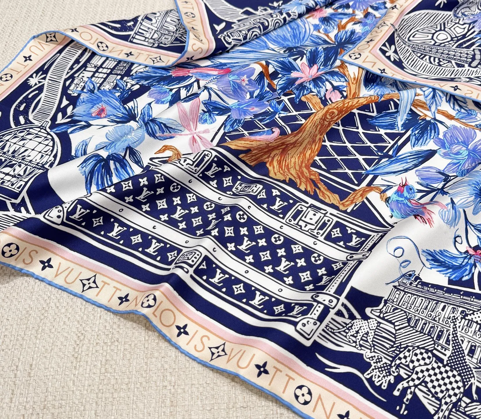 Глубокие синие и нежные пастельные оттенки создают гармоничную цветовую палитру, которая подчёркивает роскошь и внимание к деталям. Платок украшен изящной рамкой с логотипом Louis Vuitton, что придаёт ему завершённый и стильный вид.