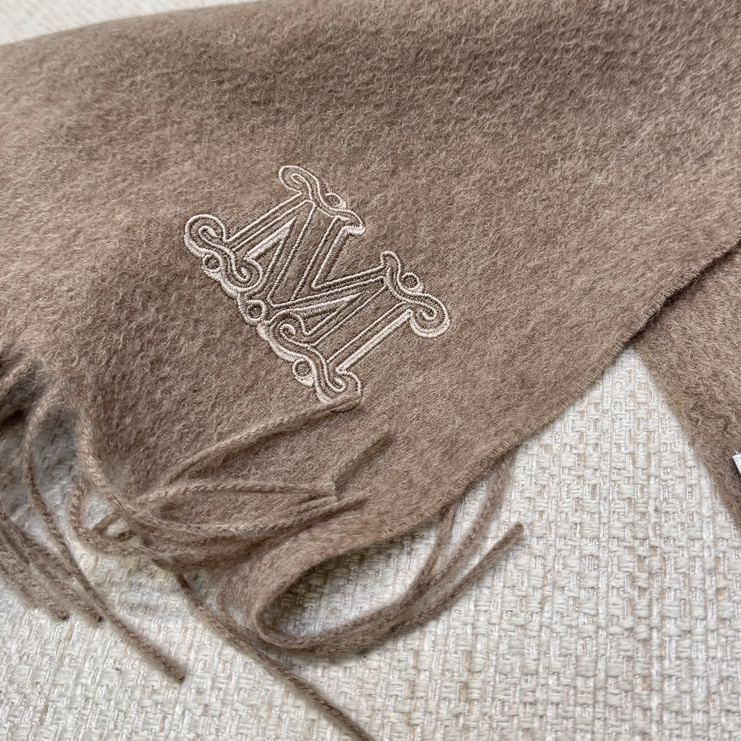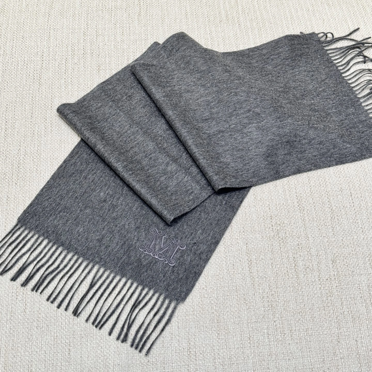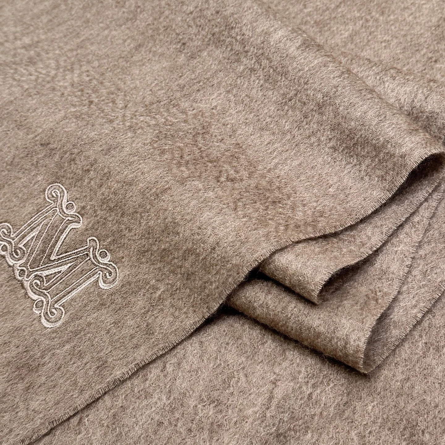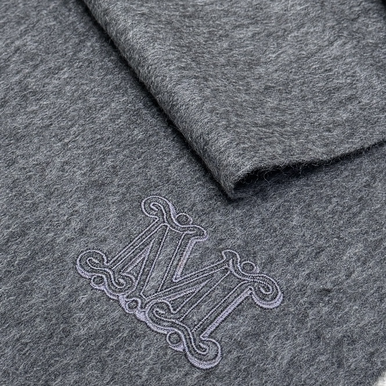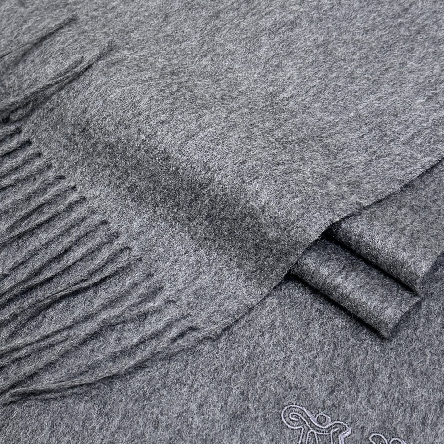 • Дизайн: минималистичный прямоугольный шарф с тонкой аккуратной бахромой по коротким краям. На поверхности — изящная тон‑он‑тон вышивка монограммы «MM», придающая изделию фирменный, утончённый характер.