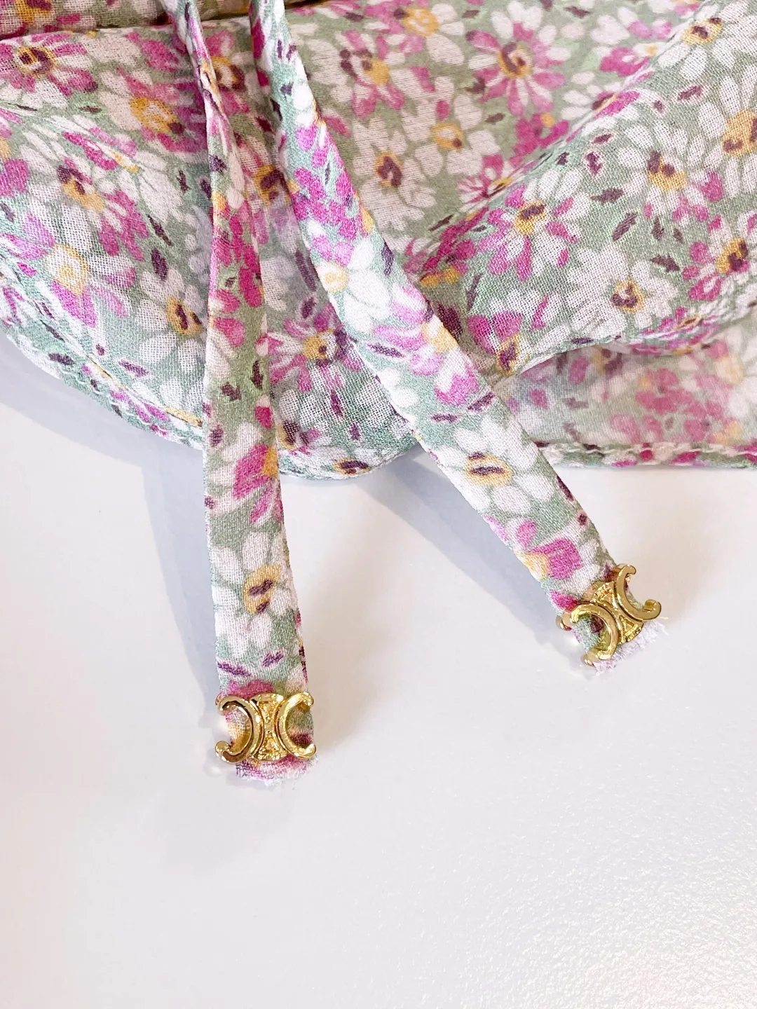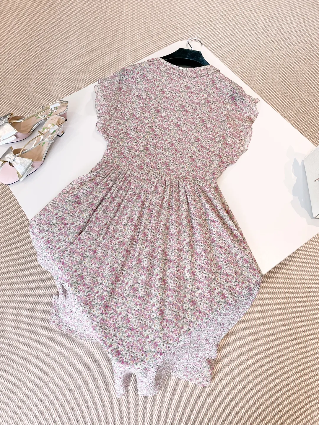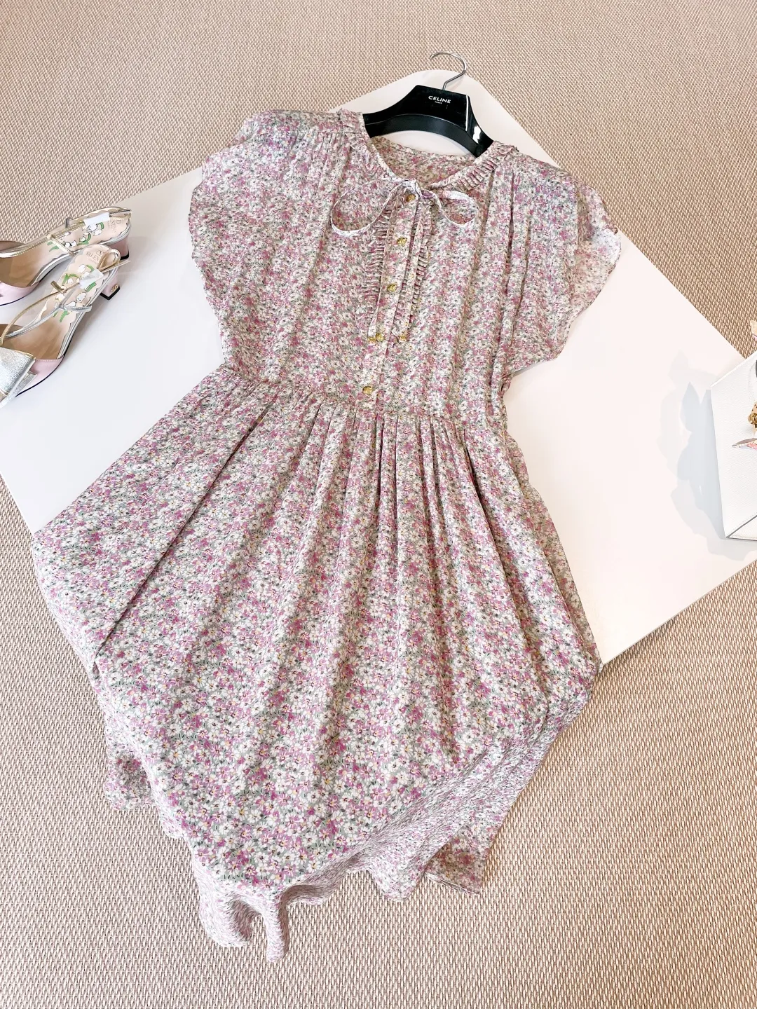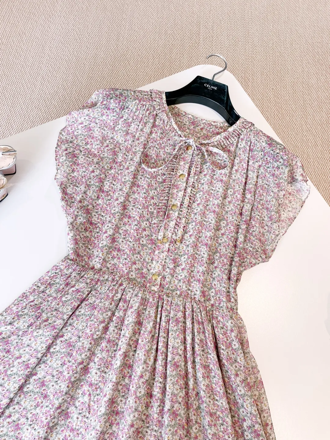 Погрузитесь в атмосферу летней нежности с этим шелковым платьем, сотканным из мечты и вдохновения. Легкое, воздушное, оно словно глоток свежего воздуха в знойный день. Все платье выполнено из тяжелого жоржета с деликатным мелким цветочным узором, который играет на свету, создавая эффект живой ткани. Этот сложный принт напоминает акварельные этюды, добавляя образу изысканности и романтизма. Особое очарование платью придает нежный кружевной воротник, который гармонично сочетается с изящной галстучной лентой у горловины, позволяющей регулировать степень открытости и создавать разные образы. Небольшие летящие рукава-крылышки добавляют образу легкости и кокетства, а их мягкие складки словно вторят движениям летнего ветра.