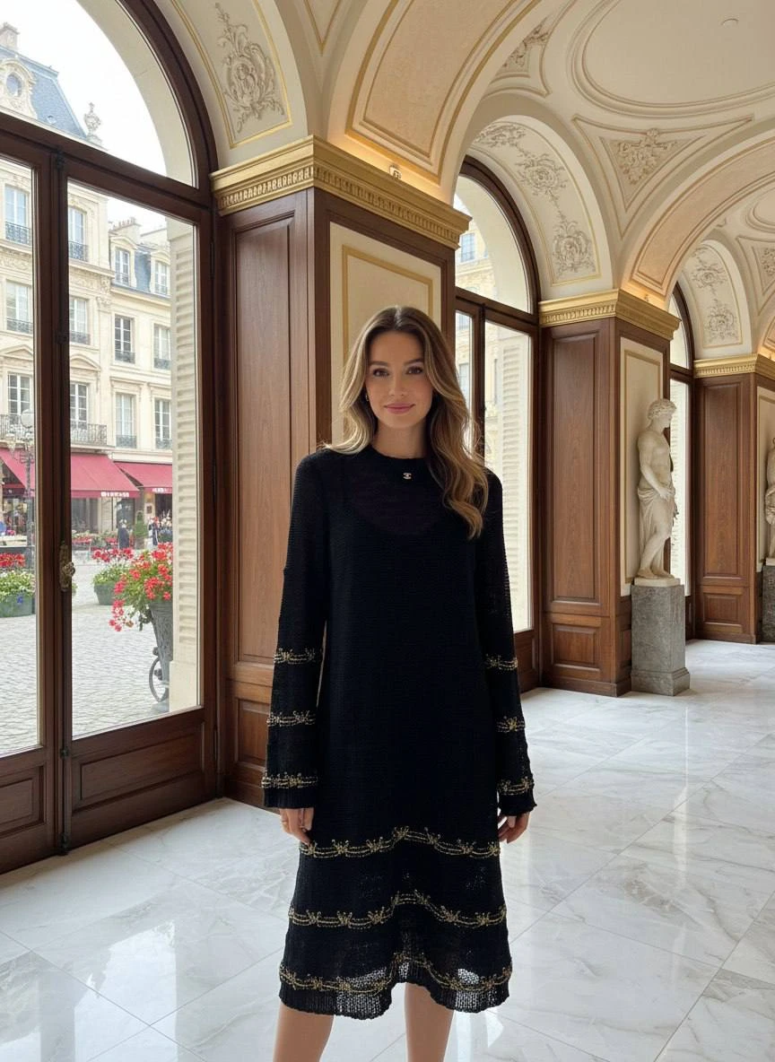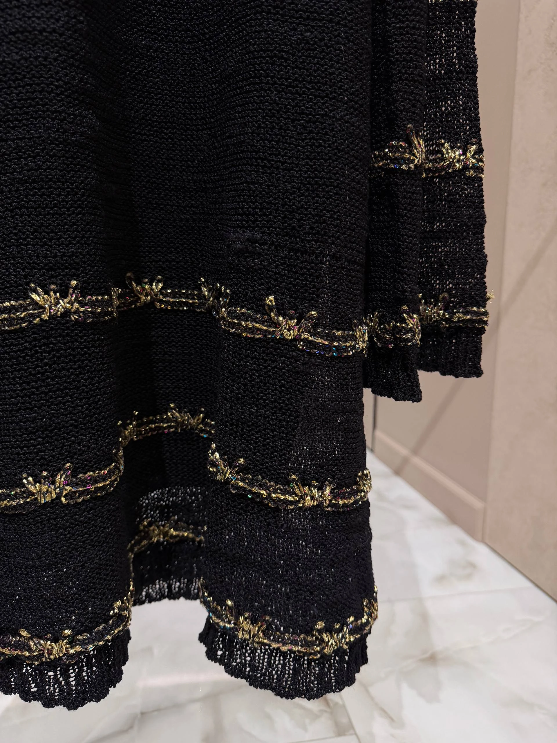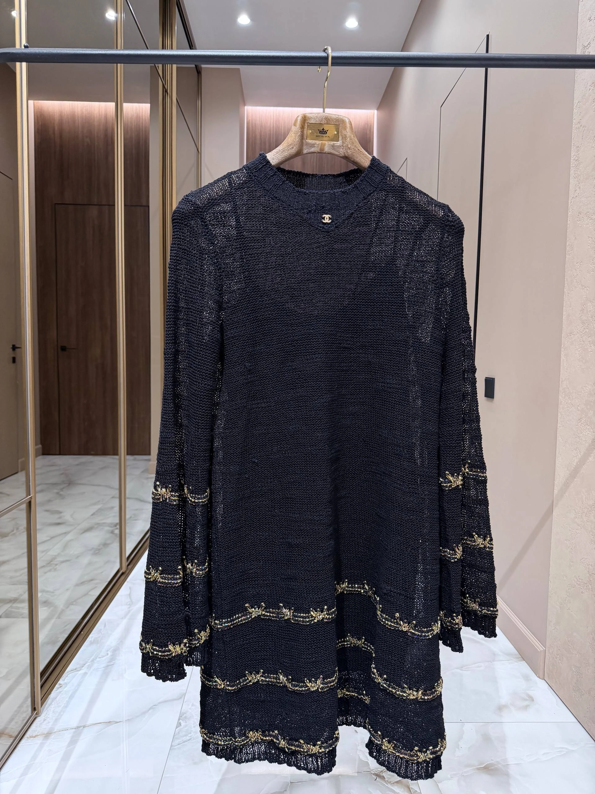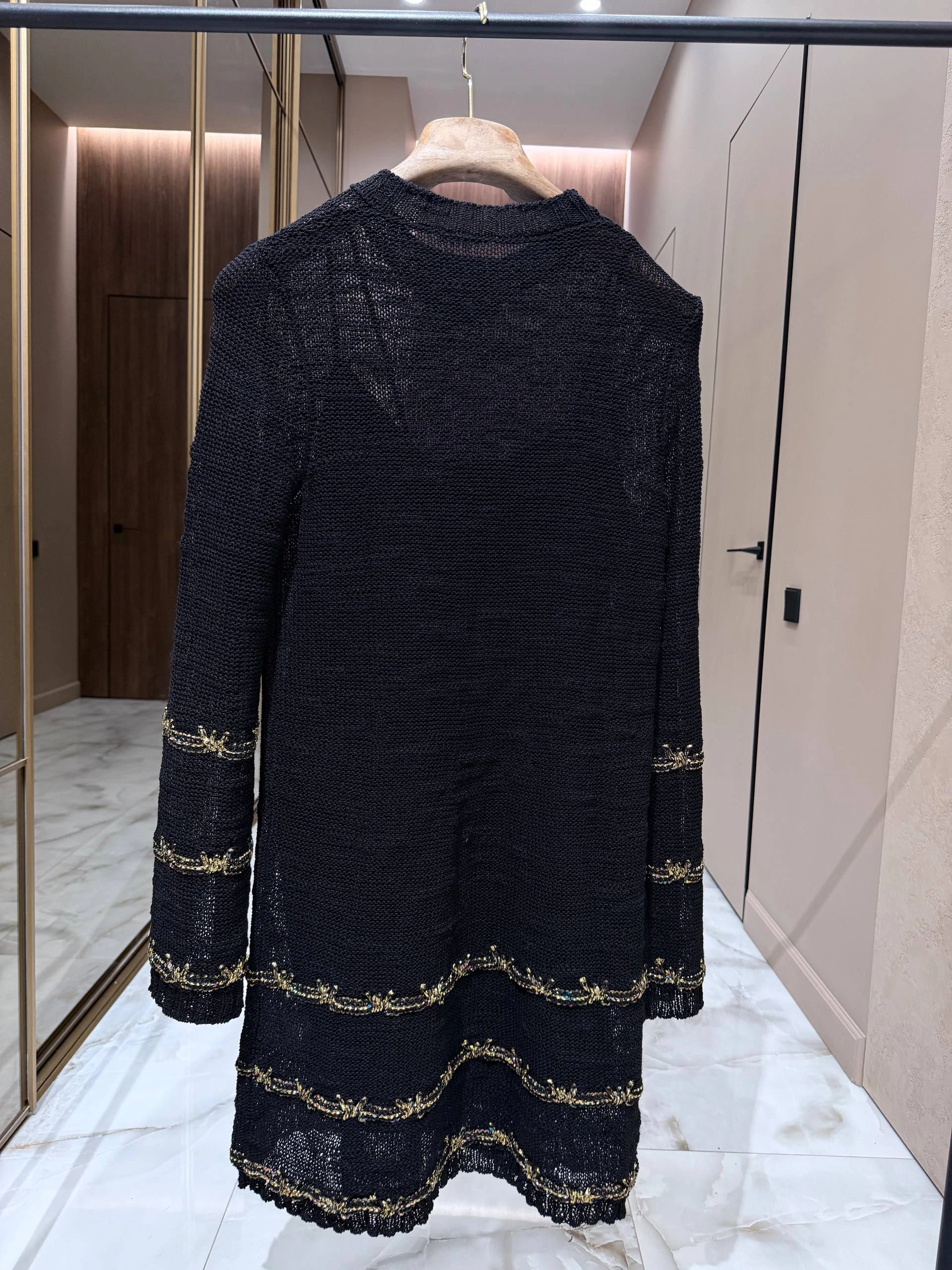 Элегантное женское платье свободного кроя выполнено из рыхлой вязаной ткани глубокого черного цвета с тонкими металлическими вставками. Мини‑длина и легкая «а‑силуэтная» форма создают изящный, одновременно расслабленный образ, а тонкие декоративные полосы с металлической нитью придают изделию характерный роскошный акцент.