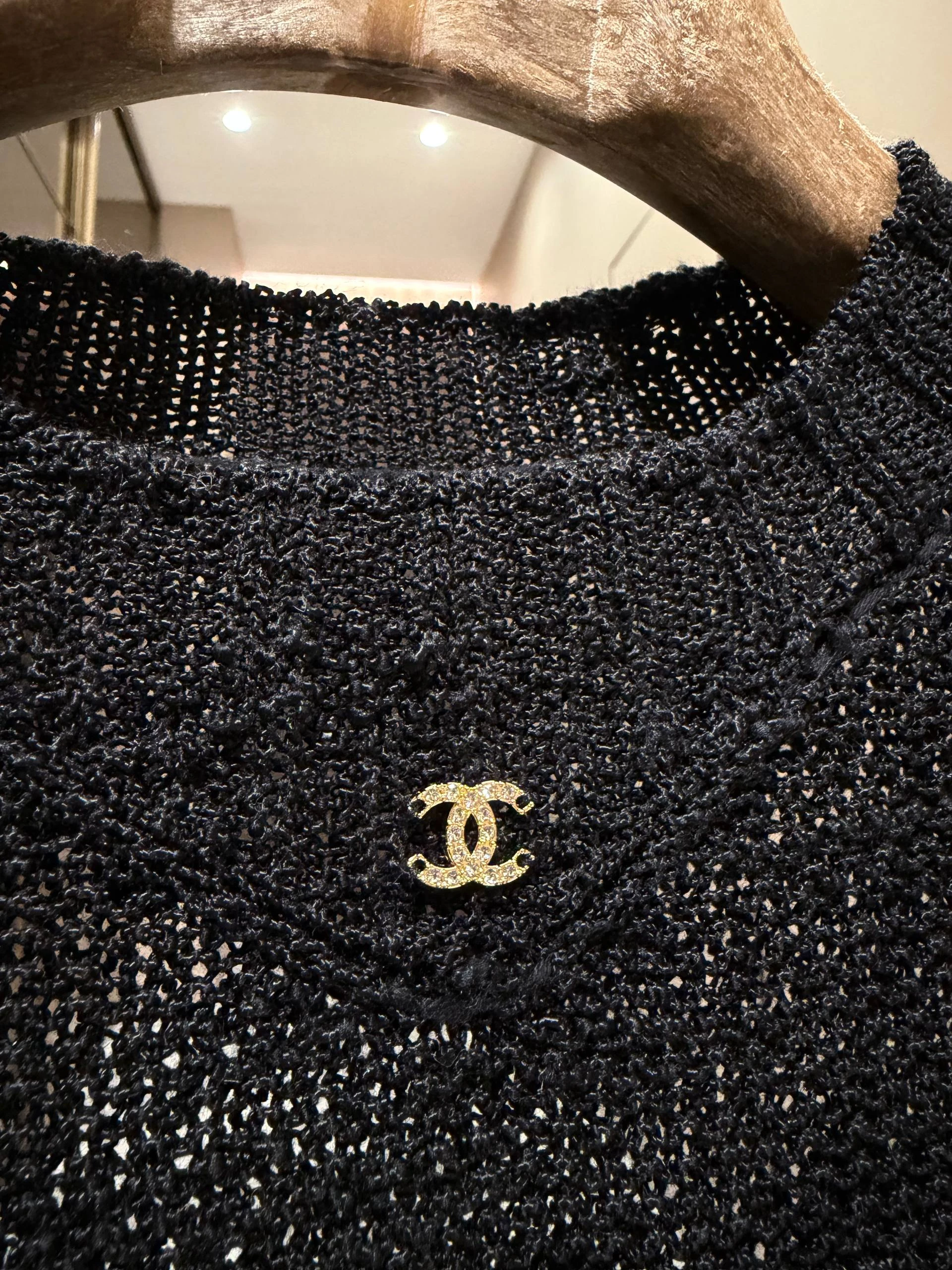 • Вырез: круглый, слегка утолщённая планка по горловине. В районе декольте — миниатюрная металлическая эмблема CC.