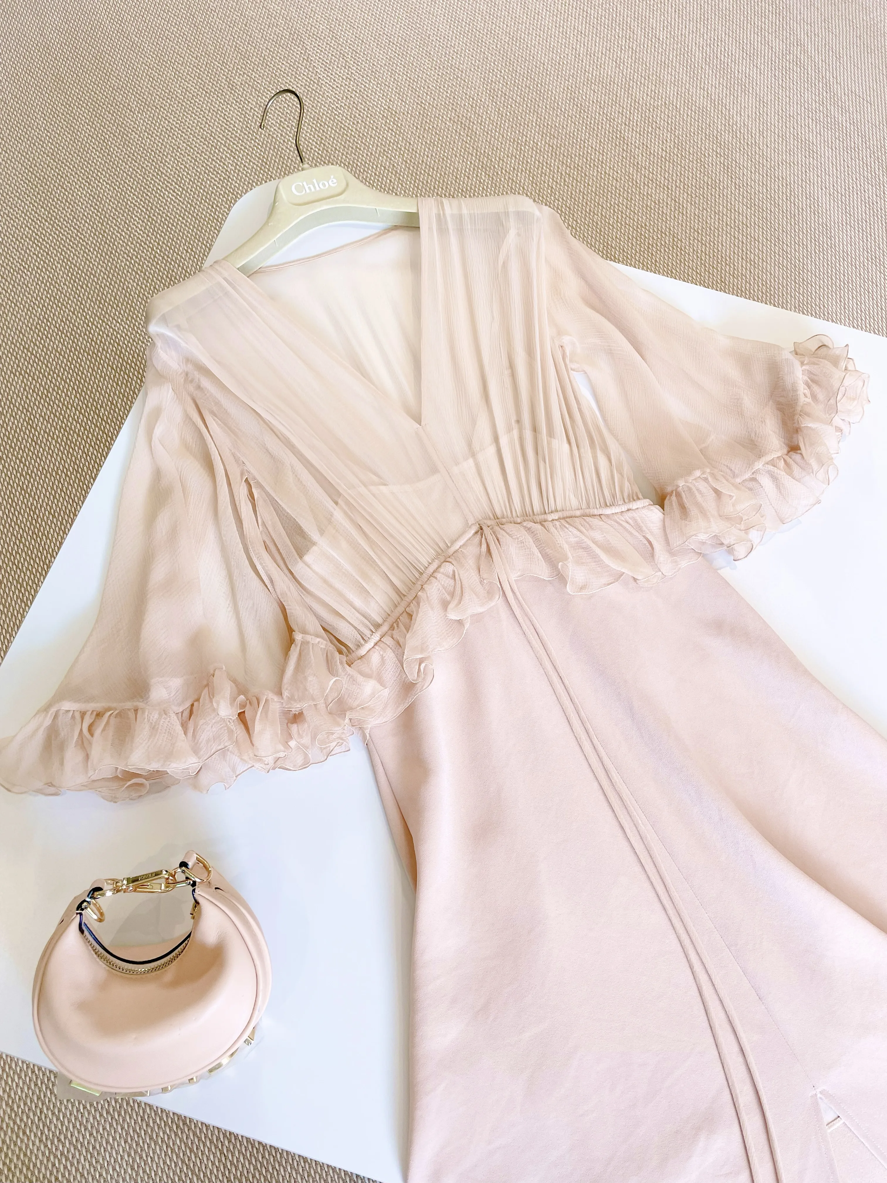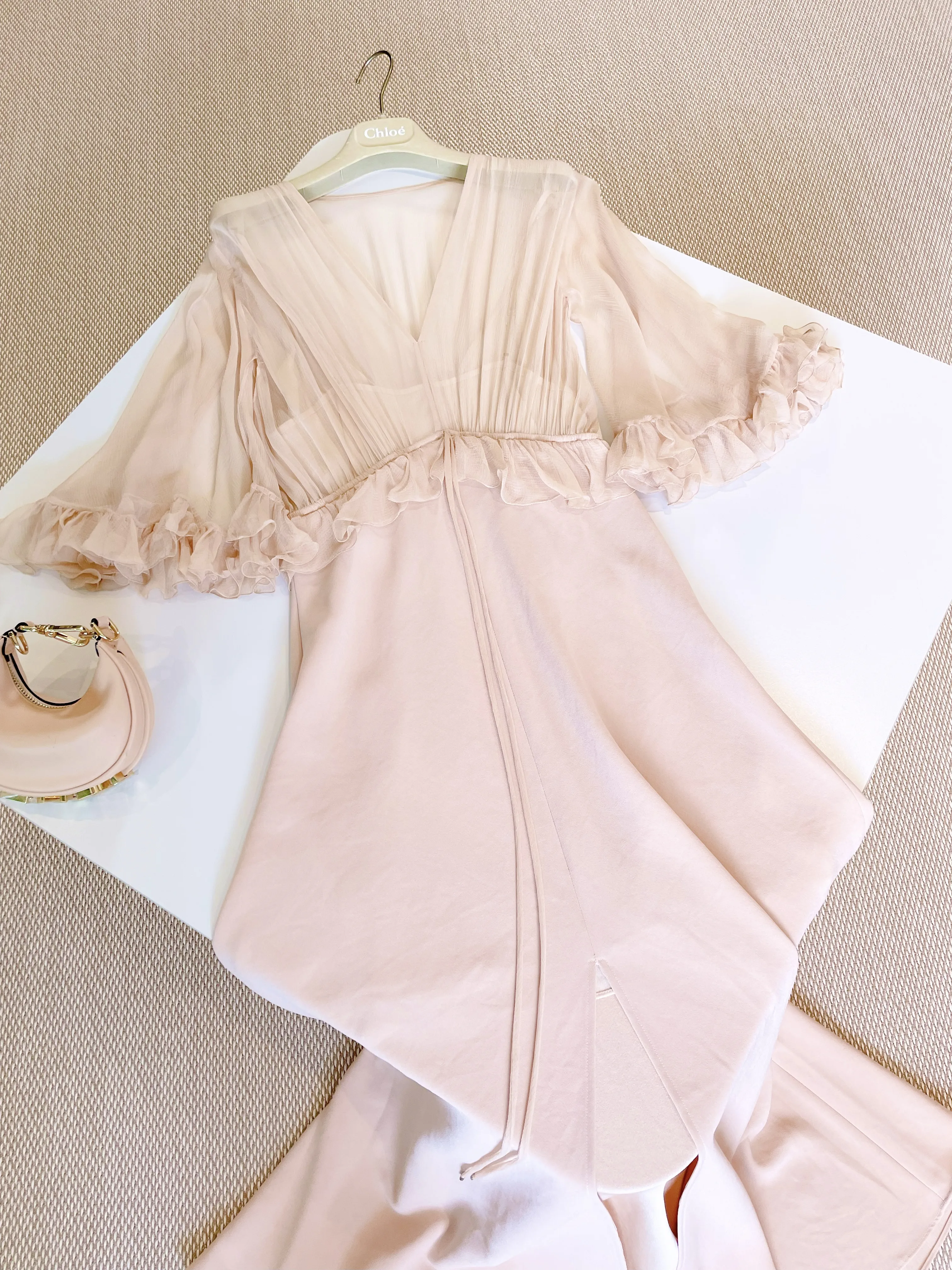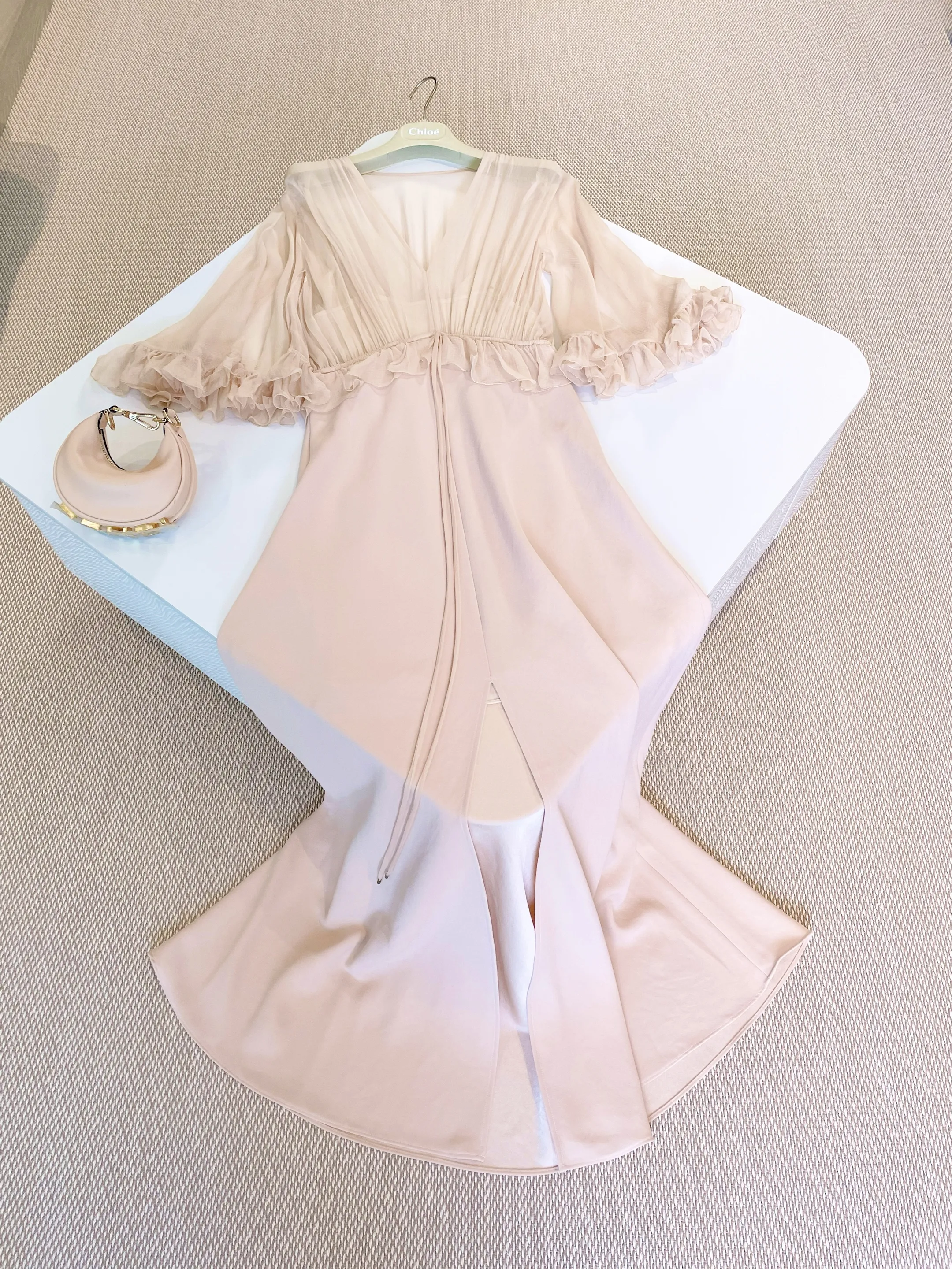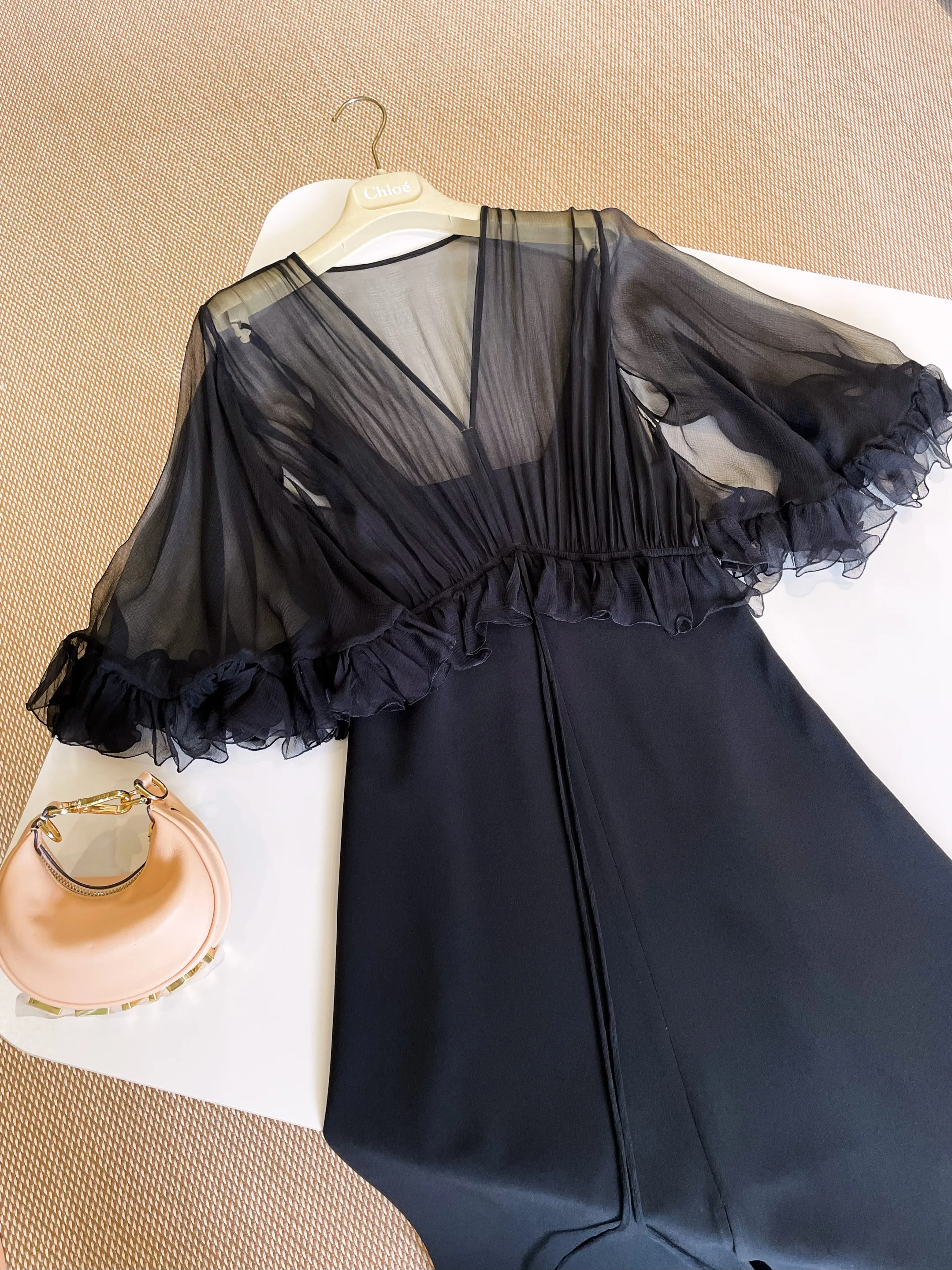 Женское платье CHLOÉ из шелка в стиле бохо впечатляет изысканностью и легкостью. Сочетание черного и телесного цветов создает магическую атмосферу и чарующий контраст. Глубокие V-образные кружевные рукава придают платью элегантность и утонченность, подчеркивая богемный стиль. Внутренняя подкладка гармонично сочетается с независимой перевязкой, позволяя создавать легкие летние образы и подчеркивая женственность. Это платье станет прекрасным выбором для особых случаев и романтических летних вечеров.