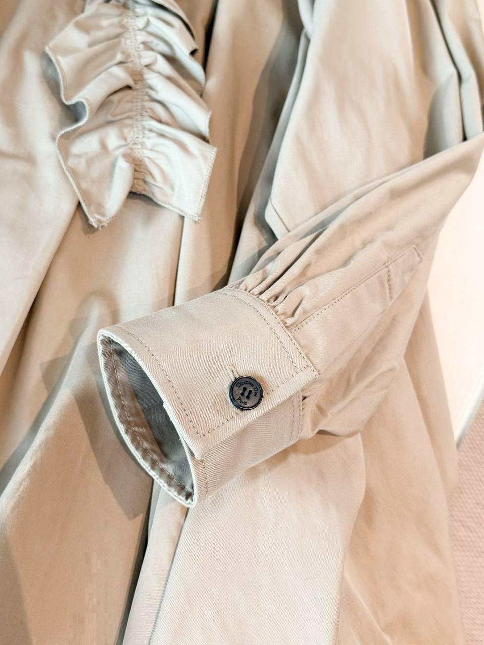 - Рукава: длинные, объёмные «фонарики» с манжетами и застежкой на пуговицы.