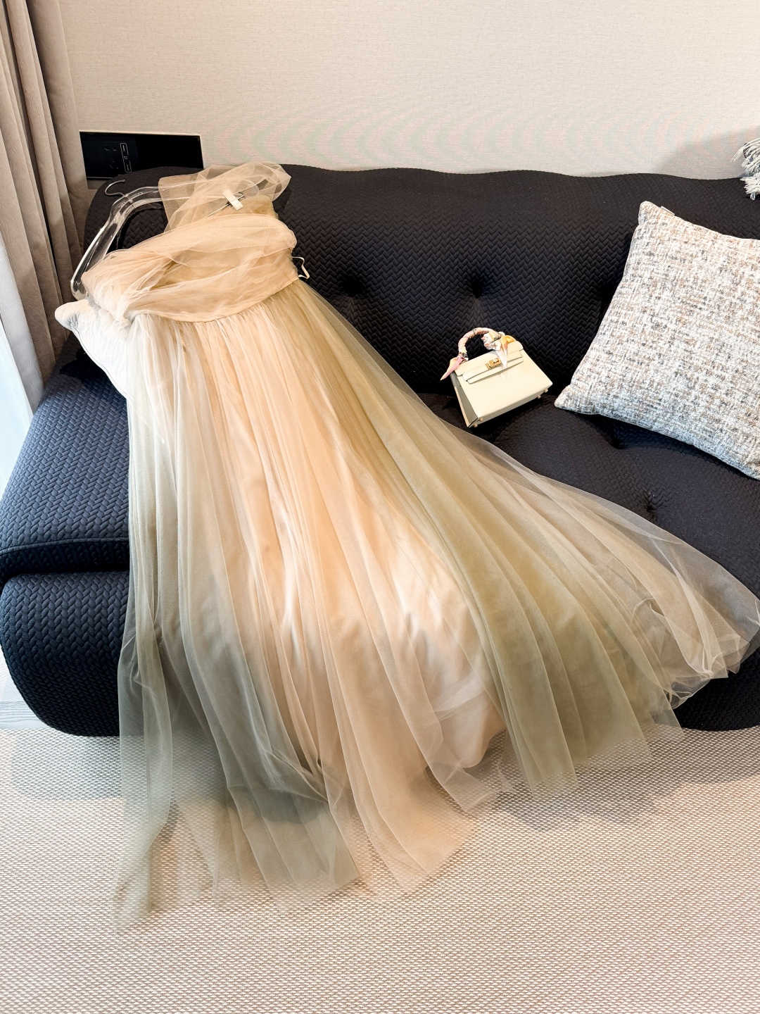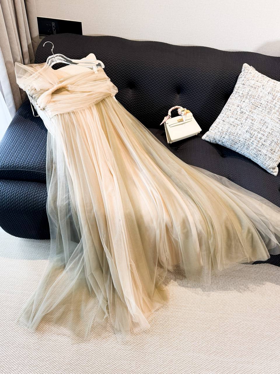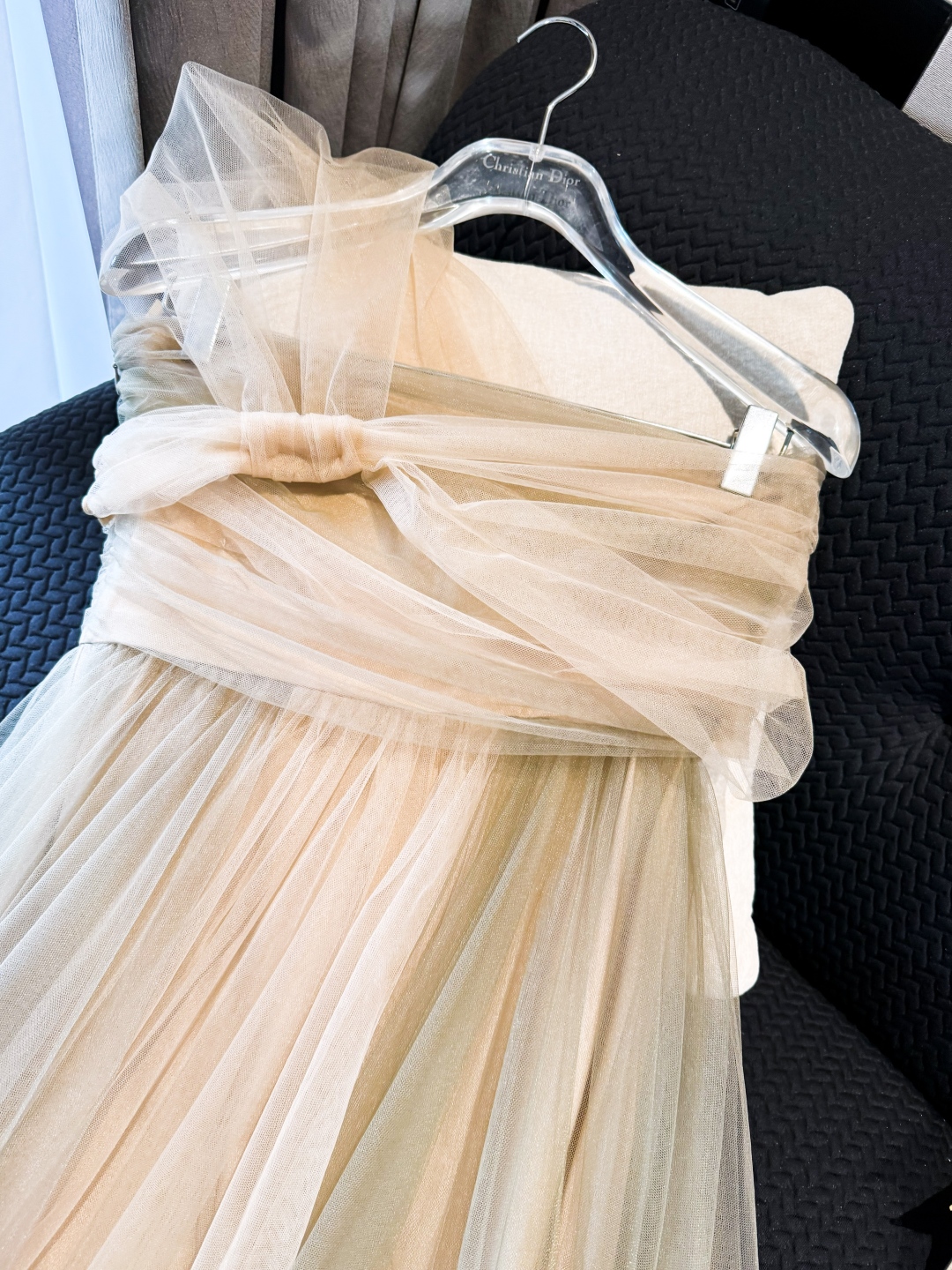 Платье Christian Dior выполнено из легчайшего полупрозрачного тюля нежного кремового оттенка. Модель обладает изысканным дизайном: лиф оформлен драпировкой и элегантно подчеркивает женственный силуэт, а расклешённая юбка свободно струится, создавая воздушный и романтичный образ.