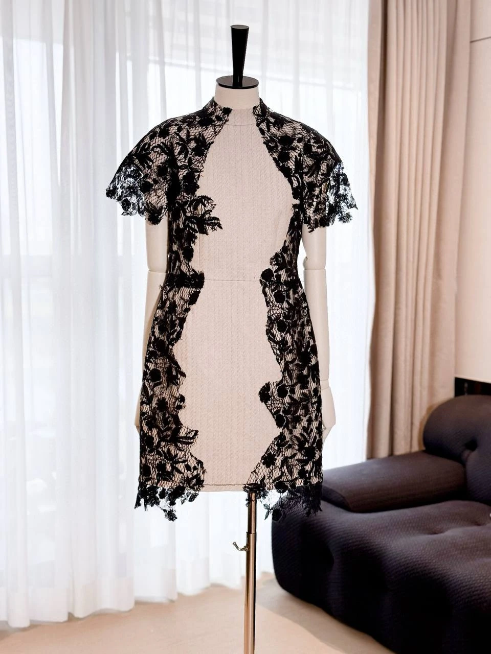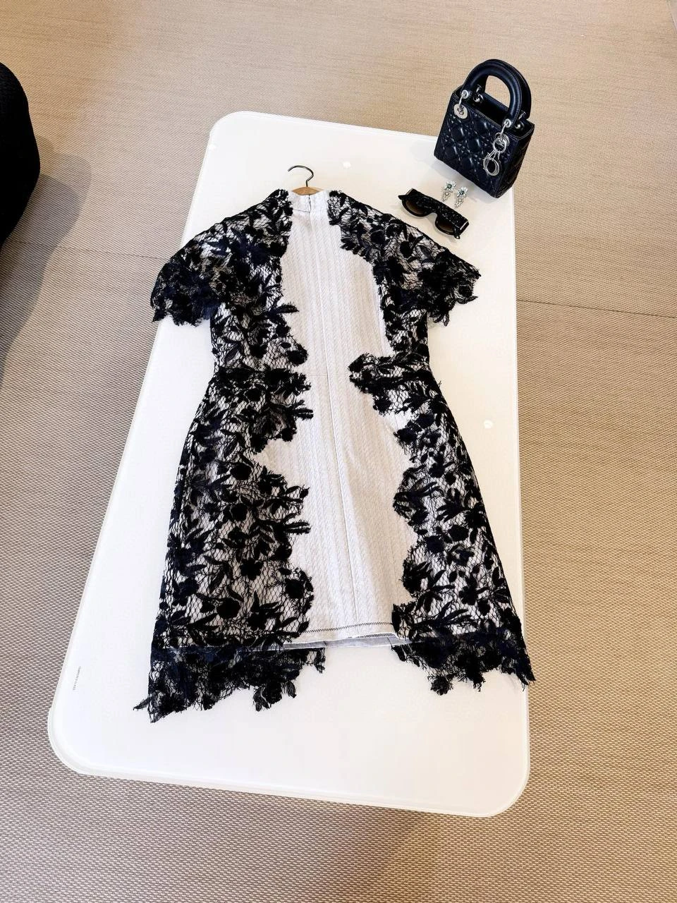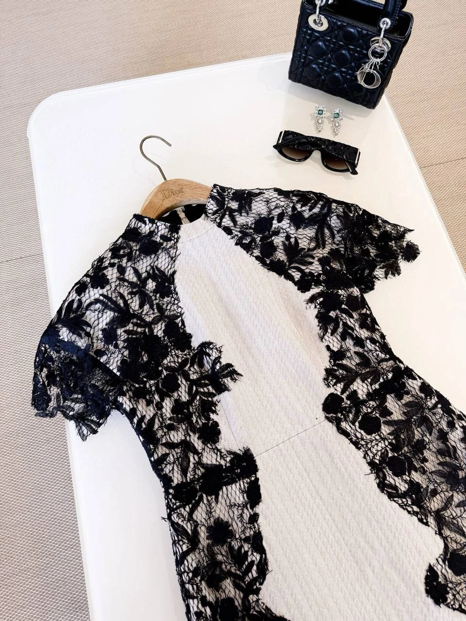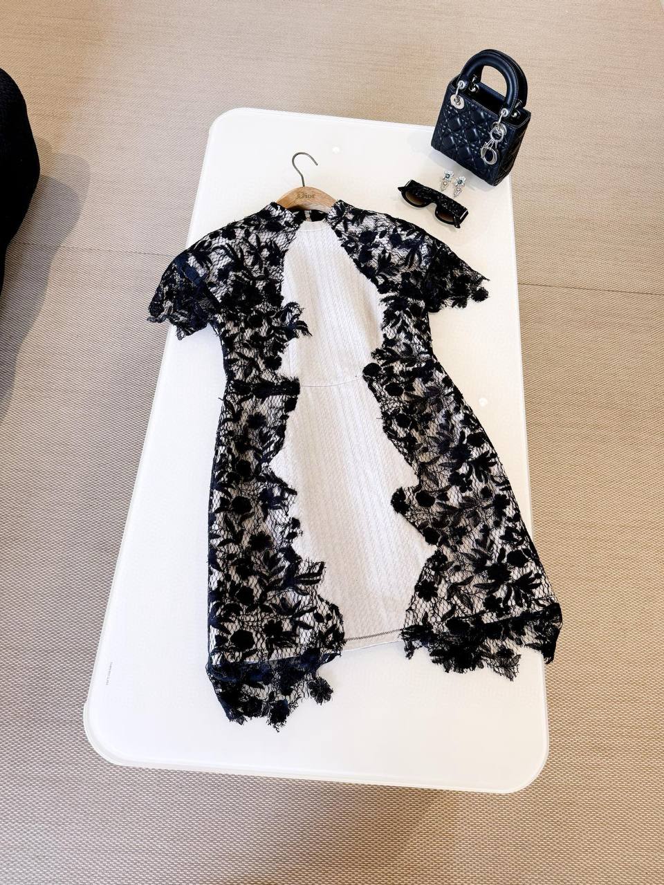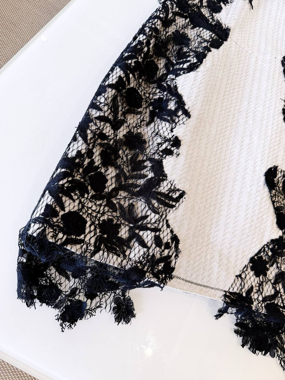 Изысканное коктейльное платье в духе Christian Dior, объединяющее чистые линии белой текстурированной основы и тонкое черное цветочное кружево. Идеально подходит для вечера, светского приема или особого случая — сочетает женственность и графическую строгость контраста.