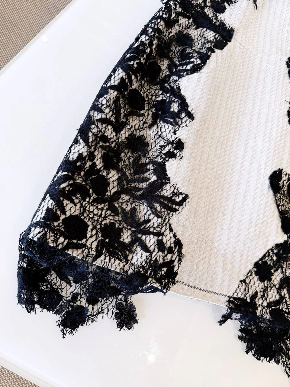 • Ткань: белая текстурированная жаккардовая основа создаёт структурированный фон и приятный тактильный эффект; поверх неё — чёрное кружево с выразительным цветочным узором, частично выступающее за край изделия для эффекта «небрежной» филировки.