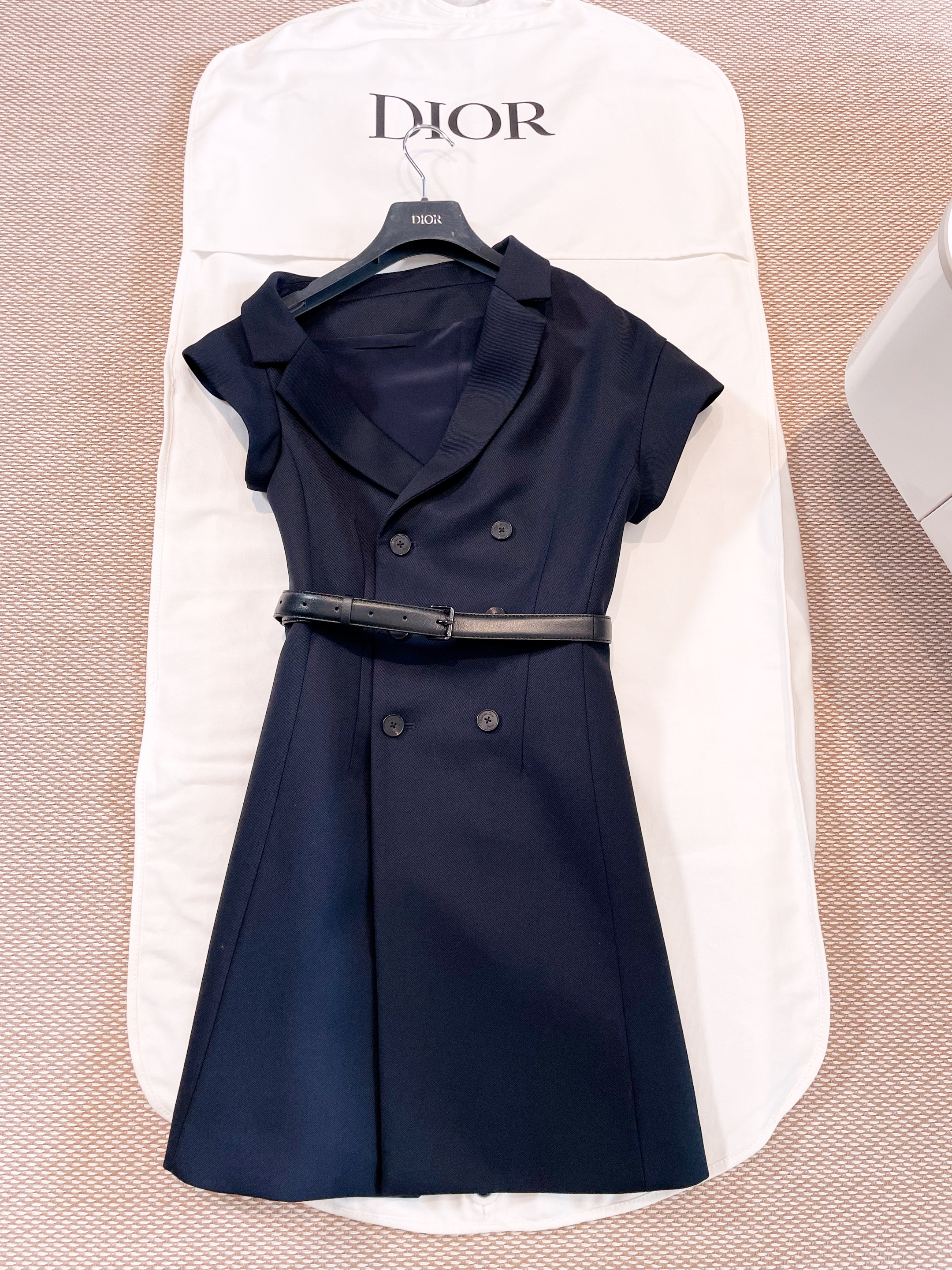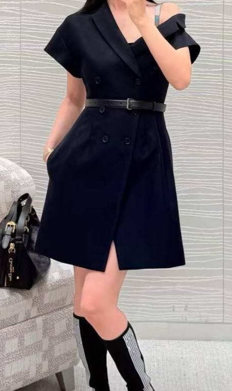 Почувствуйте дыхание весны и легкость лета в этом изысканном платье, выполненном из роскошного темно-синего шерстяного твида. Асимметричный вырез, соблазнительно открывающий плечо, придает наряду нотку смелой современности. Классический крой подчеркнут двубортной застежкой с фирменными пуговицами CD и элегантными заостренными лацканами. Легкие рукава-крылышки добавляют образу воздушности и женственности. Завершает ансамбль изящный черный пояс из натуральной кожи, подчеркивающий талию и создающий силуэт "песочные часы". Это платье – воплощение элегантности и стиля, идеально подходящее для самых запоминающихся моментов весны и лета.