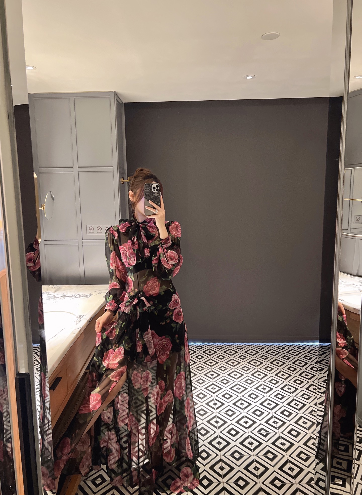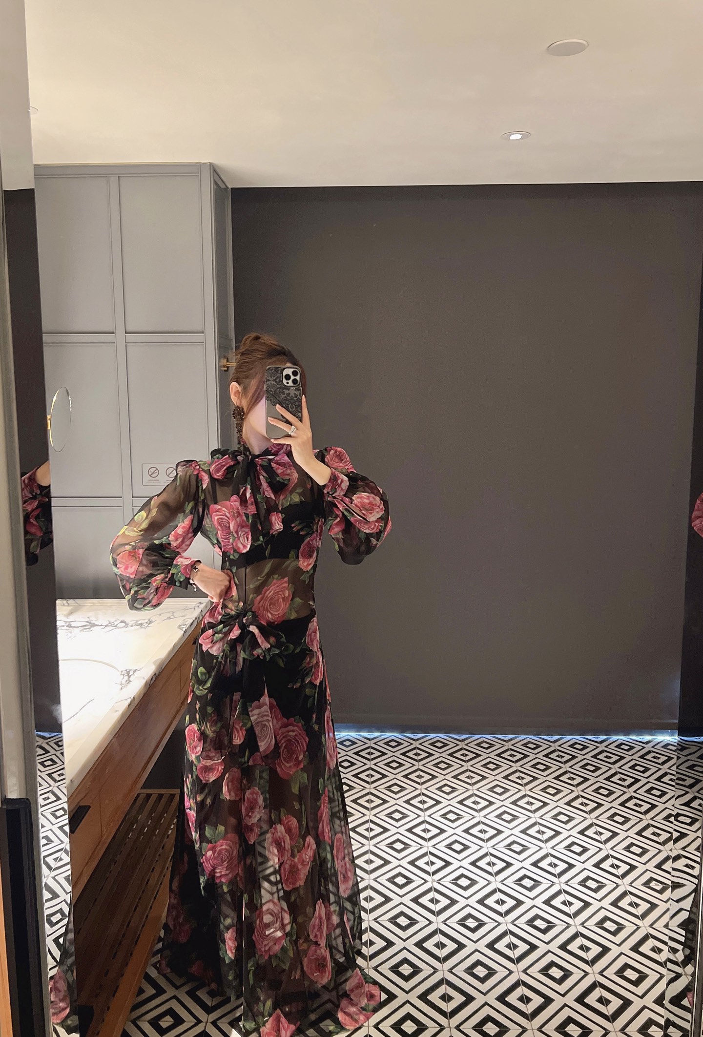 Очаровательное шелковое платье в пол, созданное для особенных моментов. Струящаяся ткань окутывает фигуру, а нежный принт розовых цветов на черном фоне создает романтичное настроение.
