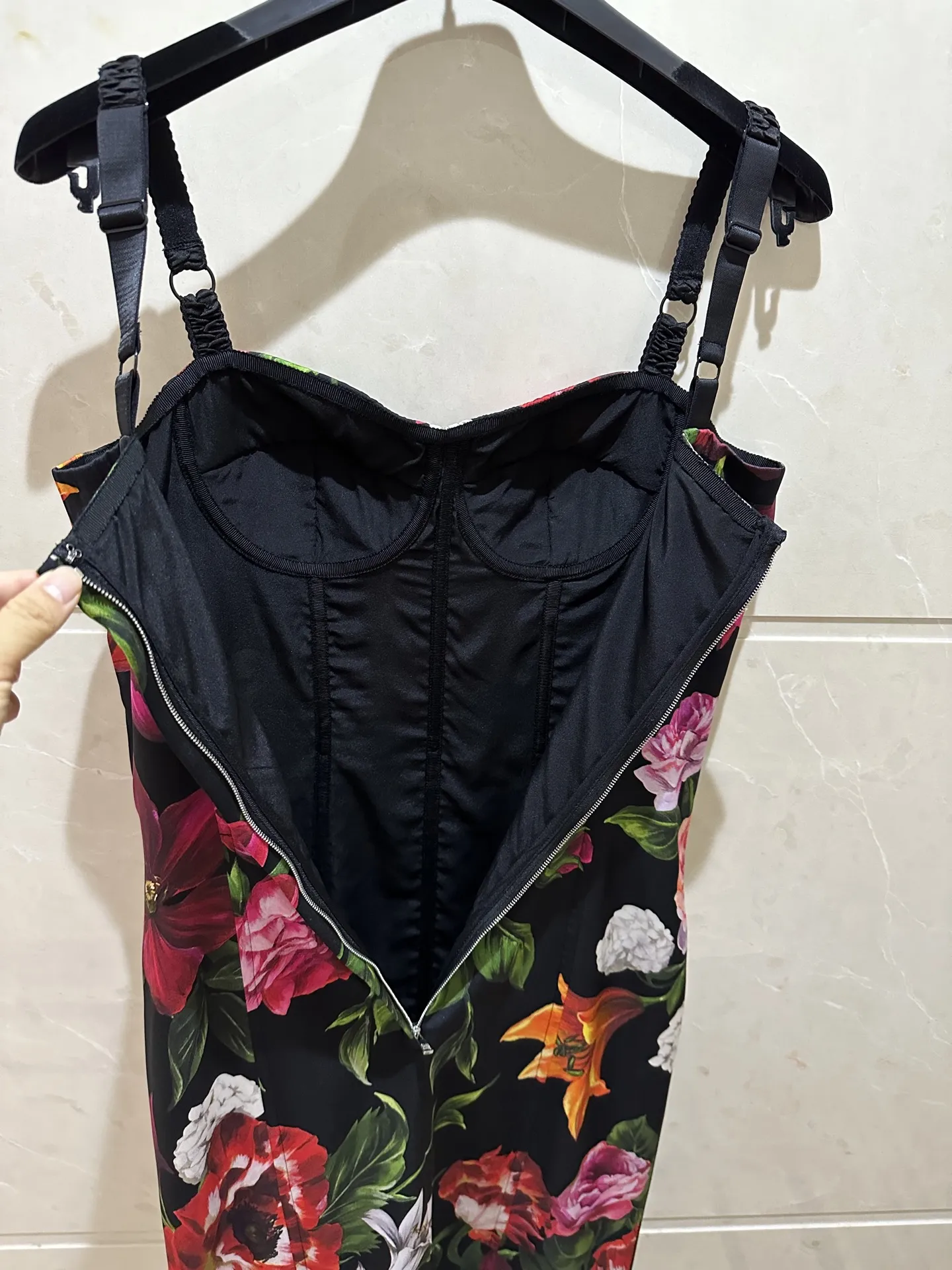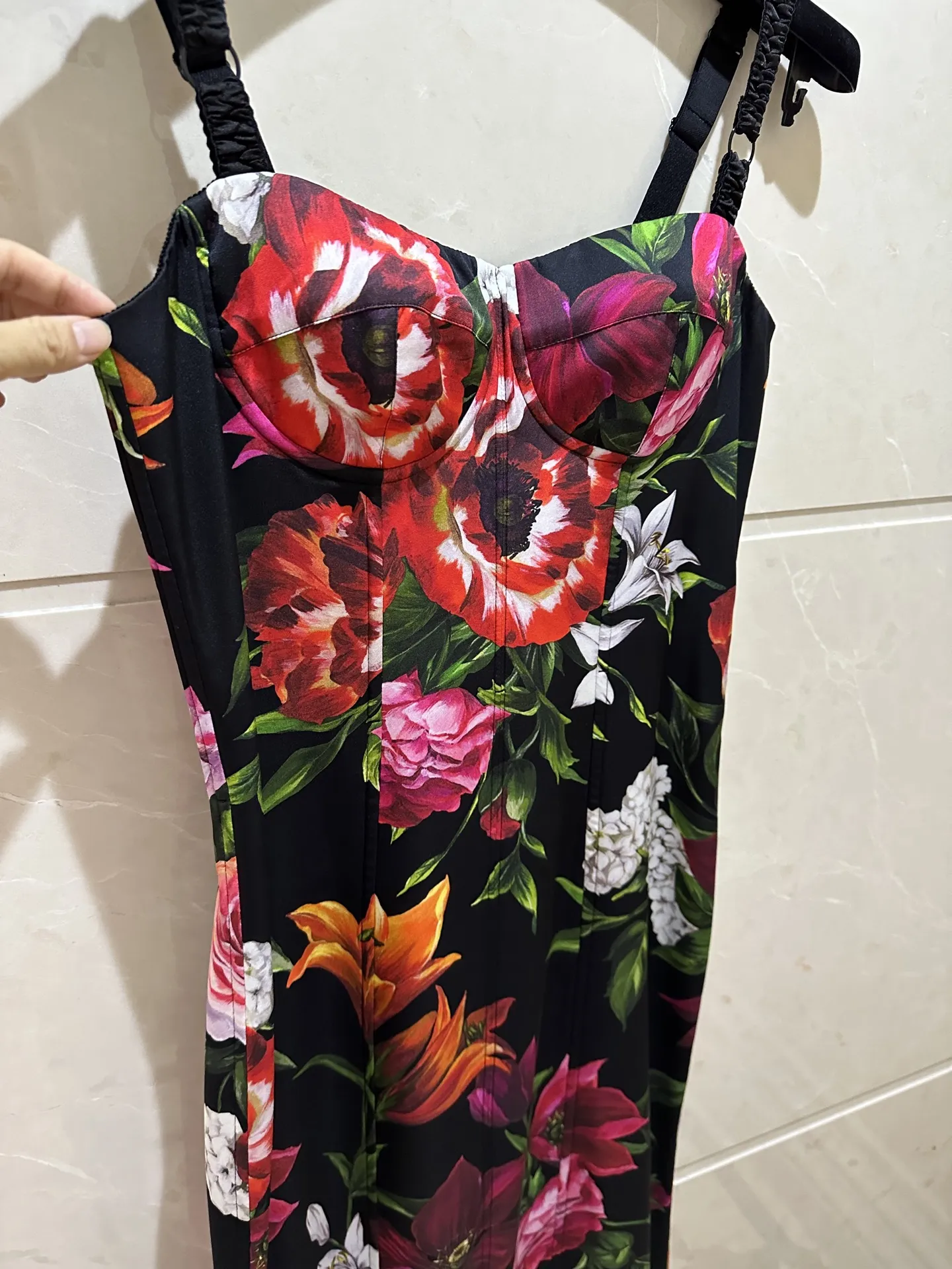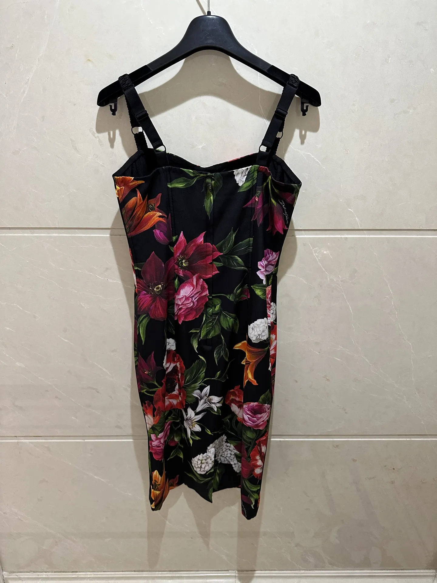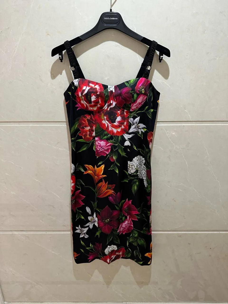 Роскошное платье Dolce & Gabbana из атласной ткани с ярким цветочным принтом. Модель выполнена в классическом силуэте, подчеркивающем фигуру. Широкие бретели с декоративными элементами придают платью шарм и оригинальность.