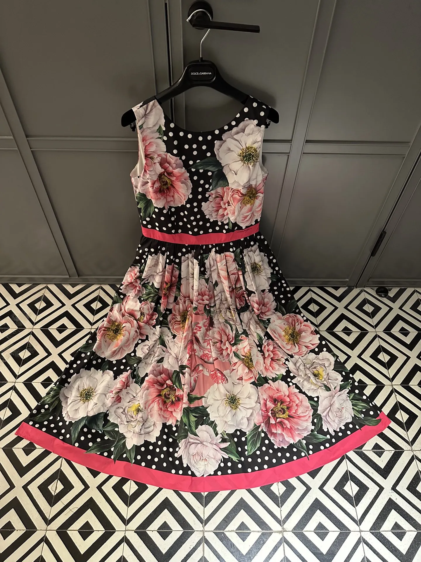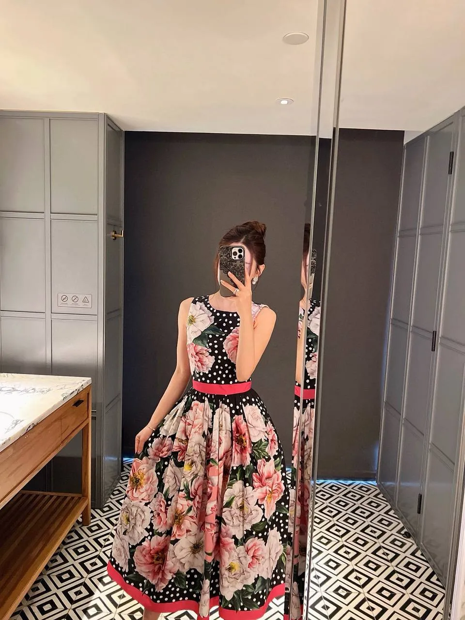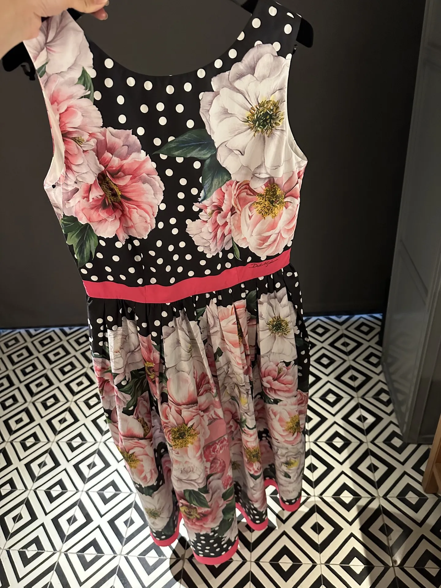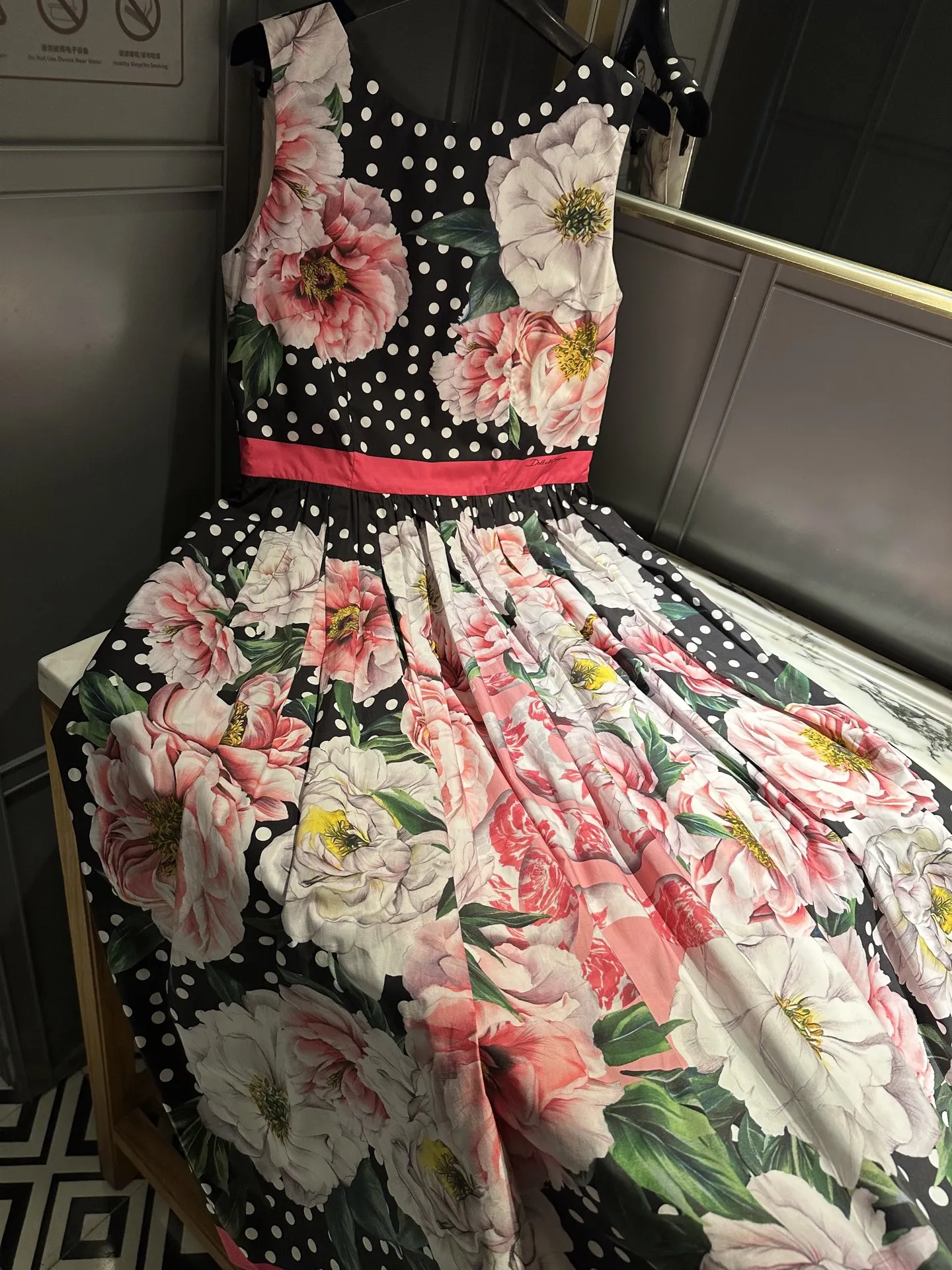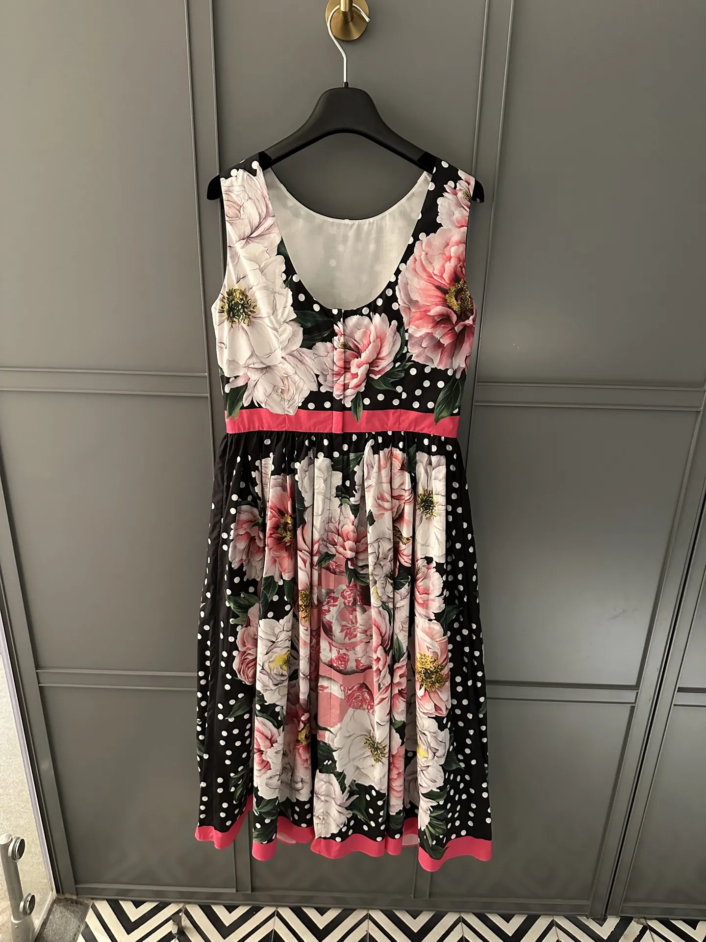 Платье без рукавов, выполненное из струящейся шелковой ткани. Основной фон платья украшен классическим принтом в горошек. Поверх горошка располагается яркий, крупный цветочный принт. Цветы выполнены в белых и розовых оттенках, создавая нежный и романтичный образ. Фасон платья позволяет подчеркнуть фигуру, а шелковая ткань обеспечивает комфорт и ощущение легкости.