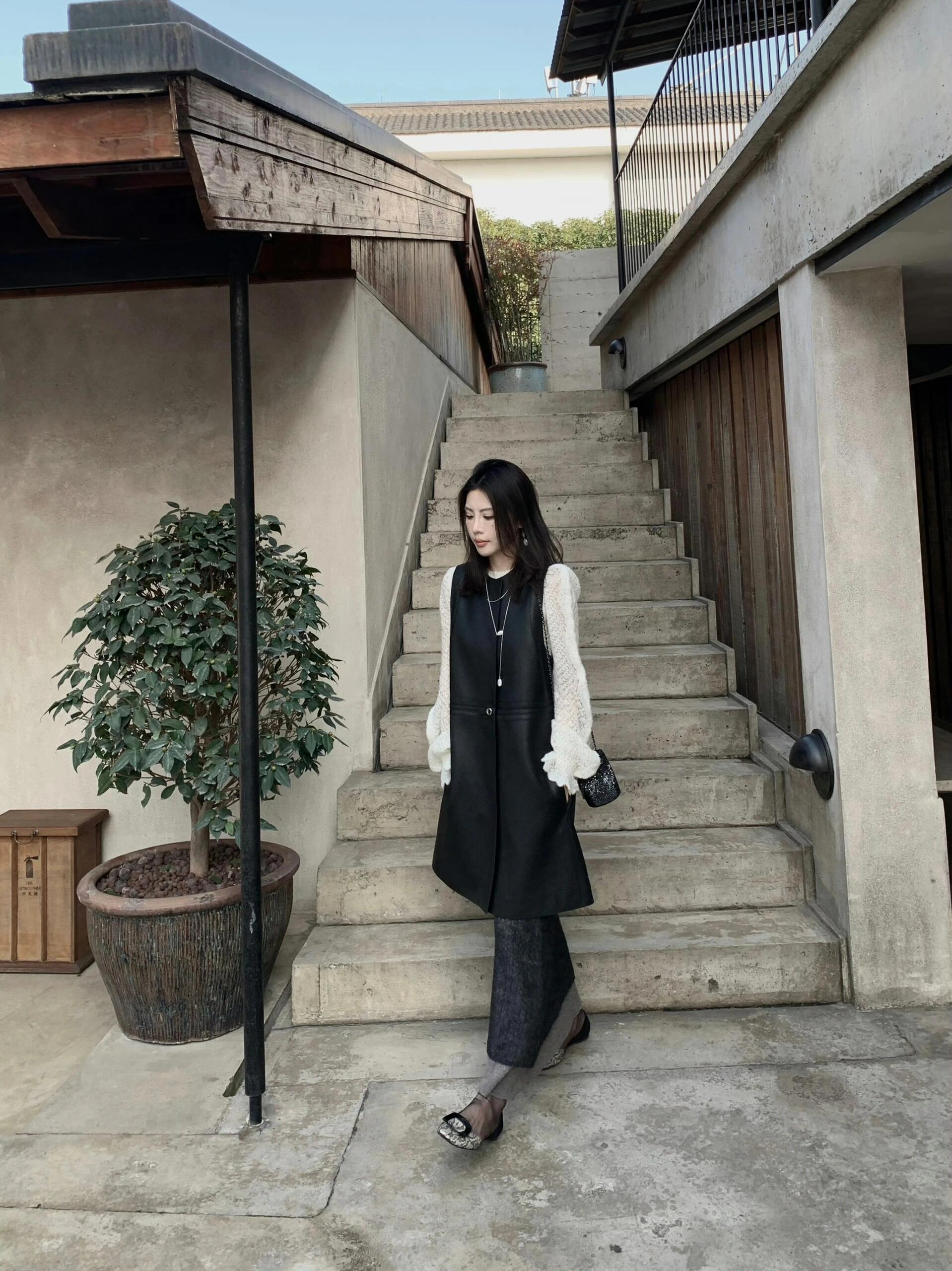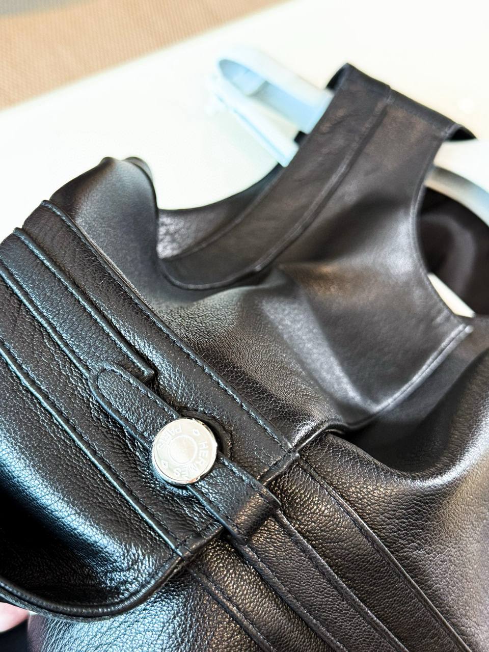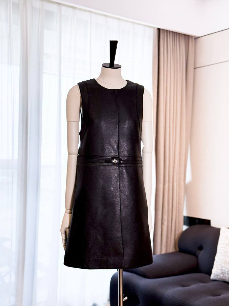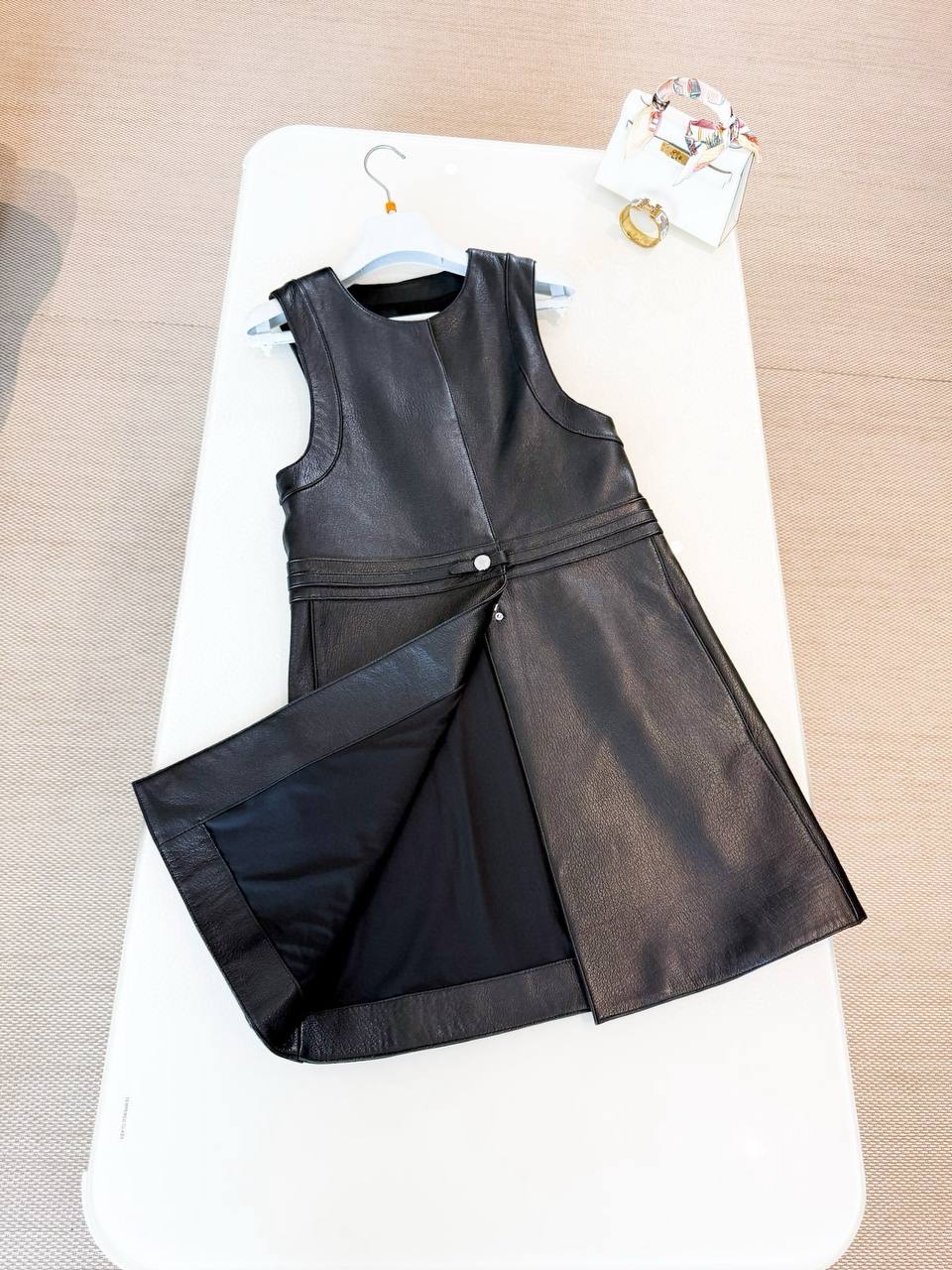 Элегантное платье-сарафан Hermès, выполненное из мягкой натуральной овчины насыщенного черного цвета. Лаконичный дизайн без рукавов подчёркивает утончённый стиль и акцентирует силуэт. На талии изящный декоративный ремешок с фирменной пуговицей Hermès. Прямой крой, округлый вырез горловины и минималистичные линии делают это платье универсальным выбором для вечерних выходов и повседневных образов. Изысканная отделка, премиальные материалы и безупречное качество — идеальный вариант для ценителей французской роскоши.
