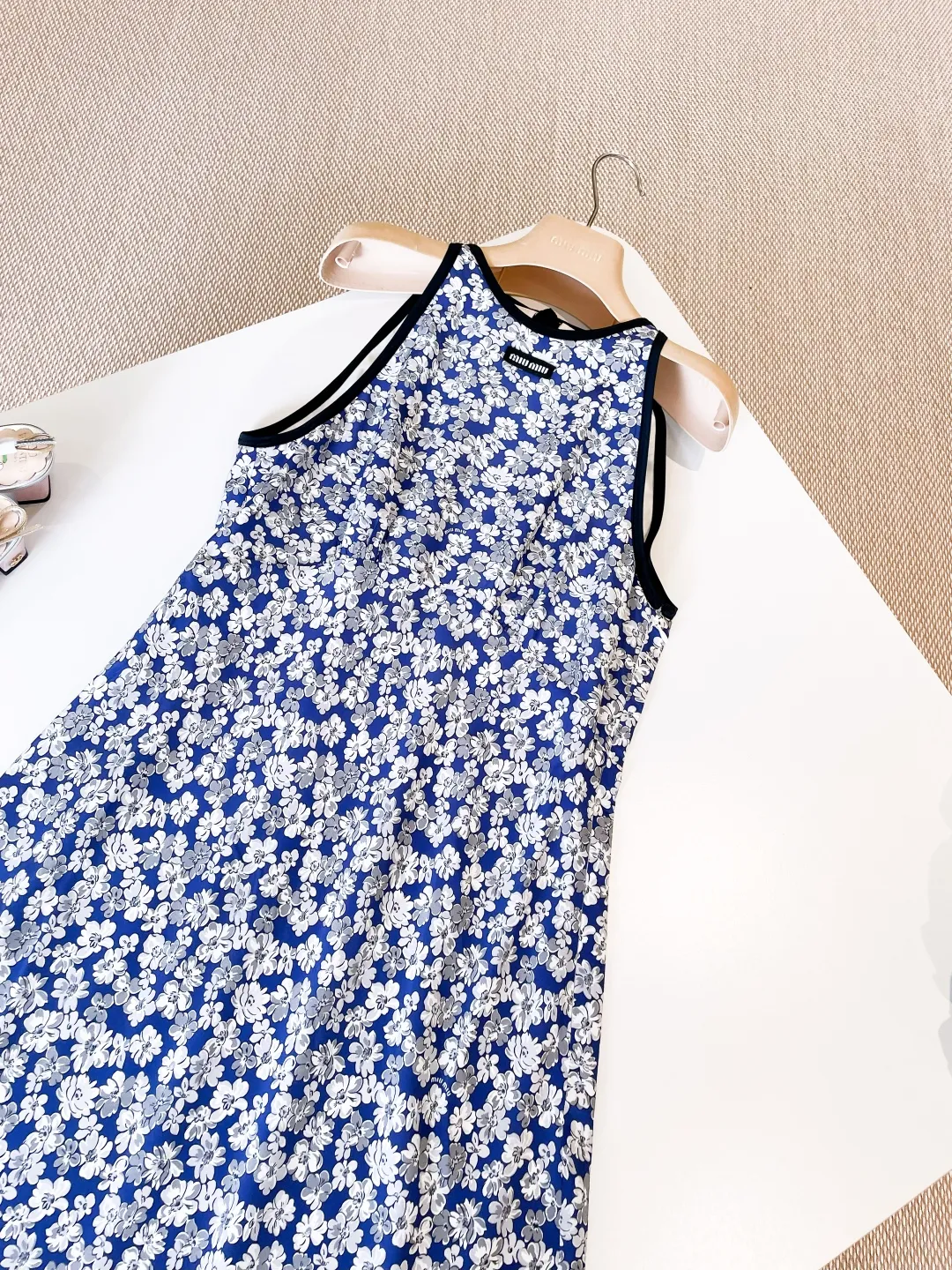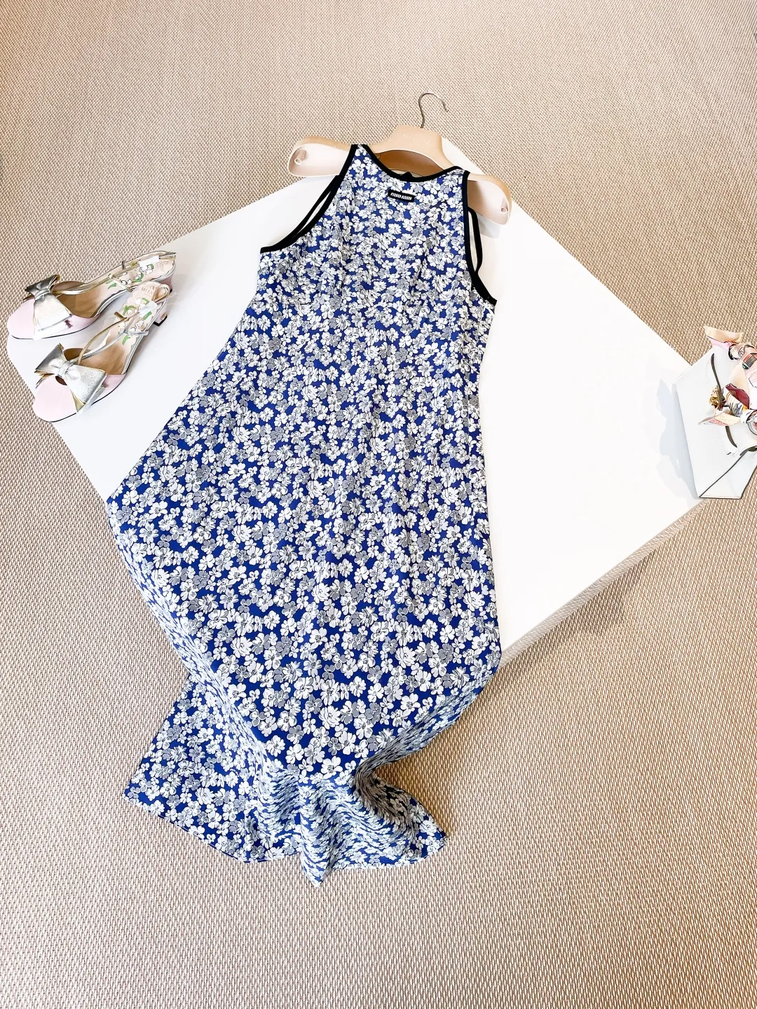 Погрузитесь в лето с этим восхитительным синим шелковым платьем. Легкая и воздушная шелковая ткань украшена ярким цветочным принтом, излучающим ретро шарм и свежую, естественную элегантность. Дизайн без рукавов и вырез халтер подчеркивают плечи и шею, создавая изящный и женственный силуэт.
