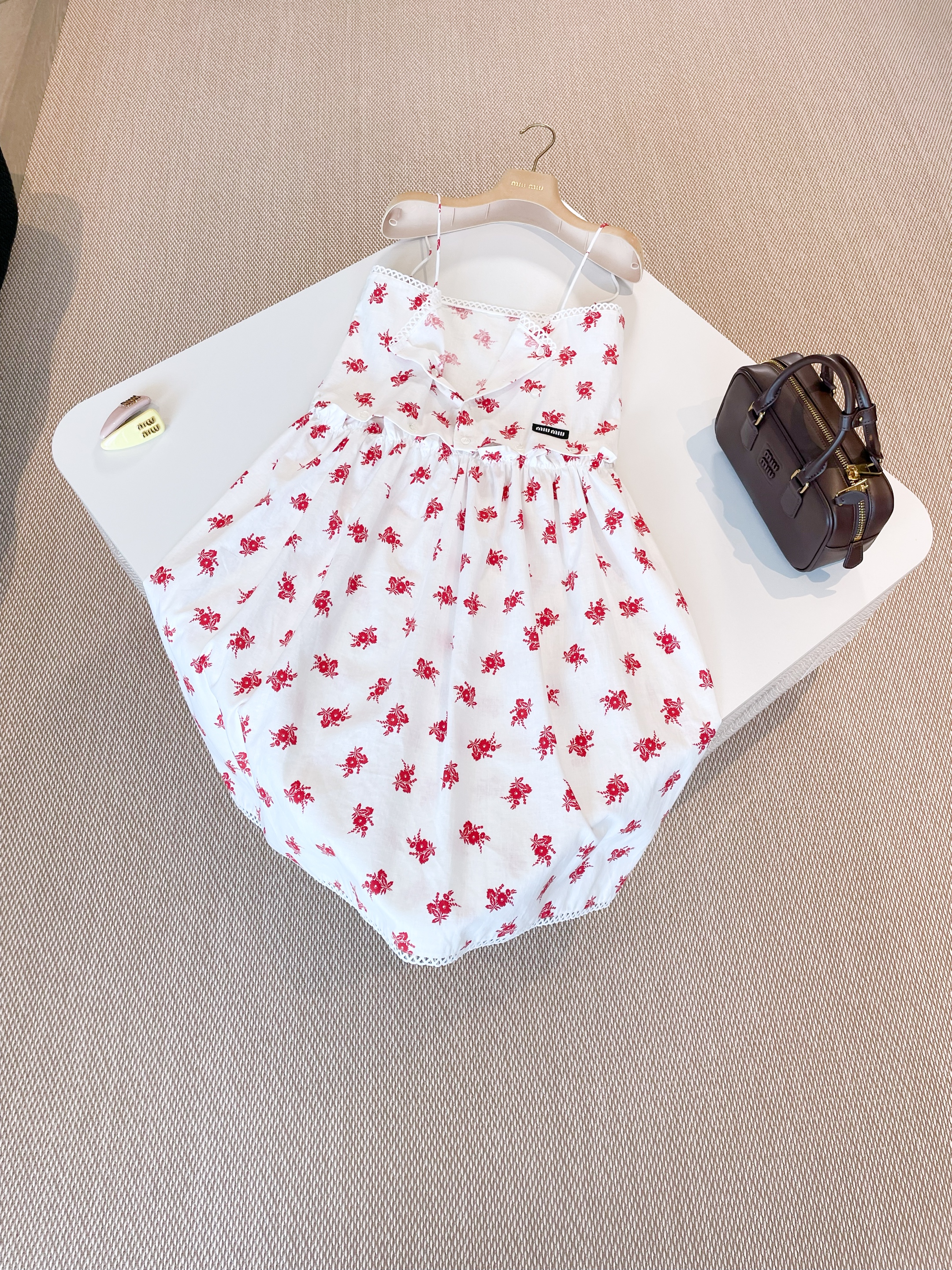 Белый фон украшен мелким цветочным принтом в красно-розовых тонах, придавая образу свежесть и женственность. Легкие бретели добавляют воздушности, а свободный крой позволяет чувствовать себя непринужденно. Платье прекрасно подойдет как для прогулок по городу, так и для отдыха на побережье.