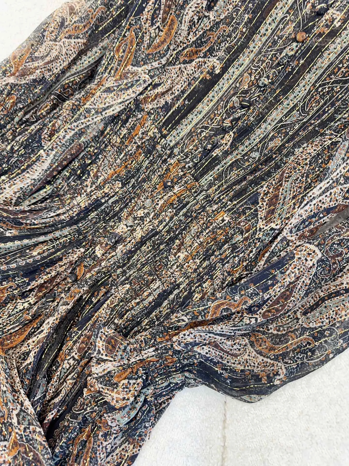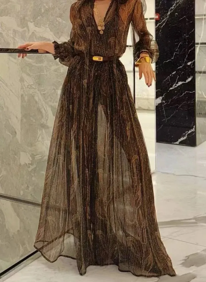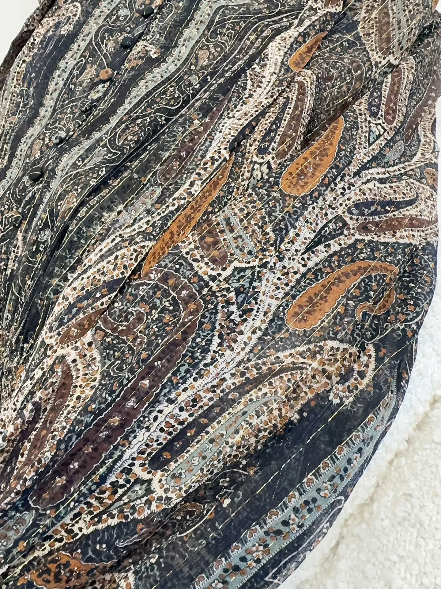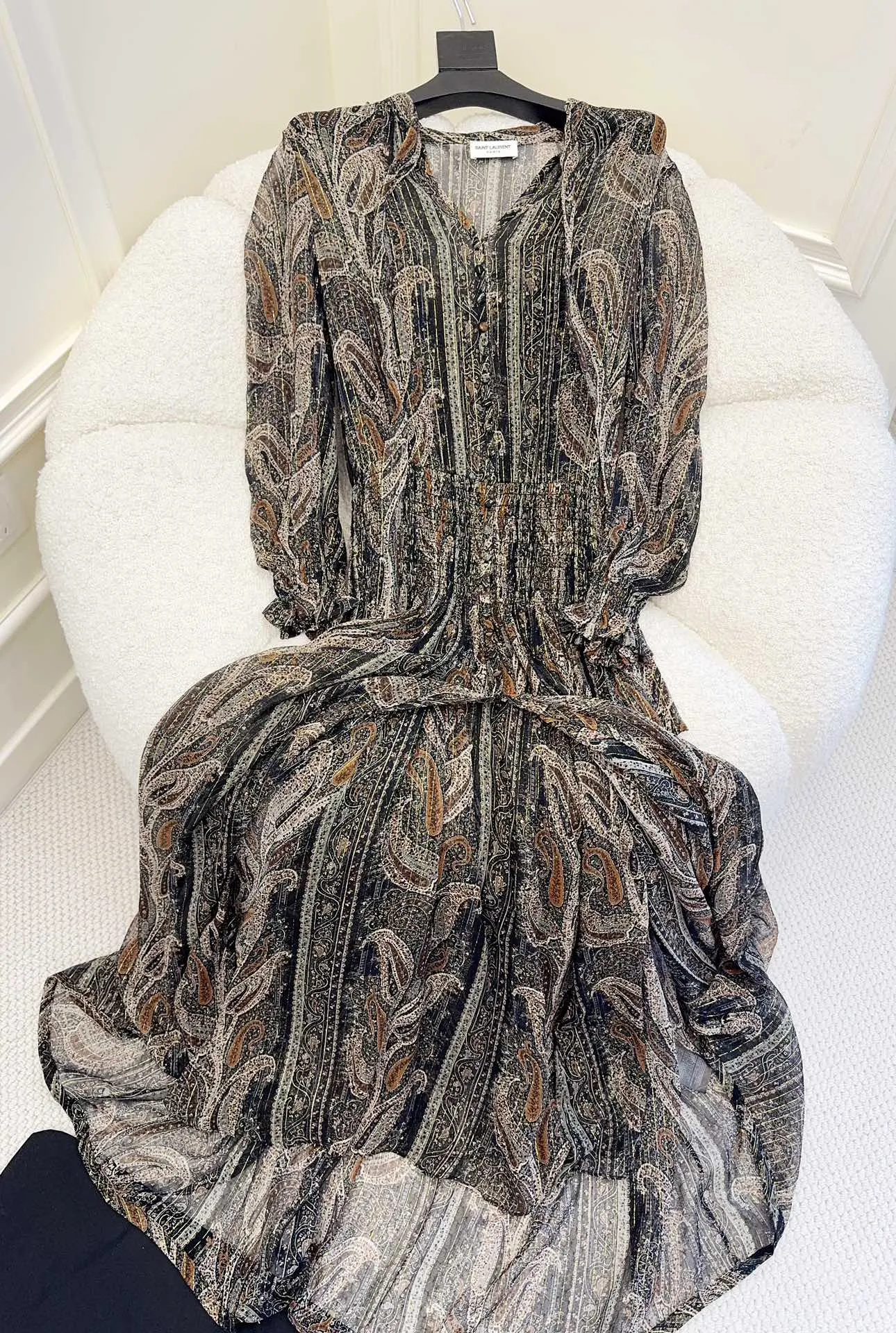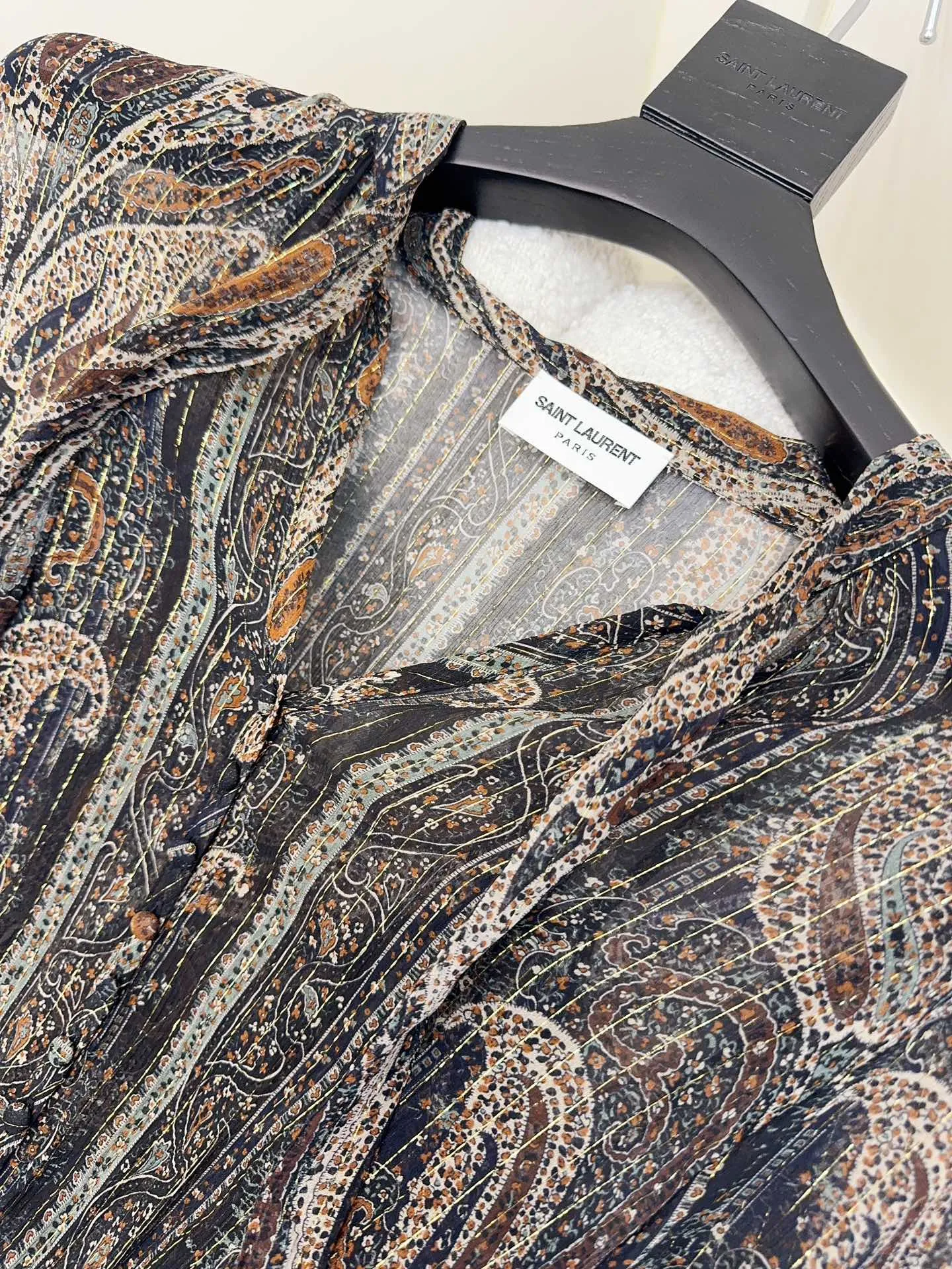 Представляем новое платье от Yves Saint Laurent, которое станет глотком свежего воздуха в мире высокой моды. Тончайшая ткань из шелка, словно создана для того, чтобы подчеркнуть вашу грацию и изящество. Восхитительный принт с цветком кешью, выполненный с добавлением золотой нити, добавляет изысканности и роскоши.