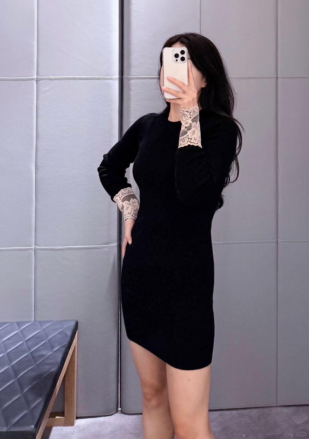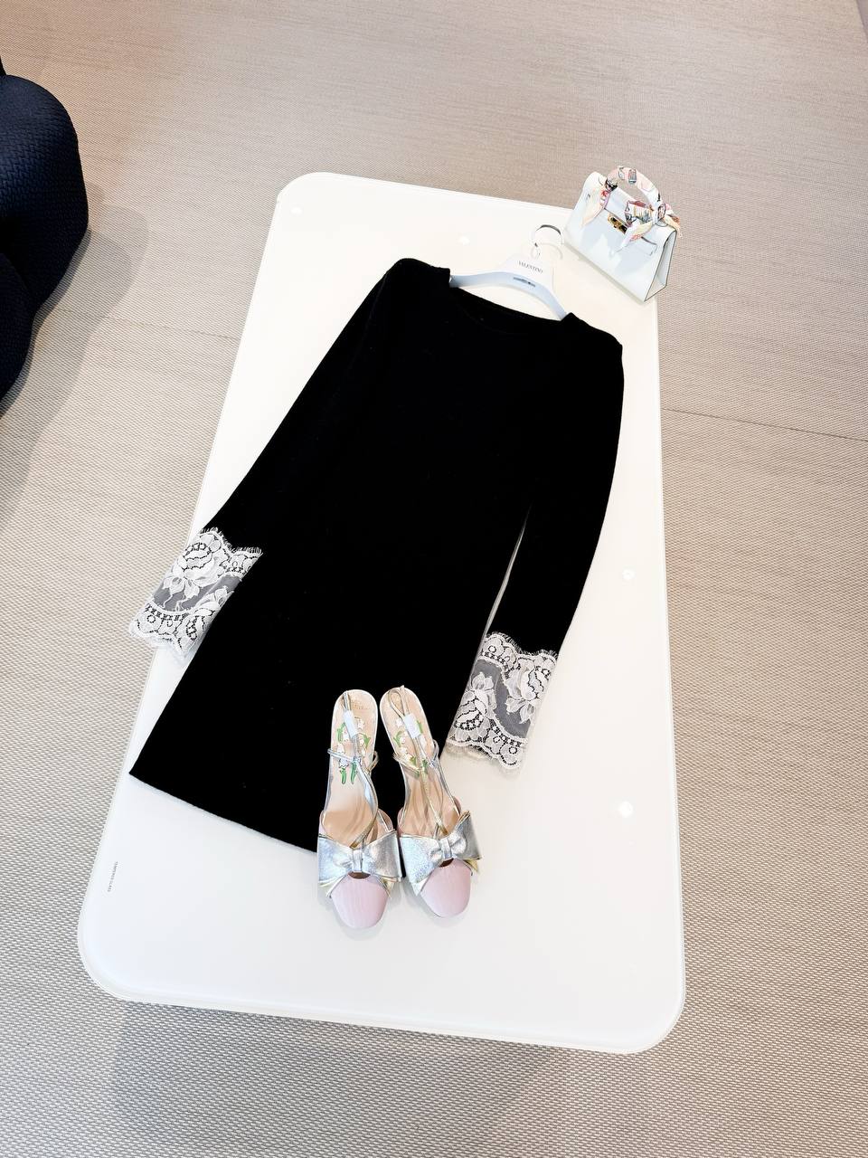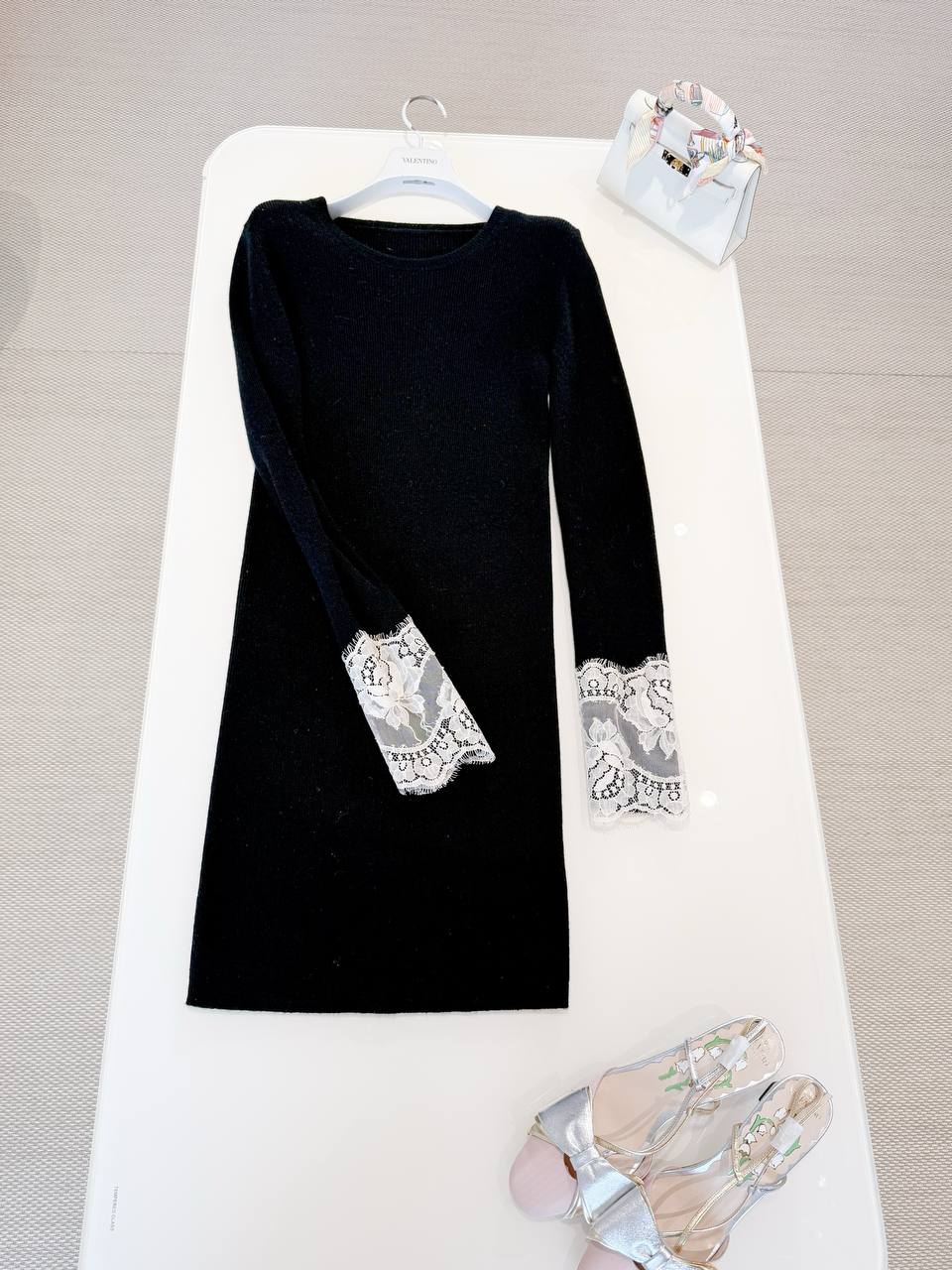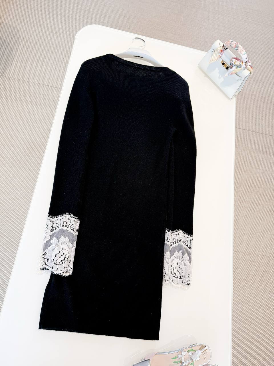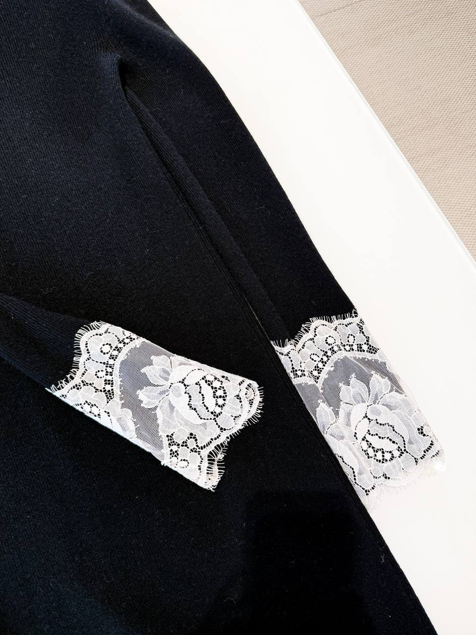 Рукава: Длинные прямые рукава делают платье более формальным и подходят для разных сезонов. Ключевым элементом являются кружевные манжеты, которые добавляют романтичности и изысканности. Кружево с цветочным мотивом и фигурной окантовкой создаёт интересный контраст с основным чёрным полотном платья.