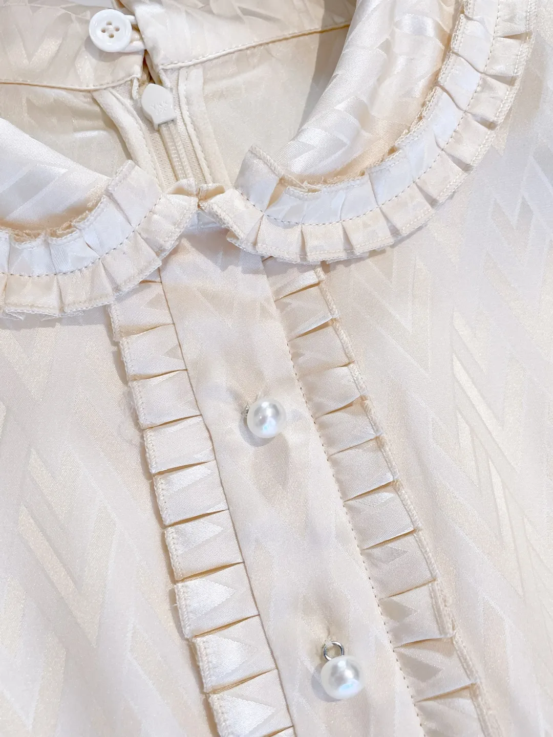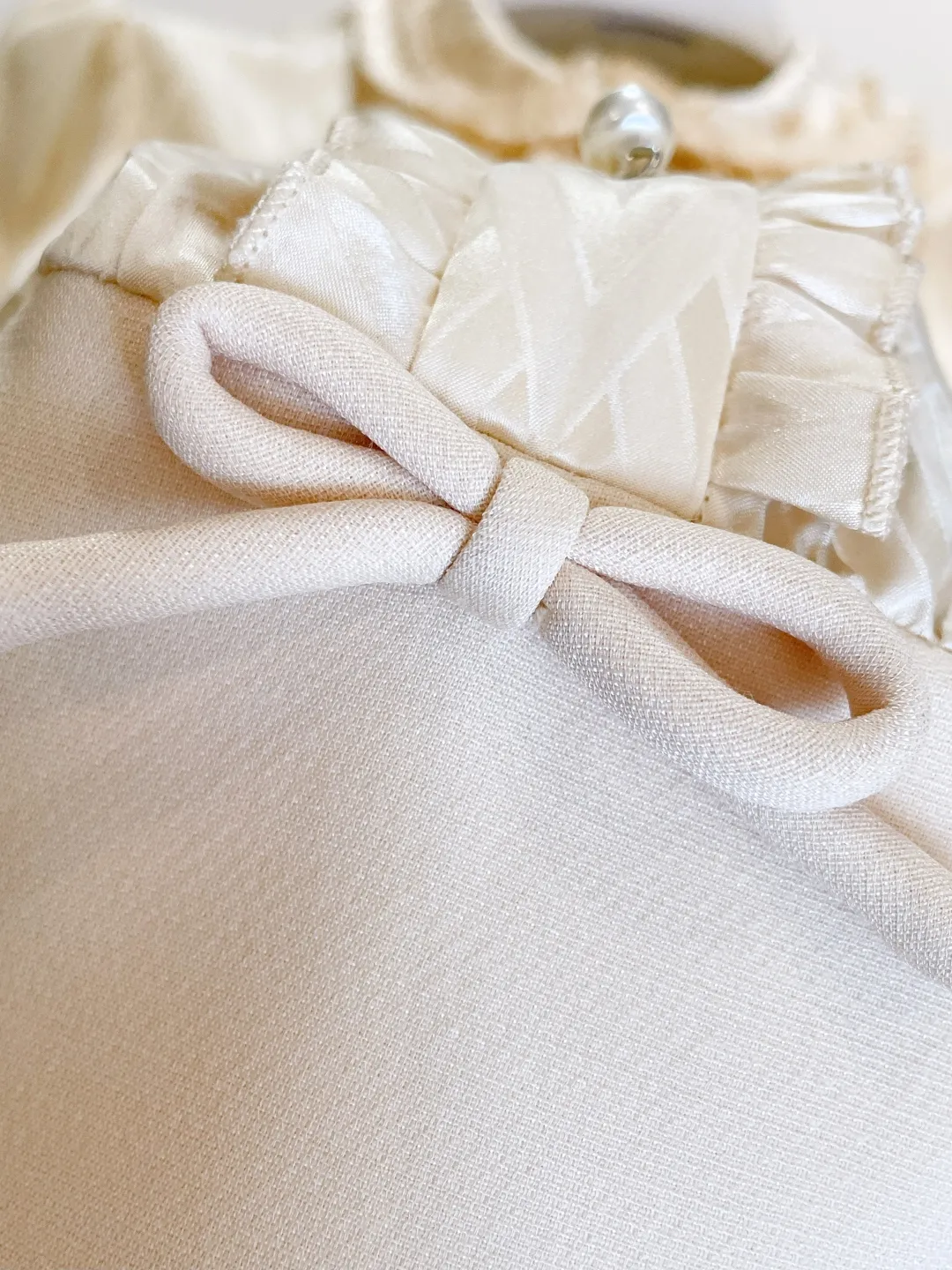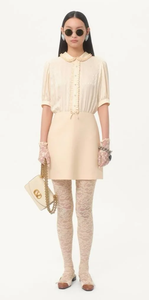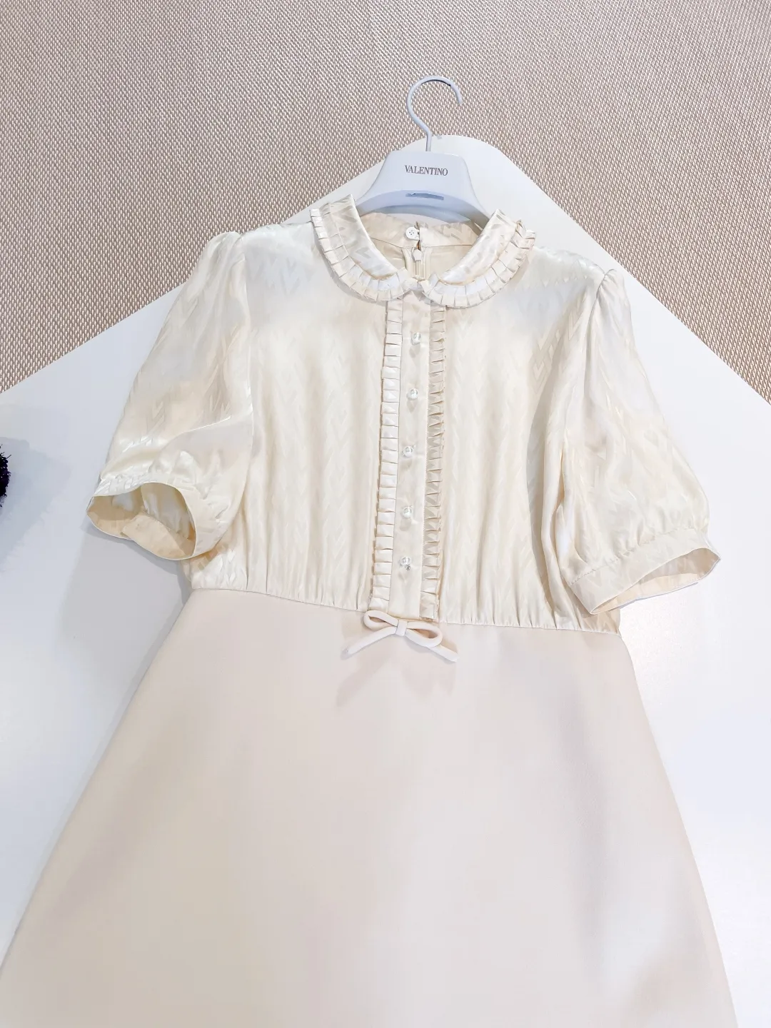 Очаровательное жаккардовое атласное платье, идеально подходящее для весеннего и летнего сезона. Это платье излучает французский изыск и нежную красоту. Выполненное из роскошного сочетания шелка и шерсти Crepe Couture, оно обладает изысканной текстурой и струящимся силуэтом. Особого шарма платью добавляет короткая планка с лацканами в стиле бэби-долл, украшенная вертикальным кружевом, создавая игривый и романтичный вид. Высокая линия талии акцентирована объемным бантом, придающим платью выразительность и подчеркивающим фигуру.