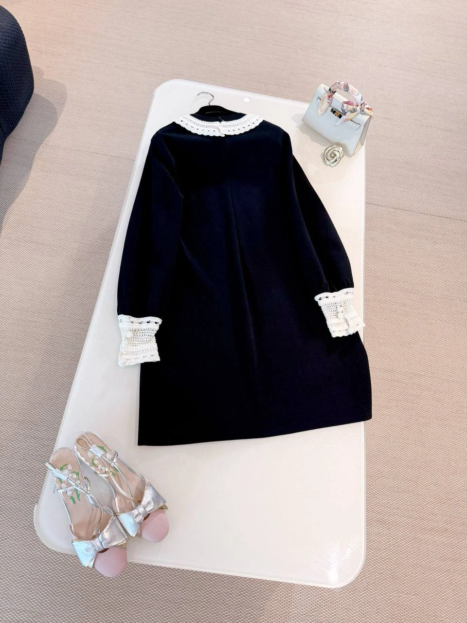 Рукава: Длинные, слегка объёмные рукава с белой кружевной отделкой на манжетах и пуговицами-жемчужинами. Эти детали придают платью особую элегантность и делают его подходящим для различных мероприятий — от официальных до менее формальных.