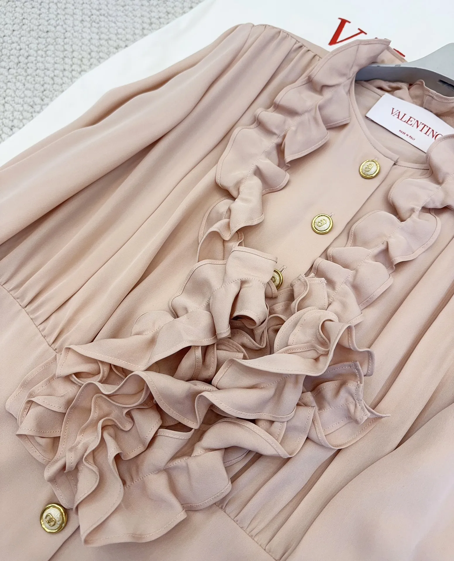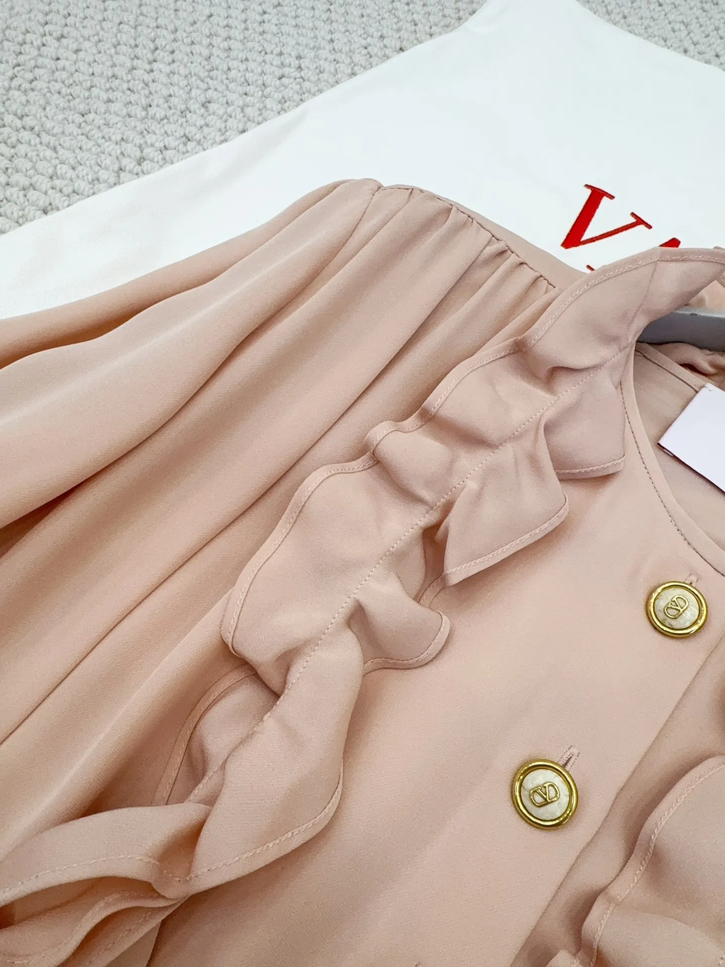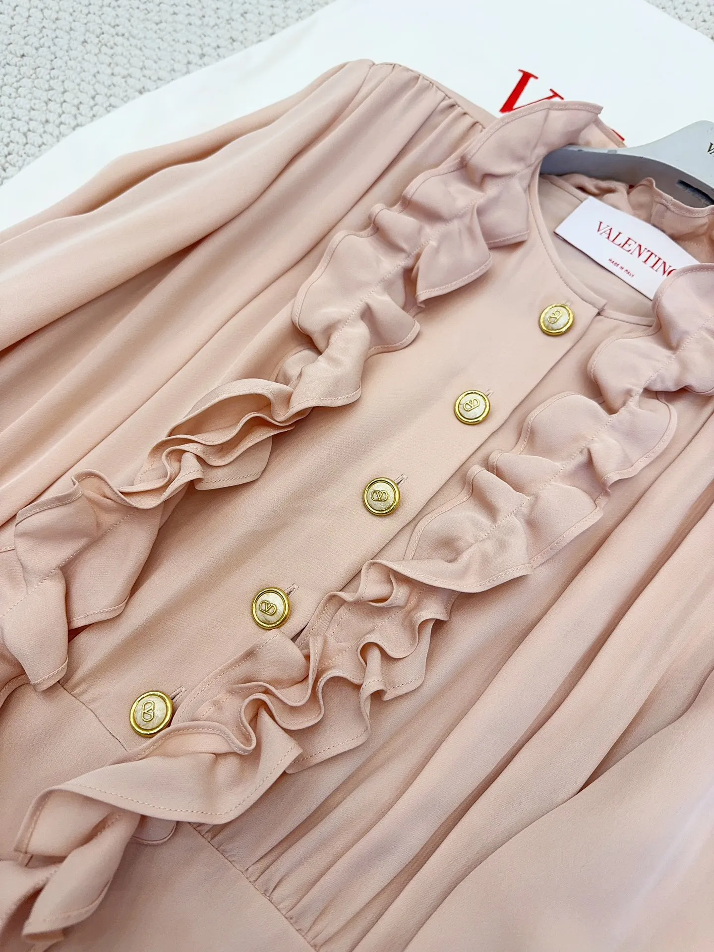 Новое шелковое платье Valentino 2025 выглядит поистине изумительно. Его романтичный дизайн в нежно-белом и нюдовом розовом цветах сочетает в себе элегантность и оригинальность. Оборки из лент и по подолу добавляют изысканности и динамики, а великолепные пуговицы акцентируют внимание на деталях. Такой стиль, вдохновленный эпохой Возрождения, прекрасно передает дух времени, оставаясь при этом современным. Платье выглядит одновременно сложным и гармоничным, что позволяет создать впечатляющий и утонченный образ.