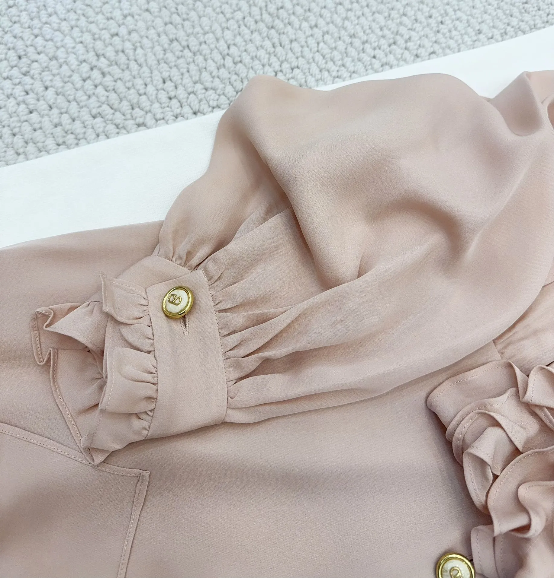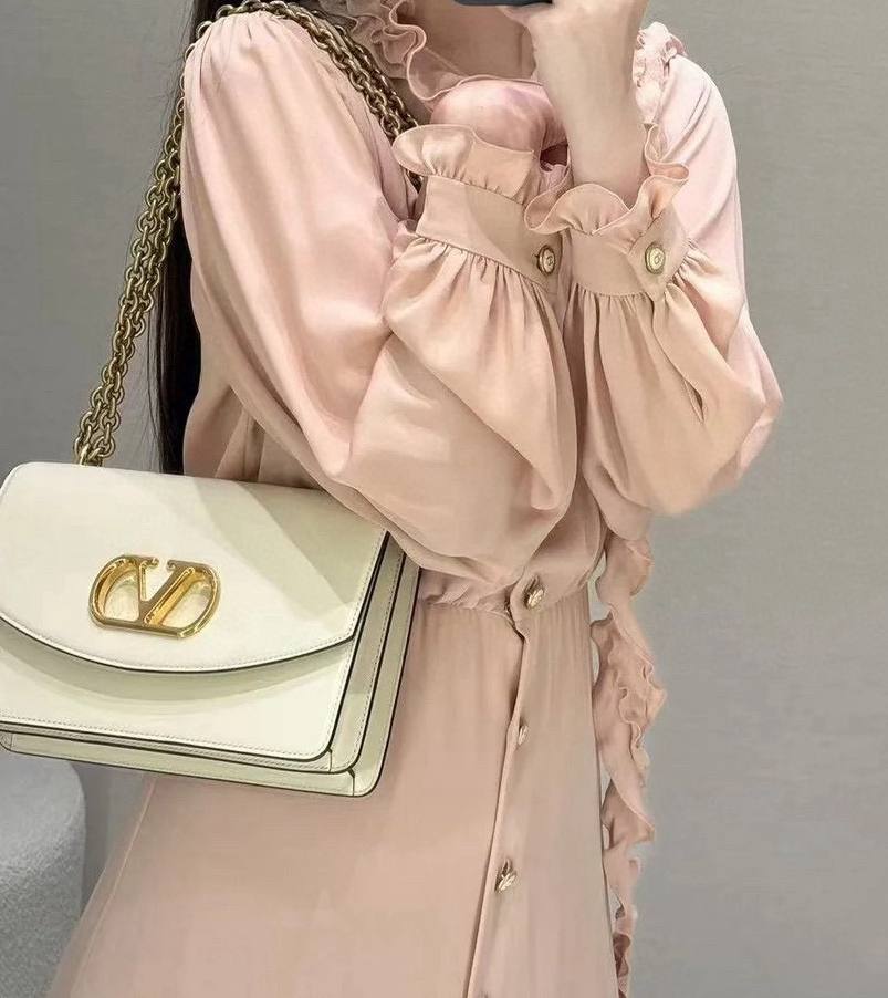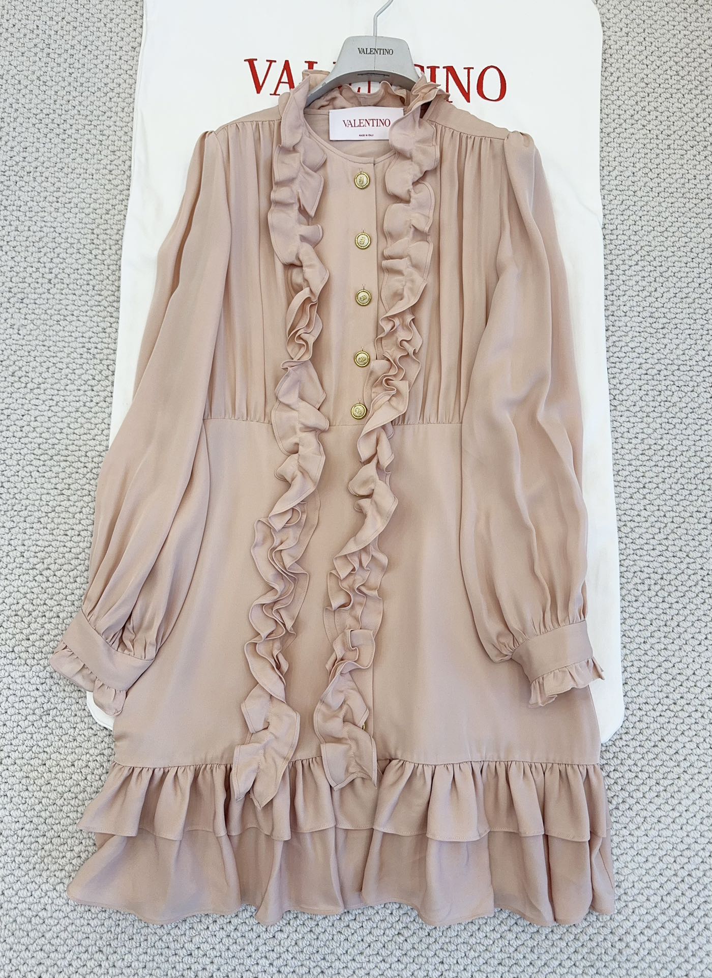 Новое шелковое платье Valentino 2025 выглядит поистине изумительно. Его романтичный дизайн в нежно-белом и нюдовом розовом цветах сочетает в себе элегантность и оригинальность. Оборки из лент и по подолу добавляют изысканности и динамики, а великолепные пуговицы акцентируют внимание на деталях. Такой стиль, вдохновленный эпохой Возрождения, прекрасно передает дух времени, оставаясь при этом современным. Платье выглядит одновременно сложным и гармоничным, что позволяет создать впечатляющий и утонченный образ.