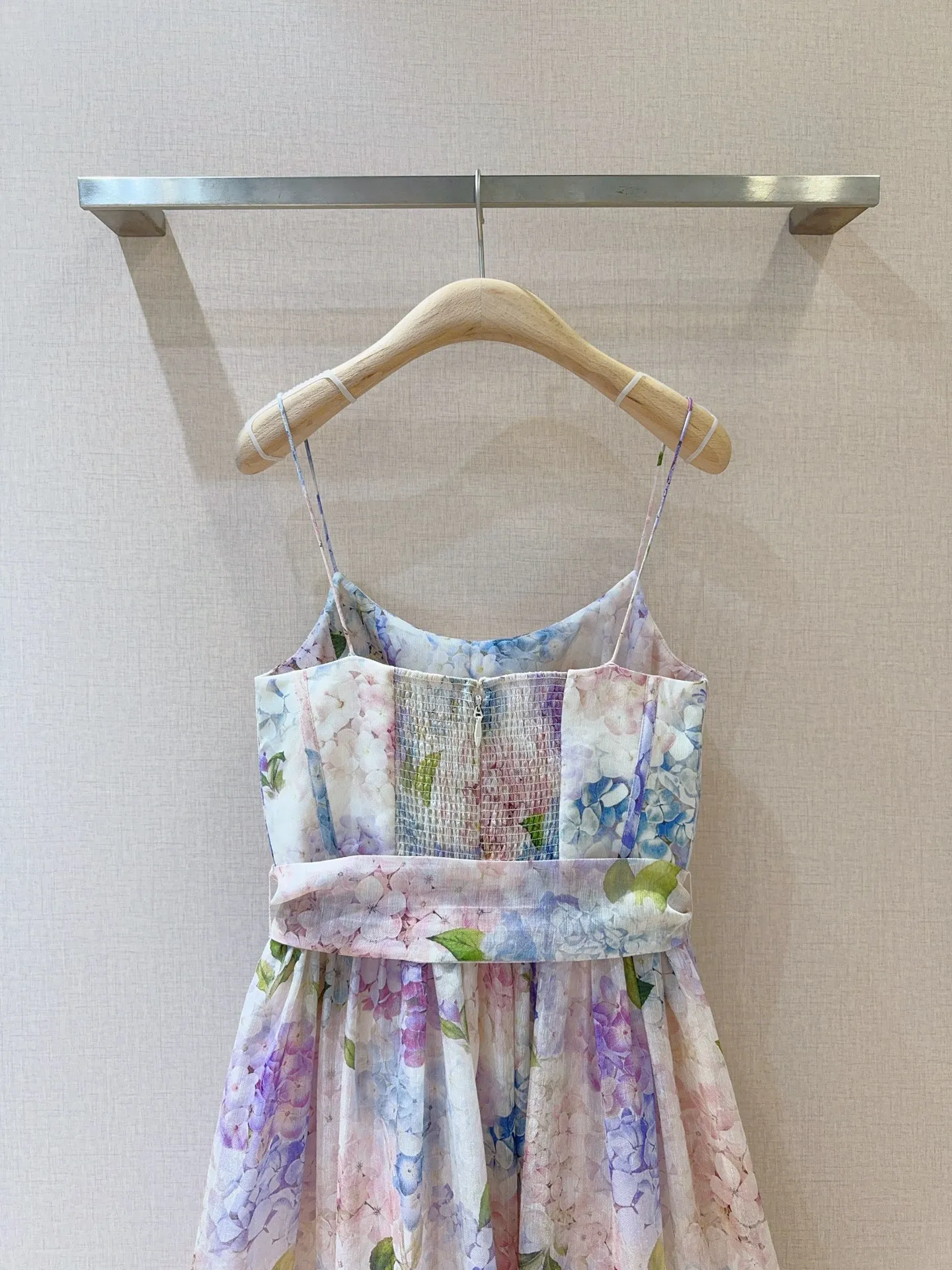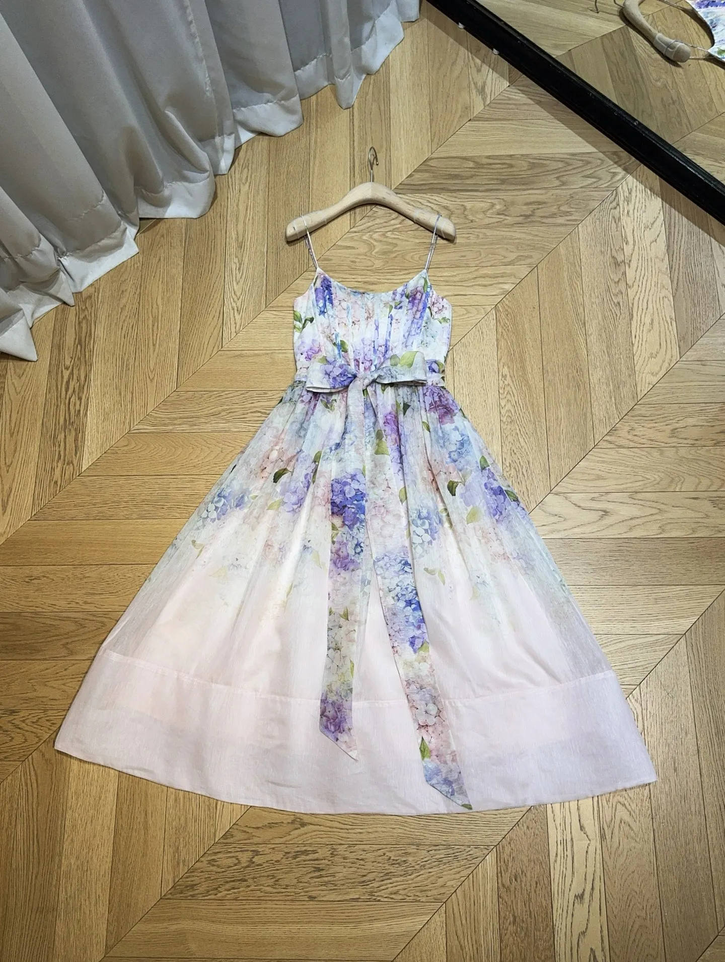 Аккуратный лиф на тонких бретелях украшен деликатными складками, а подчёркнутая линия талии и широкий пояс из основной ткани создают изящный силуэт. Расклешённая юбка миди с плавным переходом оттенков придаёт образу особую лёгкость и воздушность. Идеальный выбор для летних мероприятий, прогулок и приёма гостей.