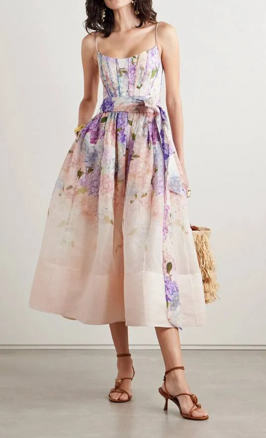 Лёгкое и женственное платье Zimmermann, выполненное из изысканного сочетания шёлка и льна. Нежный цветочный принт в пастельных тонах подчёркивает романтичный характер изделия.