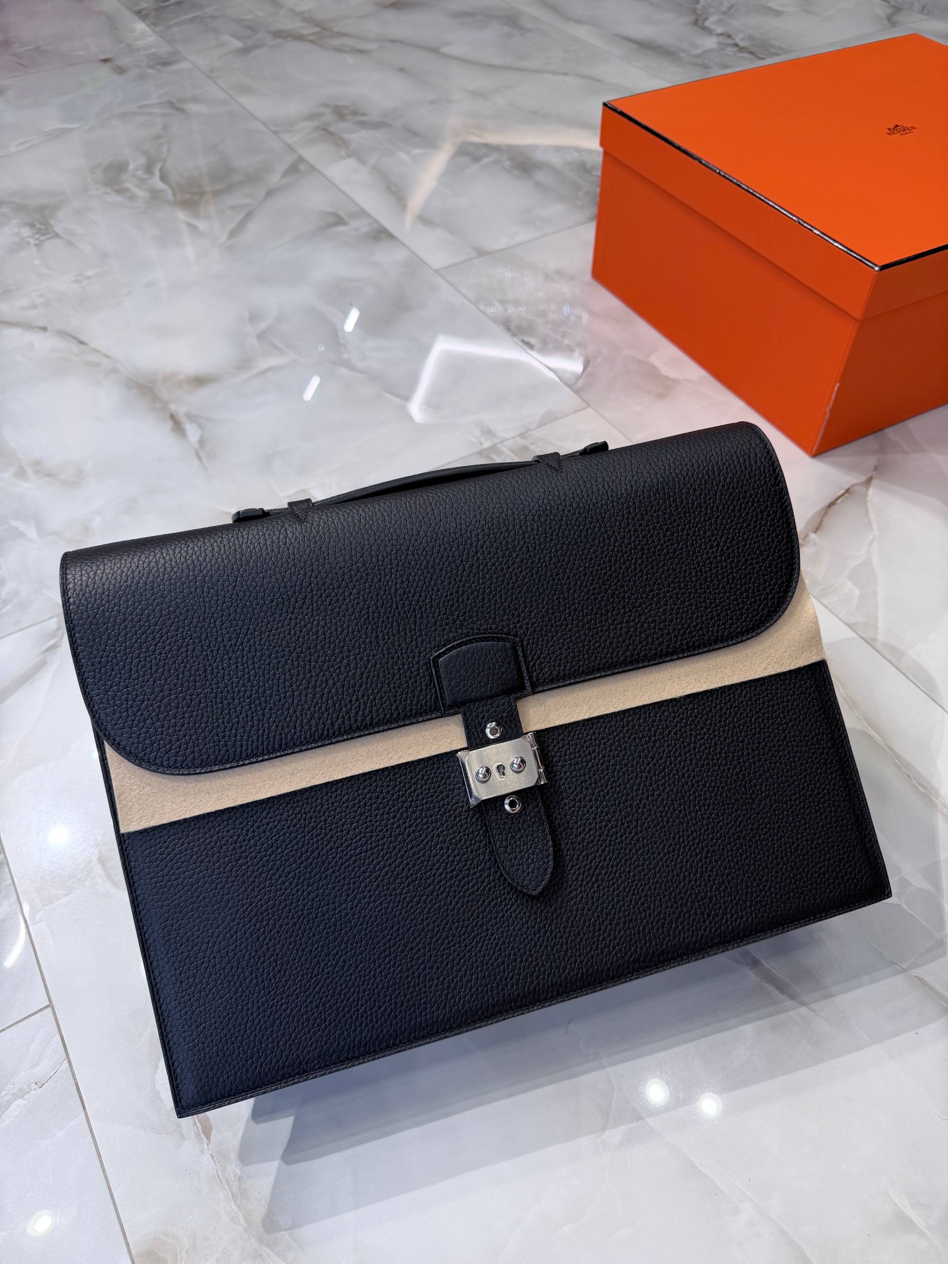 Строгий и элегантный мужской портфель из зернистой кожи Togo в классическом черном цвете с контрастной бежевой вставкой под клапаном. Фирменный флэп‑дизайн с ремешком и металлической застёжкой, прочная ручка для переноса — идеальный выбор для делового образа и ежедневного использования.