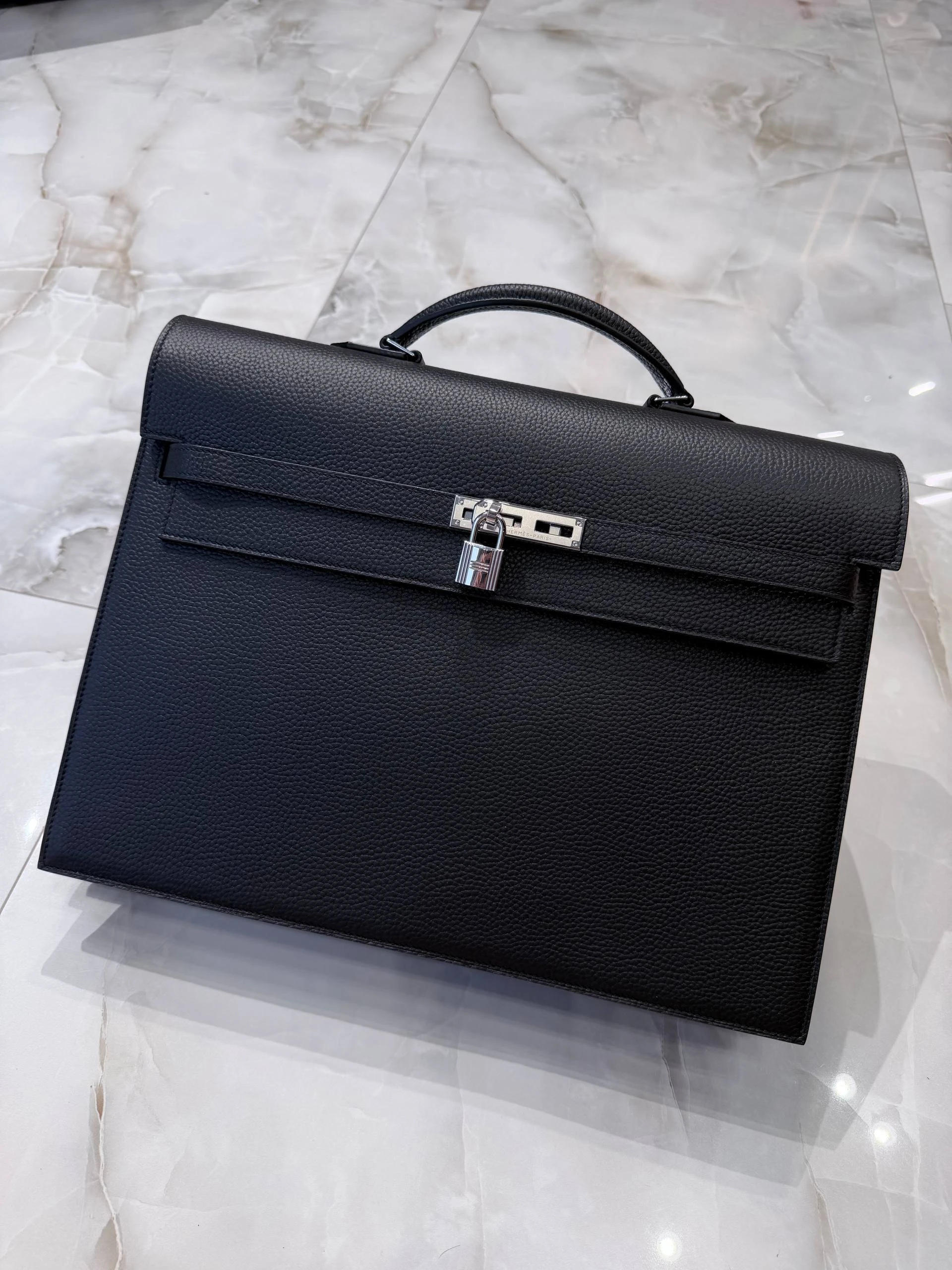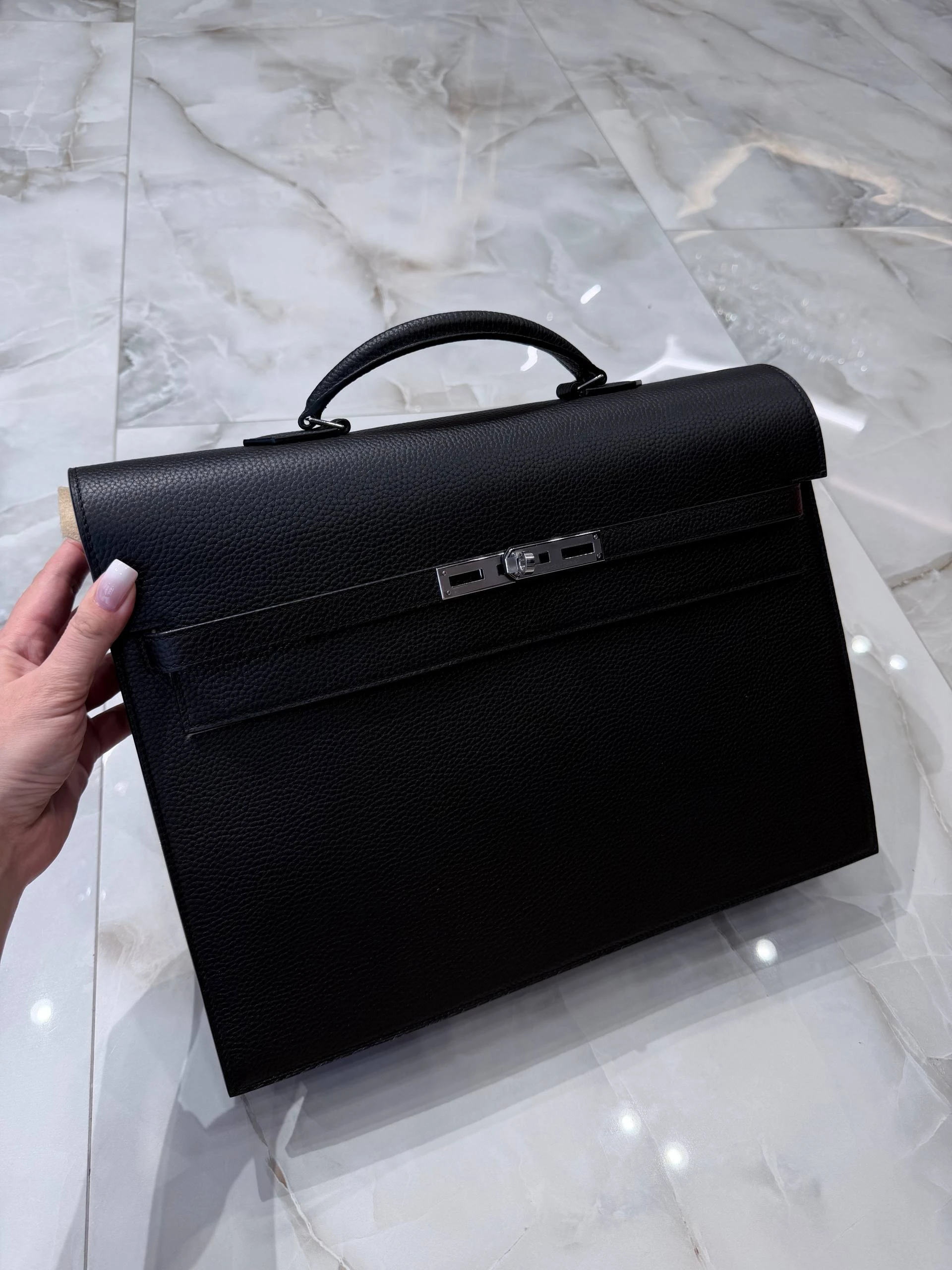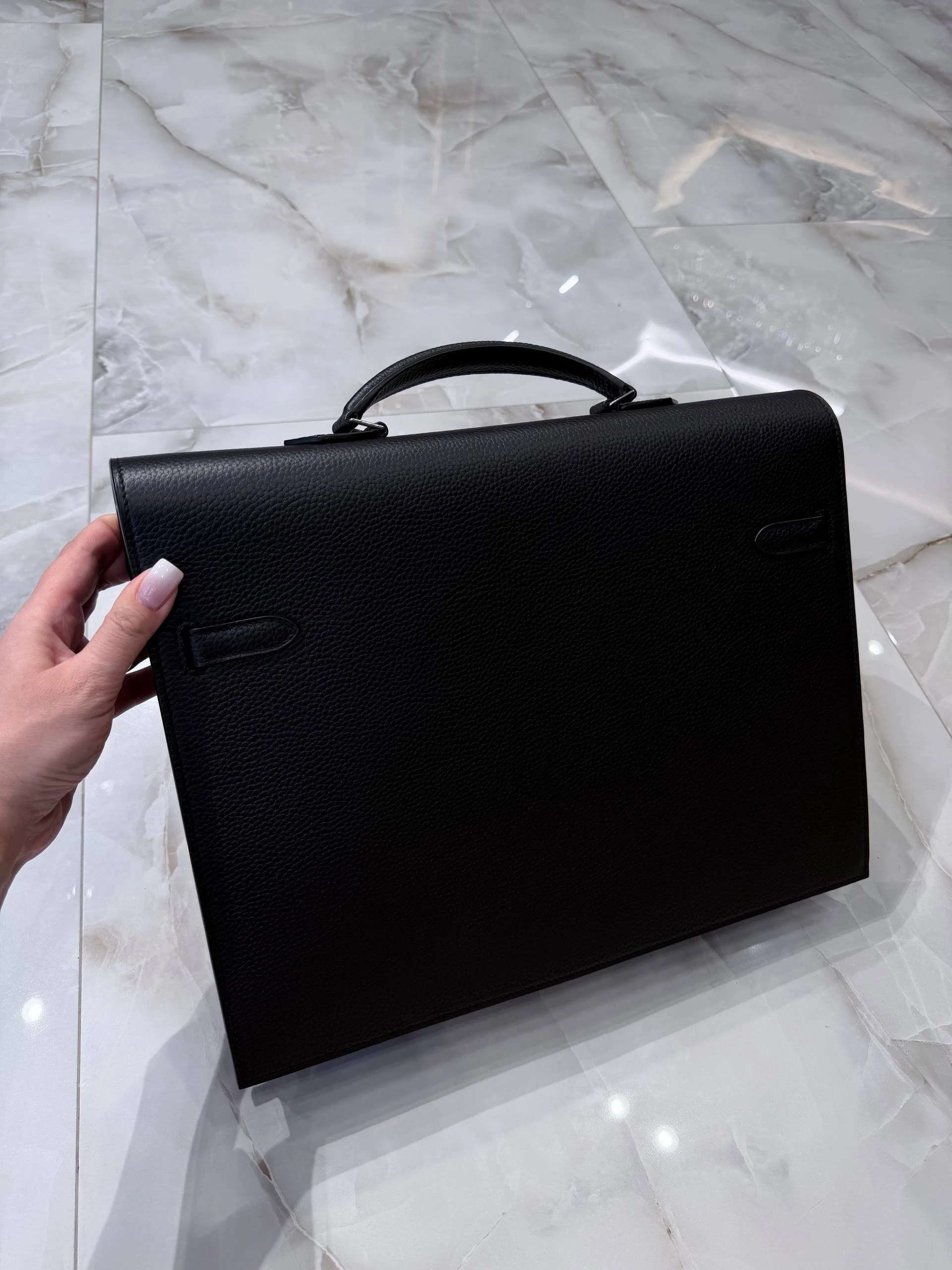 Элегантный мужской портфель из зернистой кожи Togo глубокого черного цвета — сочетание традиционного мастерства и современного минимализма. Идеален для деловых встреч и повседневной офисной жизни: сдержанный силуэт, надежная фурнитура серебристого тона и продуманная внутренняя организация для документов и гаджетов.